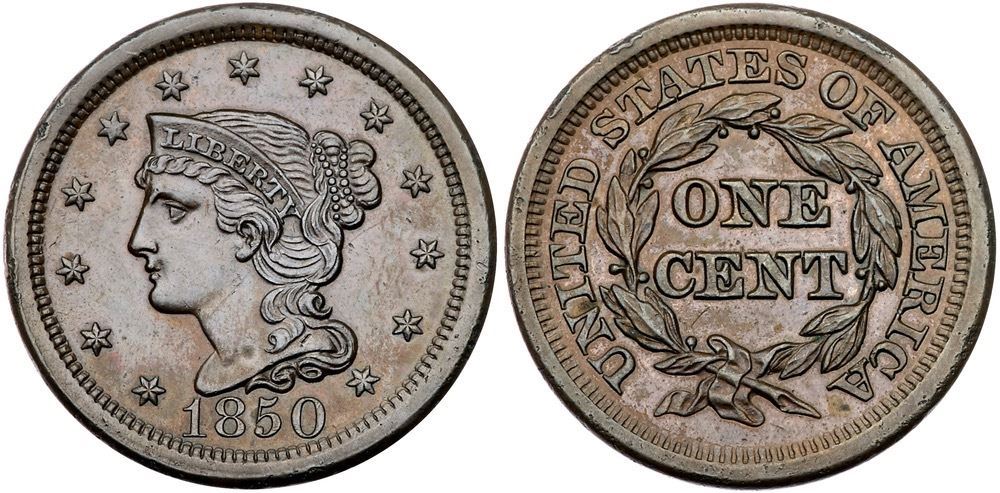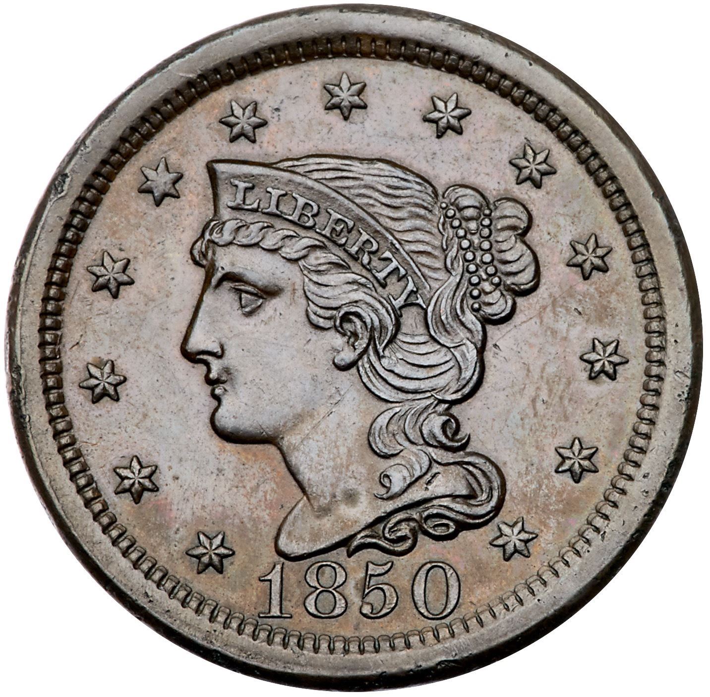 1850 N-26 R5- EF45Ten points sharper but there is a diagonal scratch high on the neck and a few barely visible rim bruises on both sides. Glossy chocolate brown with mint frost in the fields and protected areas. LDS, die state b. The die line at the dentils over the N in UNITED reaches only to the center of the letter.Pedigree: From the Fred H. Borcherdt Collection