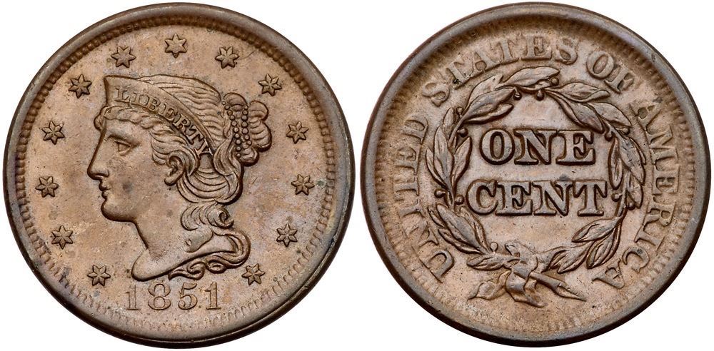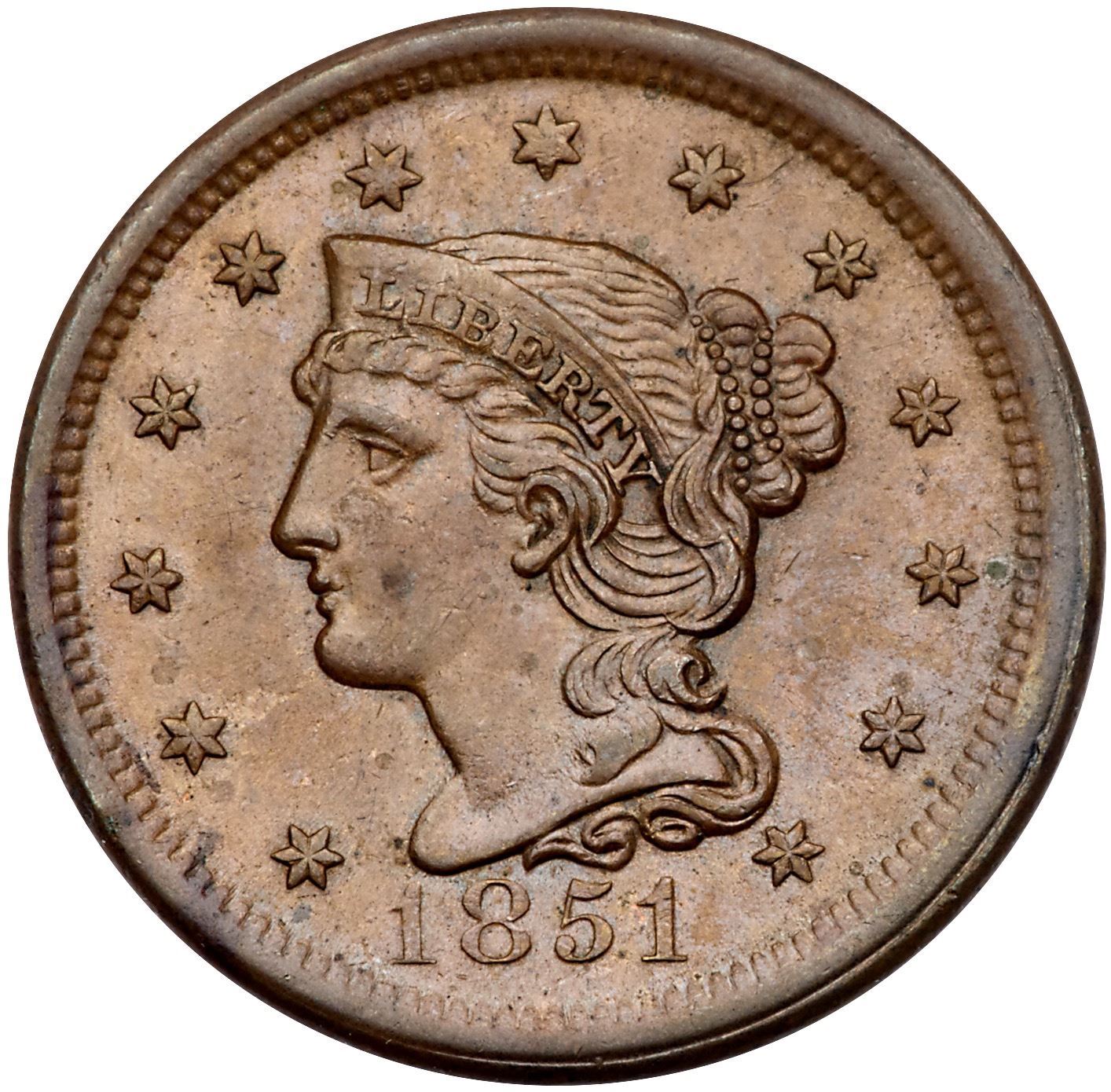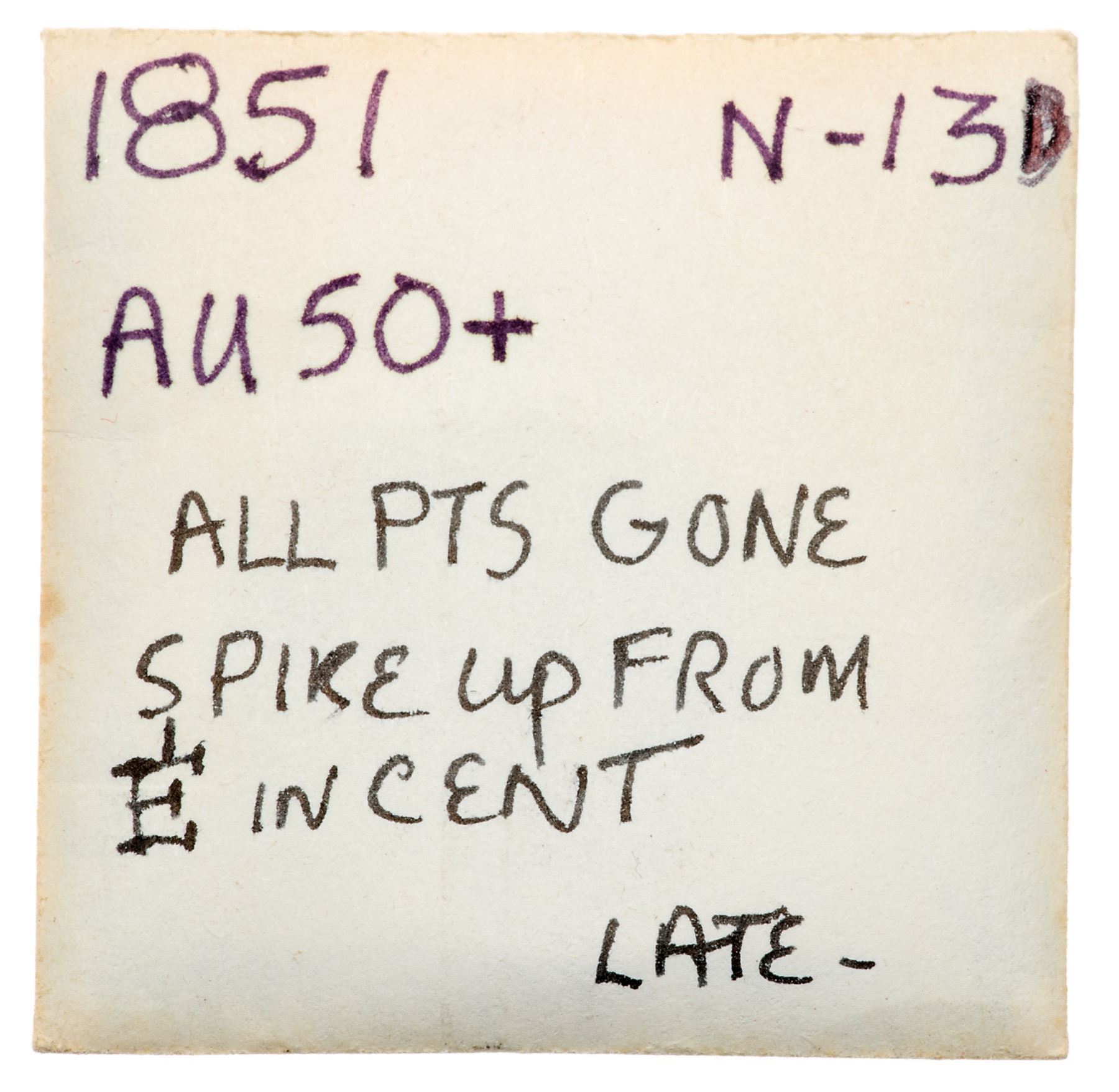 1851 N-13 R1 AU50Frosty light brown and tan with medium brown on the highpoints. Mint luster covers the fields and protected areas and the only notable defect is a tiny low spot right of star 2 (as struck). LDS, die state d (Reiver's old #43).Pedigree: From the Fred H. Borcherdt Collection