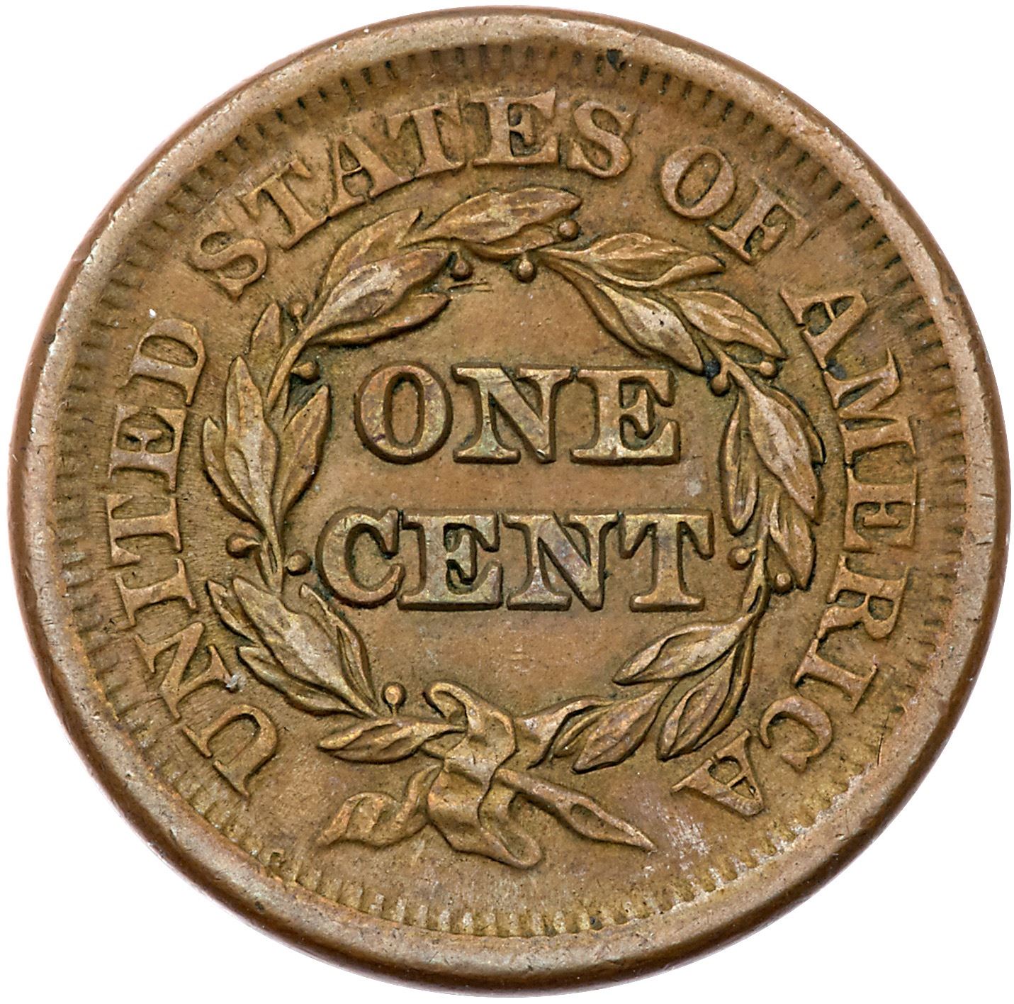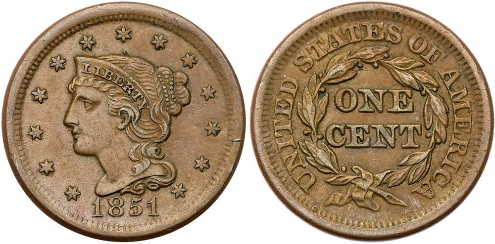 1851 N-22 R4+ EF40+Slightly sharper but there is a thin nick on the edge right of star 11 and a tiny prick near the hair under star 7. Otherwise essentially flawless with light friction on the devices and very nice eye appeal. Frosty light brown and olive. MDS, die state b. The fields are flowlined but the diagonal die lines from the main curl are still visible.Pedigree: Ex Rodney C. Burress-Fred H. Borcherdt Collection (includes the Burress sales envelope)