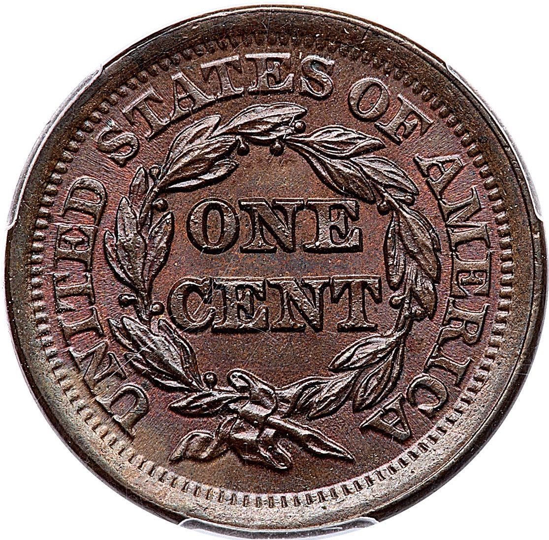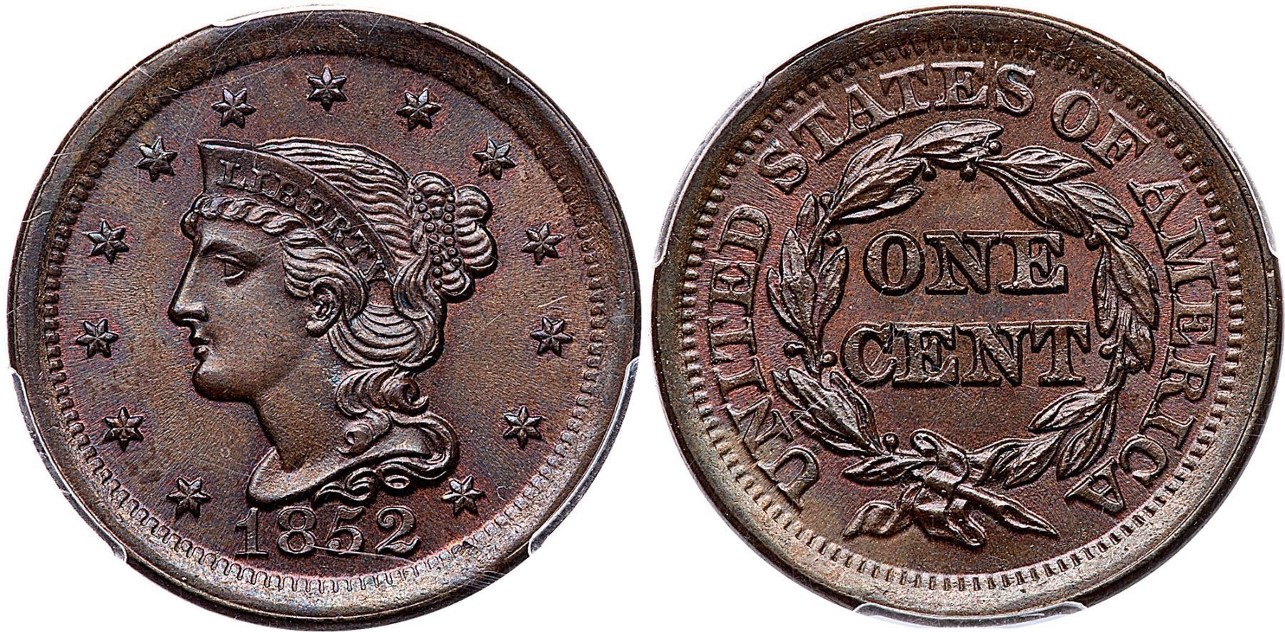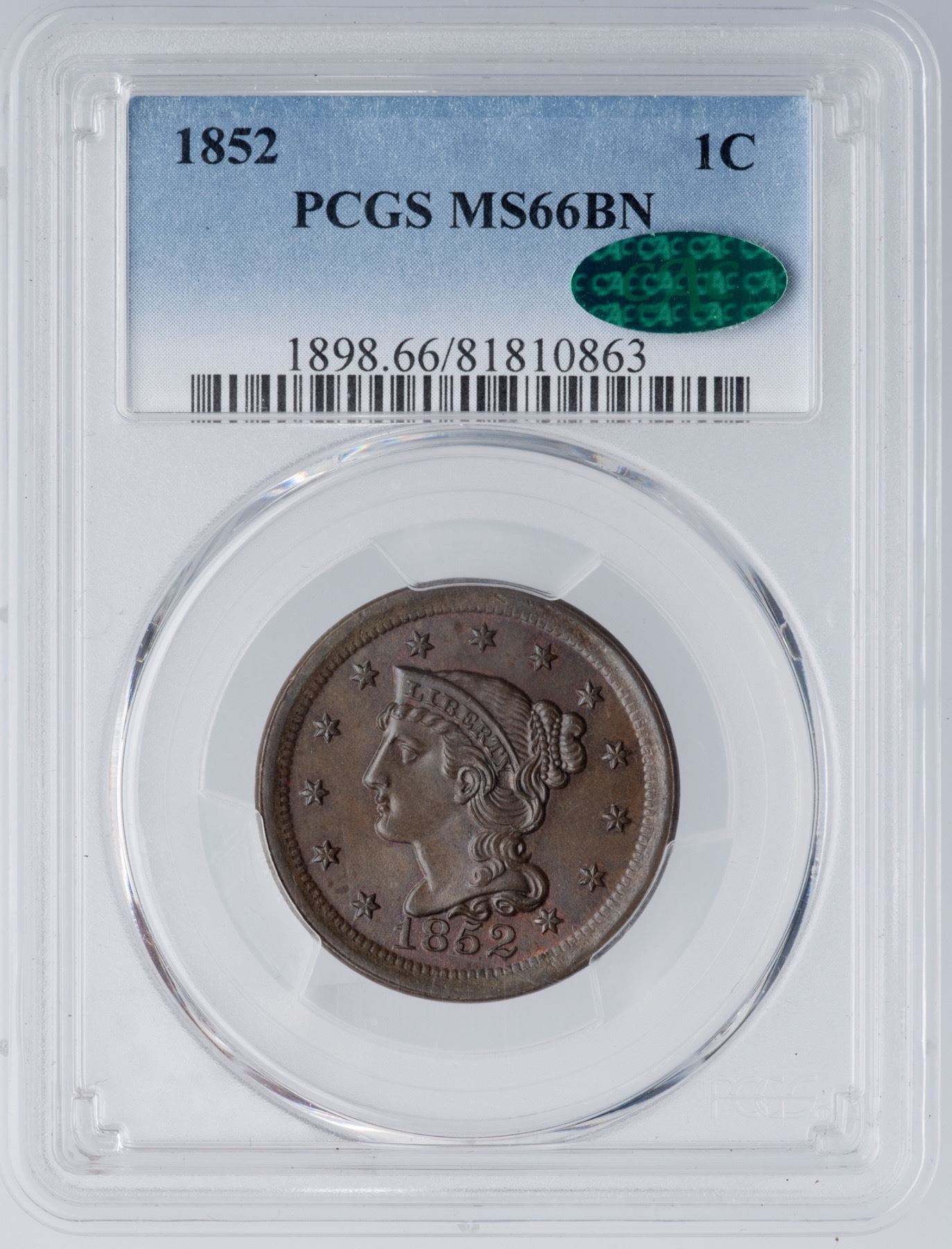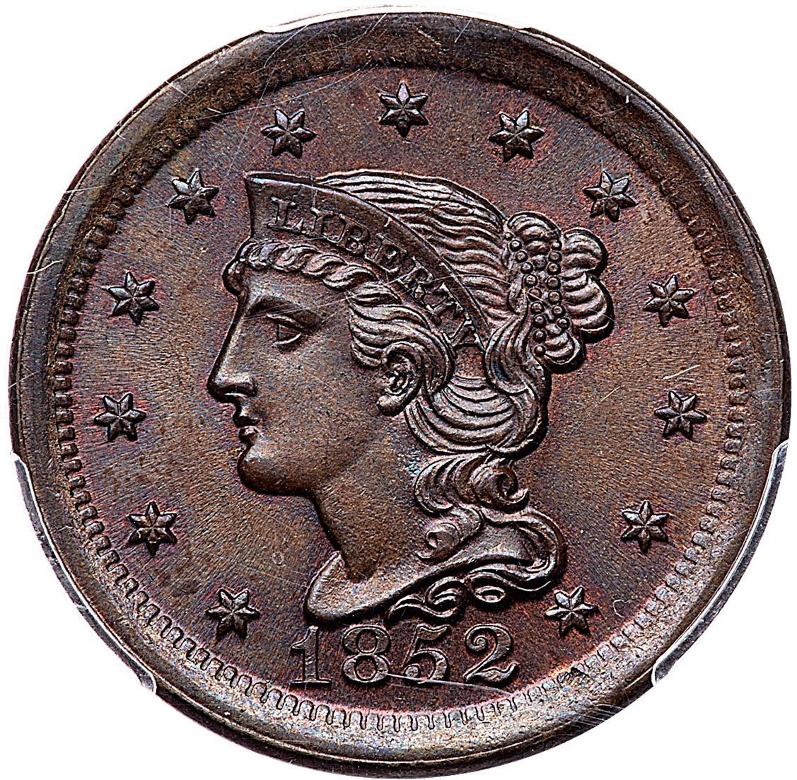 1852 N-16 R-1 PCGS MS66BN CACAttractive light olive with underlying faded mint red and subtle bluish steel overtones. The only marks are a pair of faint, tiny pin scratches, one right of star 4 and another behind the hair at the neck that blend in well. Frosty cartwheel luster covers the surfaces. Our grade is MS63. CAC certified.Certificate Number: Pedigree: Ex; Phil Davis