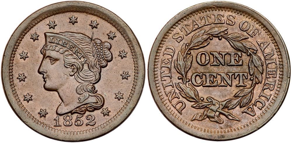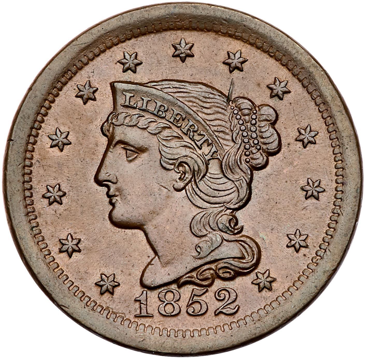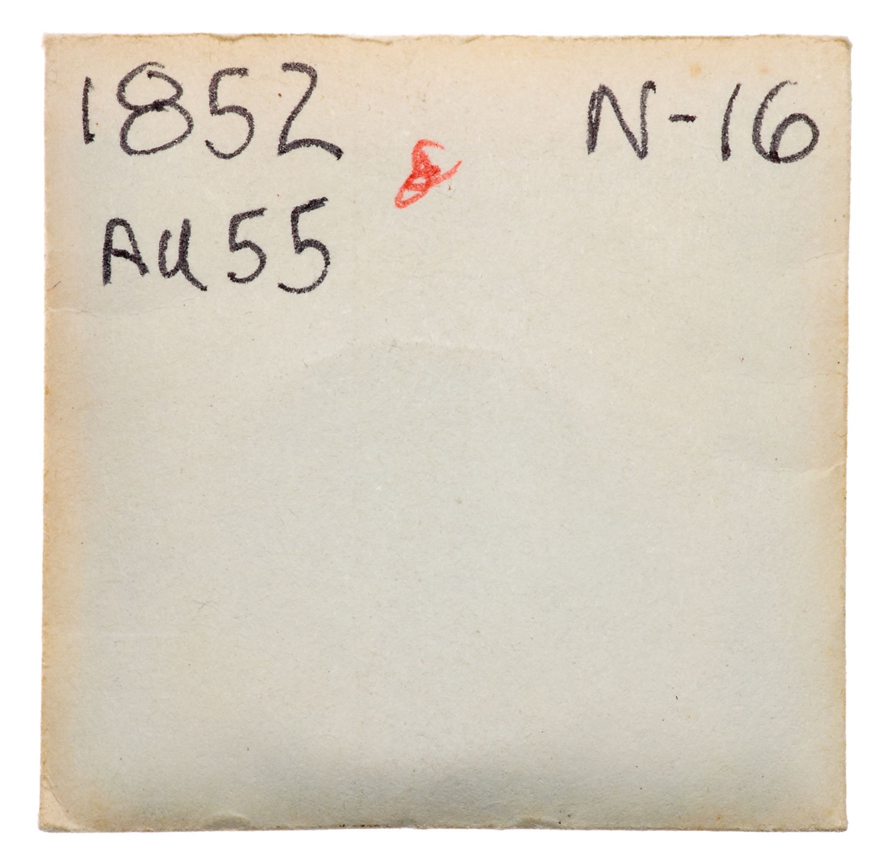1852 N-16 R1 AU50Five points sharper but there is a dig or planchet void under star 8. Otherwise choice with very light friction on the highpoints. Glossy light brown with frost covering the fields and protected areas. E-MDS, die state a.Pedigree: From the Fred H. Borcherdt Collection
