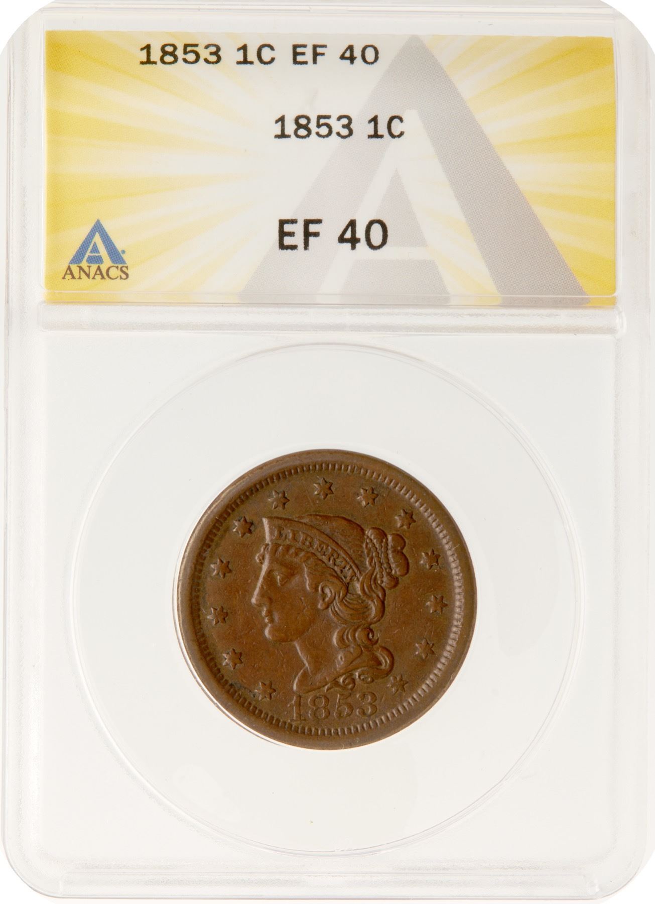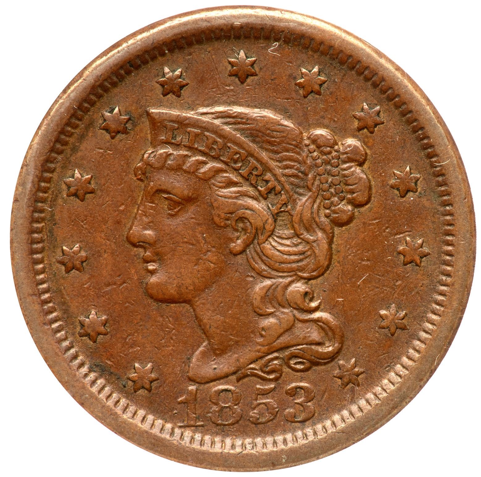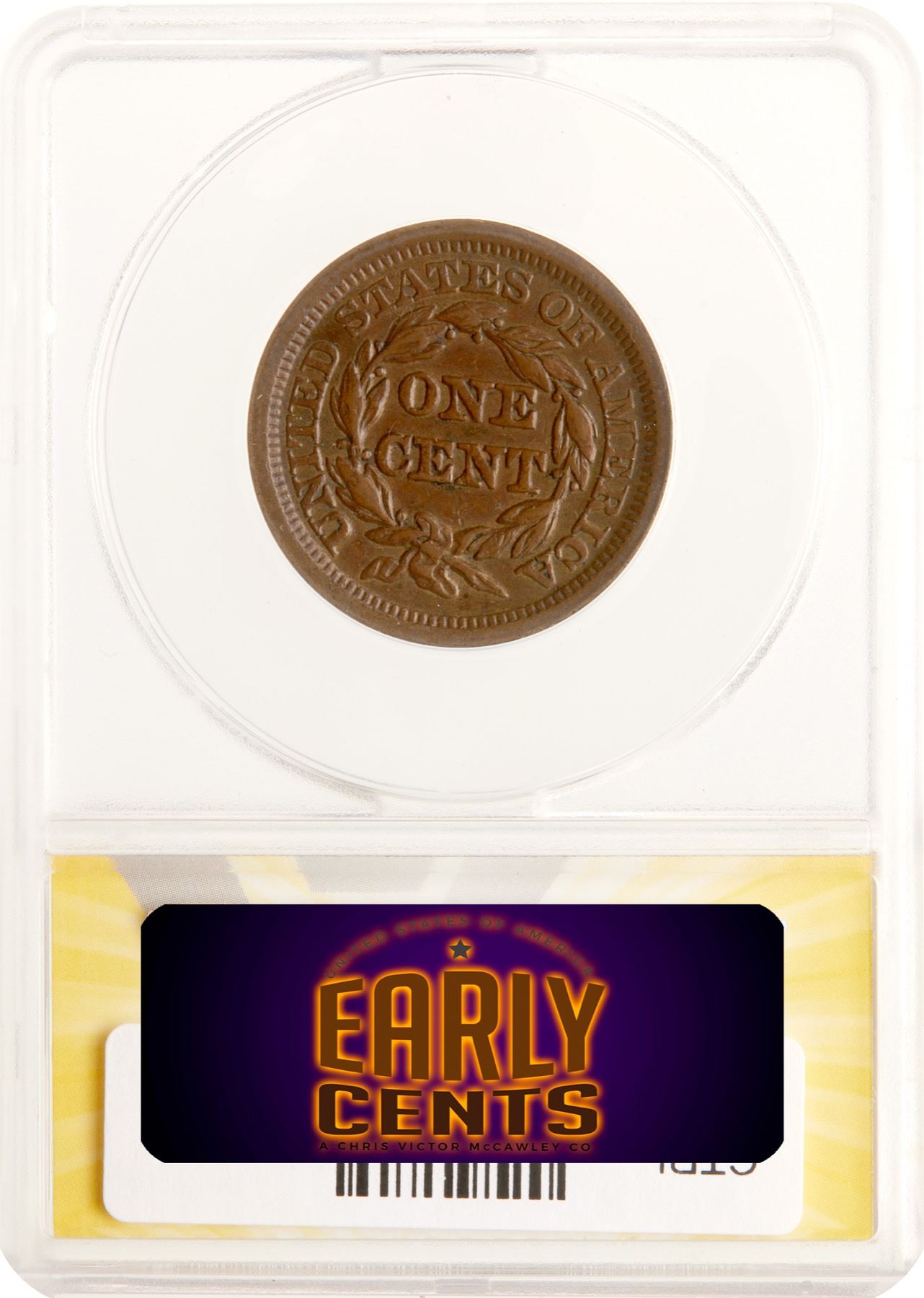 Glossy light chocolate brown. No defects, just lightly worn with trivial contact marks. M-LDS, die state b. The earlier die clashmarks are gone but there are no rim cud breaks. A nice mid-grade cent. Our grade is VF30.
