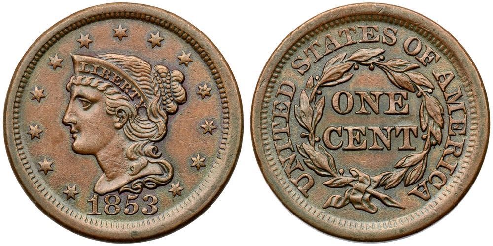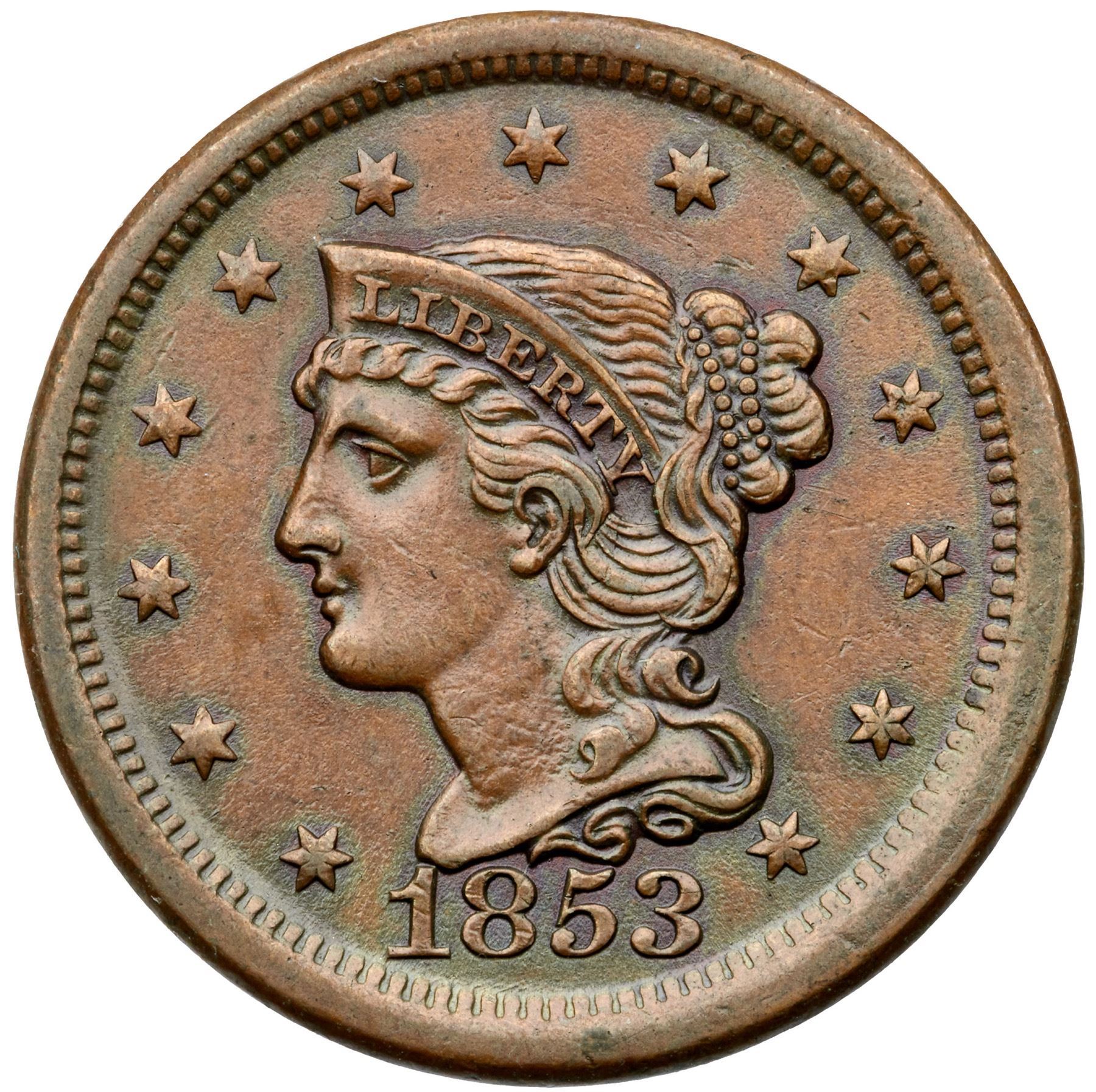 Choice glossy medium brown and light olive. Flowline frost covers the protected areas and there are no notable marks. EDS, die state a, with die lines from the dentils below the 18 and others over U and ITE. The lower half of the neck is covered with a shallow low spot (caused by debris on the die).