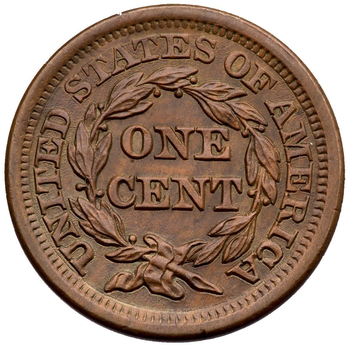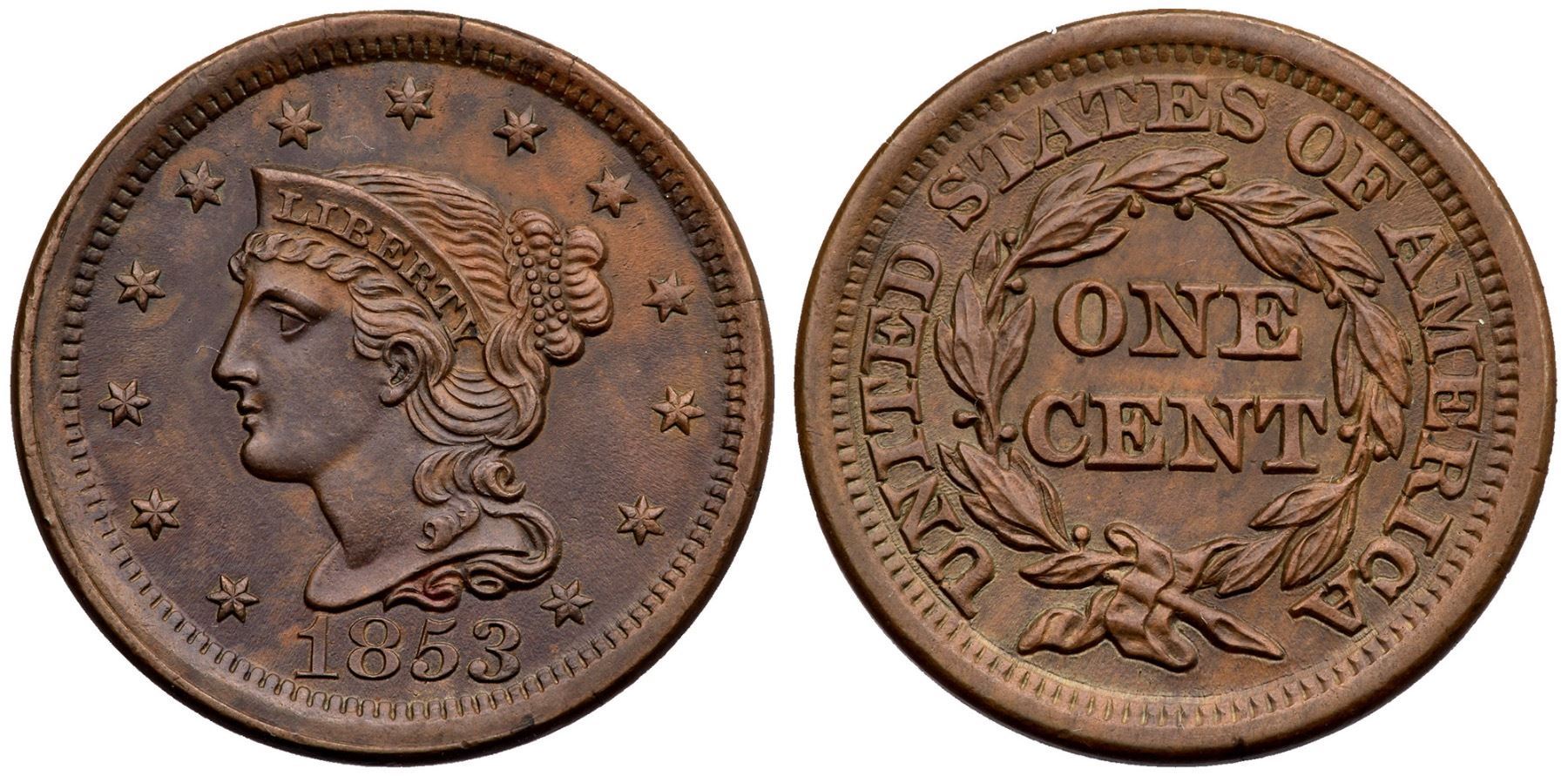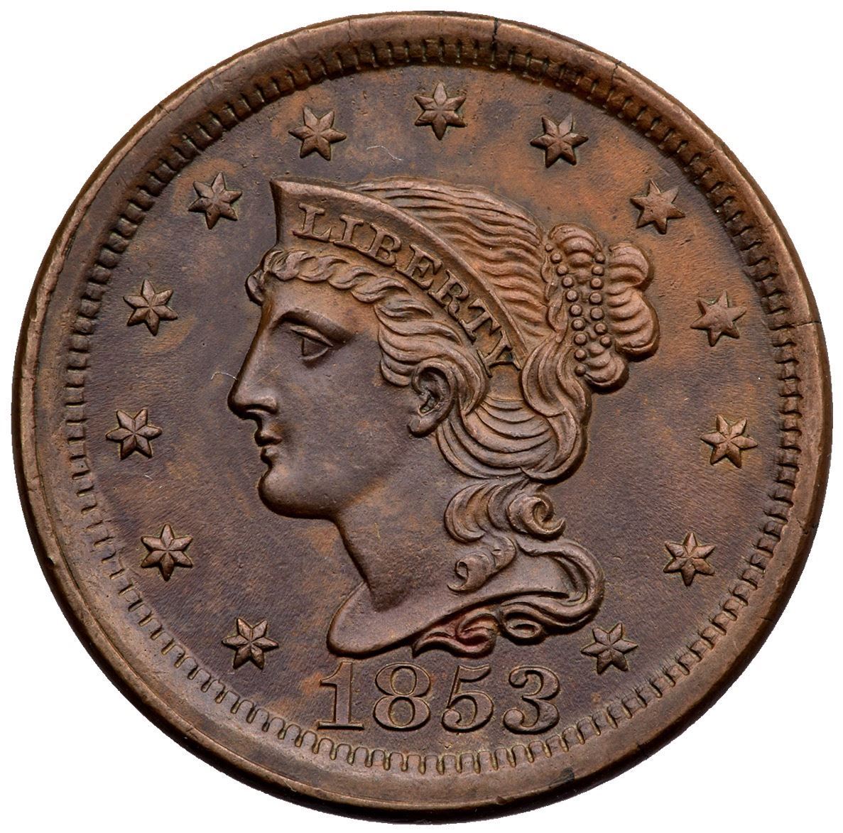 1853 N-6 R-1 MS60Mix of tan and dark browns on the obverse, while the reverse is light chocolate with subtle olive tones. There is a small mark on the earlobe, and a couple thin planchet cracks on the edge on either side of star 8. Mint frost covers the protected areas. E-MDS.Certificate Number: Pedigree: Ex; Tomy Reynolds EAC 2014 - William Schwartz