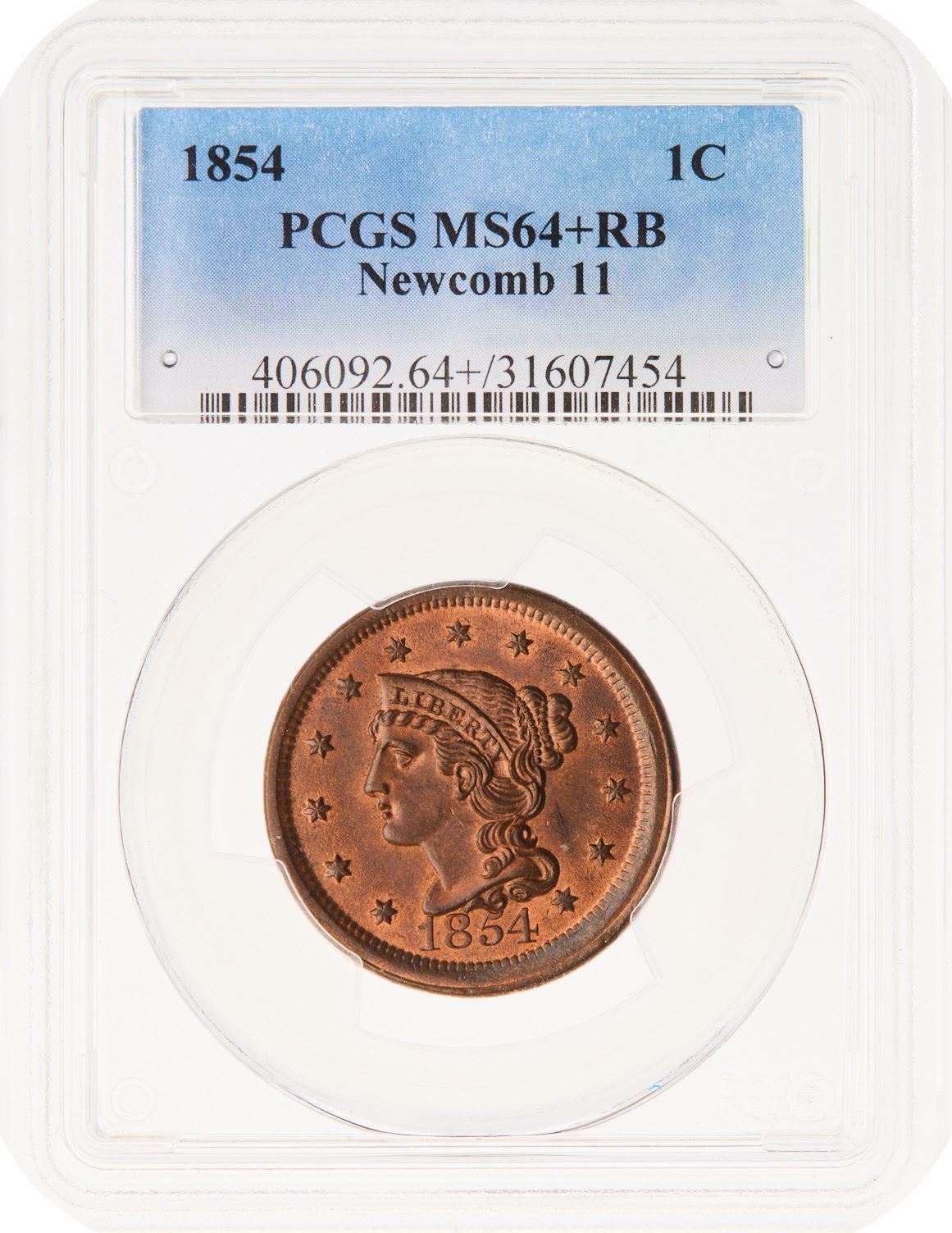 Mint red fading to steel brown with slightly more than a third of the mint color remaining. The surfaces are quite attractive, satiny and nearly free of marks. The best identifying marks are two tiny ticks under the earlobe, a tiny struck-through line running through the R in LIBERTY (as struck), and a minor swipe of darker toning between the main curl and star 12. E-MDS, die state b. The fields are covered with fine radial die flowlines including a very light flowline down from the right base of the 4. The details at the ear are sharply struck, a big plus for this variety. Our grade is MS64, tied for CC#2 in the Grellman census. The attribution is noted on the PCGS label.