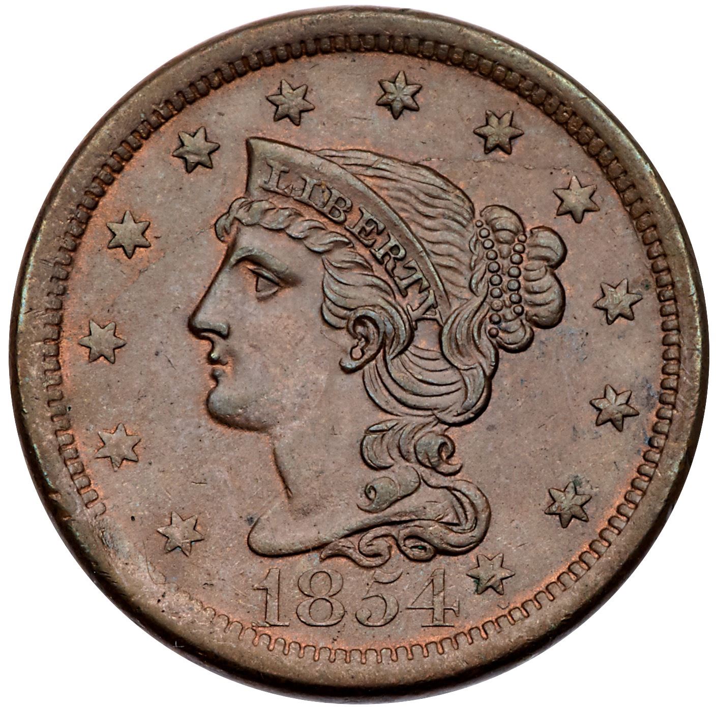 1854 N-19 R3 AU58Glossy light bluish steel brown with traces of mellowed mint red on both sides. Satiny with mint luster in the fields and protected areas. This cent has mint state eye appeal but there is a hint of rub on the highest points of the devices. The notable defects are a very shallow low spot on the jaw (caused by crud on the die), a small nick in the dentils over the first T in STATES, and a tiny diagonal nick under the E in CENT. The marks are trivial but can help identify this cent. MDS, die state b, with the usually seen fine die crack that arcs across the upper part of the obverse. Our grade is AU58, CC#13 in the Grellman census. Removed from an NGC holder graded MS64BN (NGC label #621750-002 included, and it shows the attribution).Certificate Number: Pedigree: Ex 2000 ANA Convention bourse-Phyllis Thompson, McCawley & Grellman Auctions/Goldbergs 1/31/2010:763-Fred H. Borcherdt Collection
