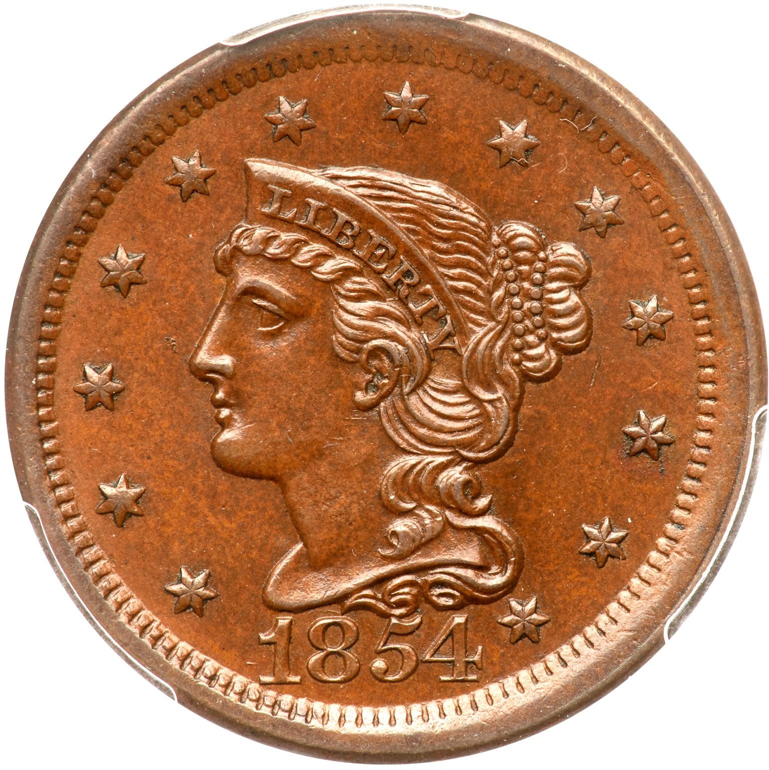 Very attractive glossy medium brown and light chocolate. No spots or stains, and the only marks are a tiny pinprick off the end of the nose and a thin nick under the right edge of the hair bun. Neither mark catches your eye and this cent has great eye appeal. E-MDS, die state b early. The fine repunching above the 18 is clear and there is a doubled line of light die clashmarks over the left side of the O in ONE. Our grade is AU58 thanks to a hint of rub on the very highest points of the devices, but this cent has solid mint state eye appeal.