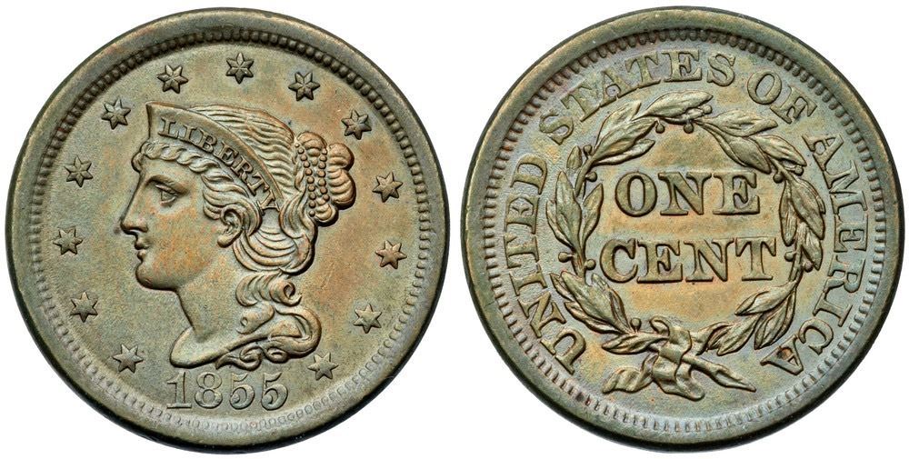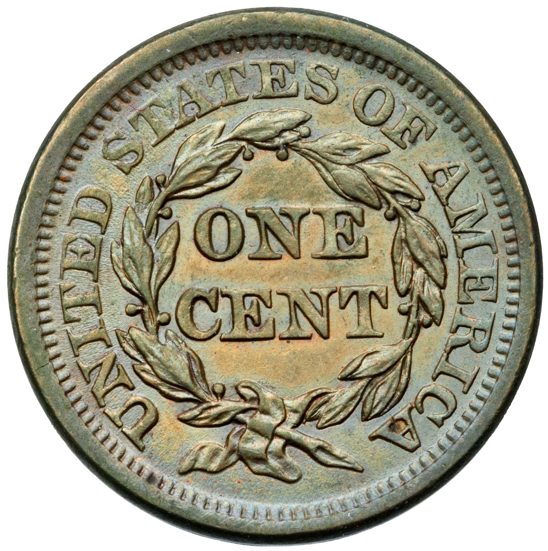 Close to mint state but cleaned, now frosty golden tan. There is a light diagonal nick in the field right of the inner curl and faint hairlines on both sides from the cleaning. LDS, die state b late. There is a die crack arcing on the rim from over the right top of the T in UNITED to ED to the rim halfway to the adjacent S. The area outside the crack is very slightly sunken consistent with a retained cud break. This is a new die state discovery. Now let's find one with the cud!