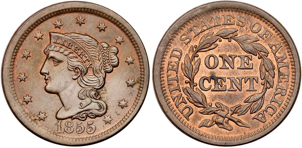 1855 N-6 R3 Upright 55 MS60+Lustrous light olive with 5% of the obverse and 50% of the reverse showing mint red. The red on the reverse is bright. A choice cent except for two nicks on the jawline and a spot of microscopic carbon at the left top of the E in CENT. Rare EDS, die state a, with a dull dash left from the base of the 1. Tied for CC#5 of the variety in the Grellman census but finest of the early die state.Certificate Number: Pedigree: From the Fred H. Borcherdt Collection