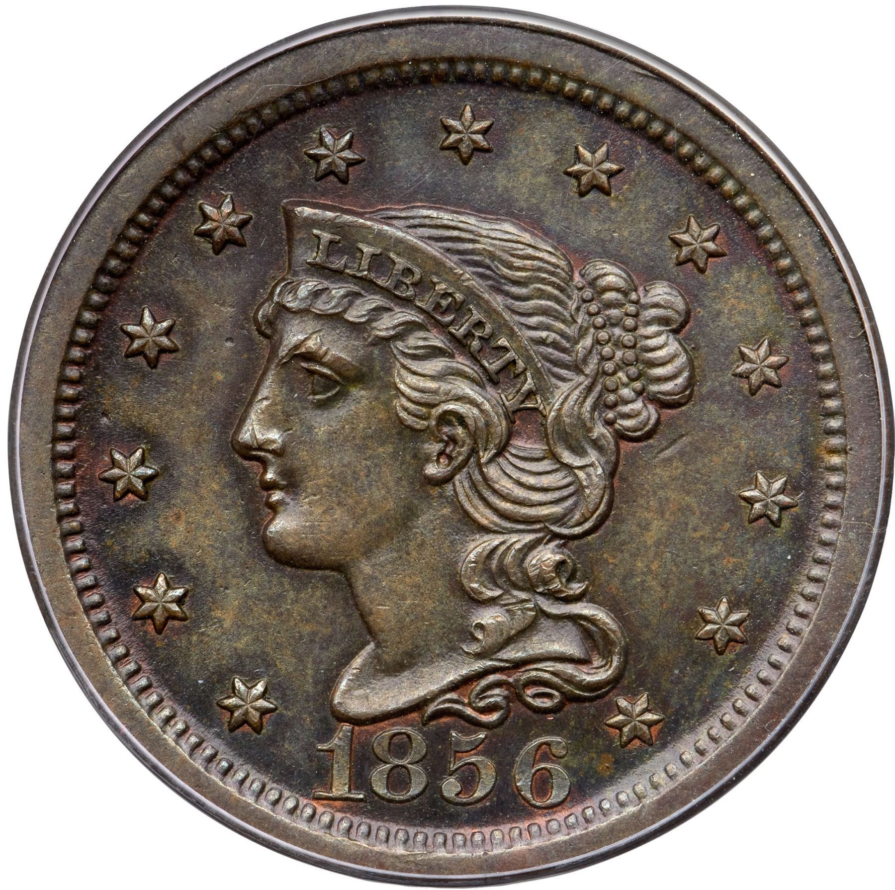 Frosty light olive blending to darker olive brown in protected areas. Tiny peeps of very faded mint color can be found in protected areas on the obverse. Just a few small contact marks including a nick on the nostril and another on the eye brow. Sharply struck MDS, die state a late. The earlier die lines at IT in UNITED are dull and weak but still visible. Our grade is AU50+. The attribution is noted on the ANACS label.