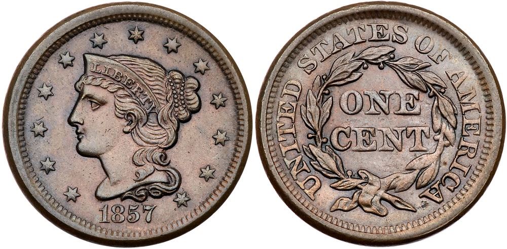 1857 N-4 R1 Small Date AU55Very close to mint state, and the cent has mint state eye appeal, but there are a few well-hidden marks. A dull scrape on the right side of the ear, another on the nose, and a dull, light vertical scratch left of star 12 are the notable marks, and they do not catch your eye. Glossy medium brown blending to olive brown and steel in protected areas. The surfaces are satiny and this cent has very nice eye appeal. M-LDS, die state b late. The fields are flowlined and the point down from the bottom of the inner hair bun is small but still visible.Certificate Number: Pedigree: From the Fred H. Borcherdt Collection