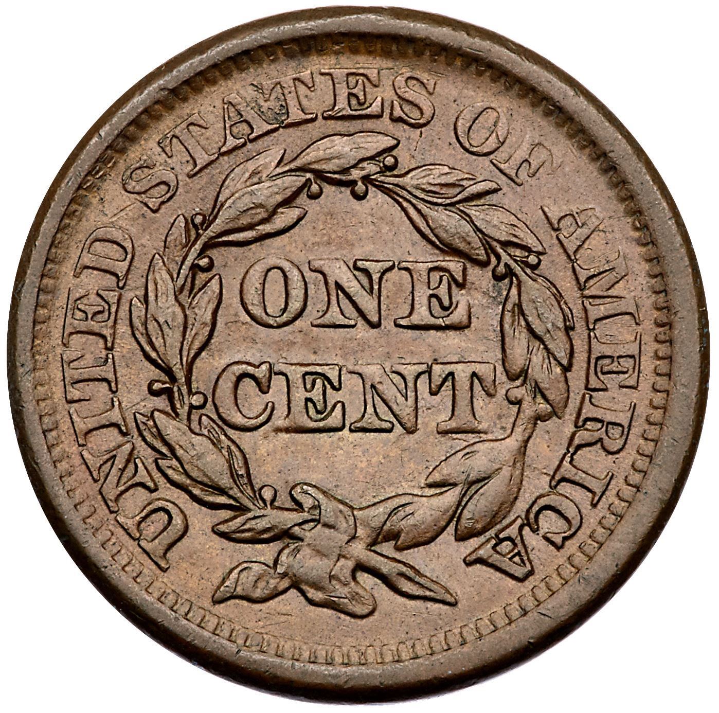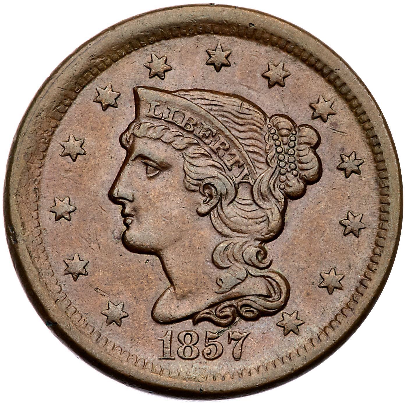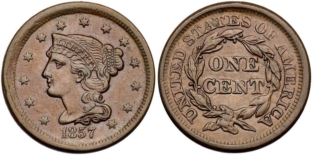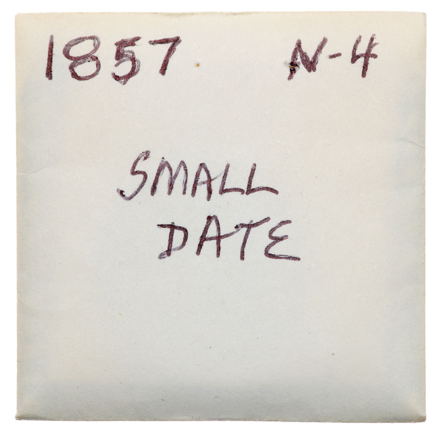 1857 N-4 R1 Small Date EF40Five points sharper with a few minor contact marks including a small, well-hidden mark at the right top of the 5. Attractive glossy brown and light chocolate with frost in protected areas. MDS, die state b.Pedigree: From the Fred H. Borcherdt Collection