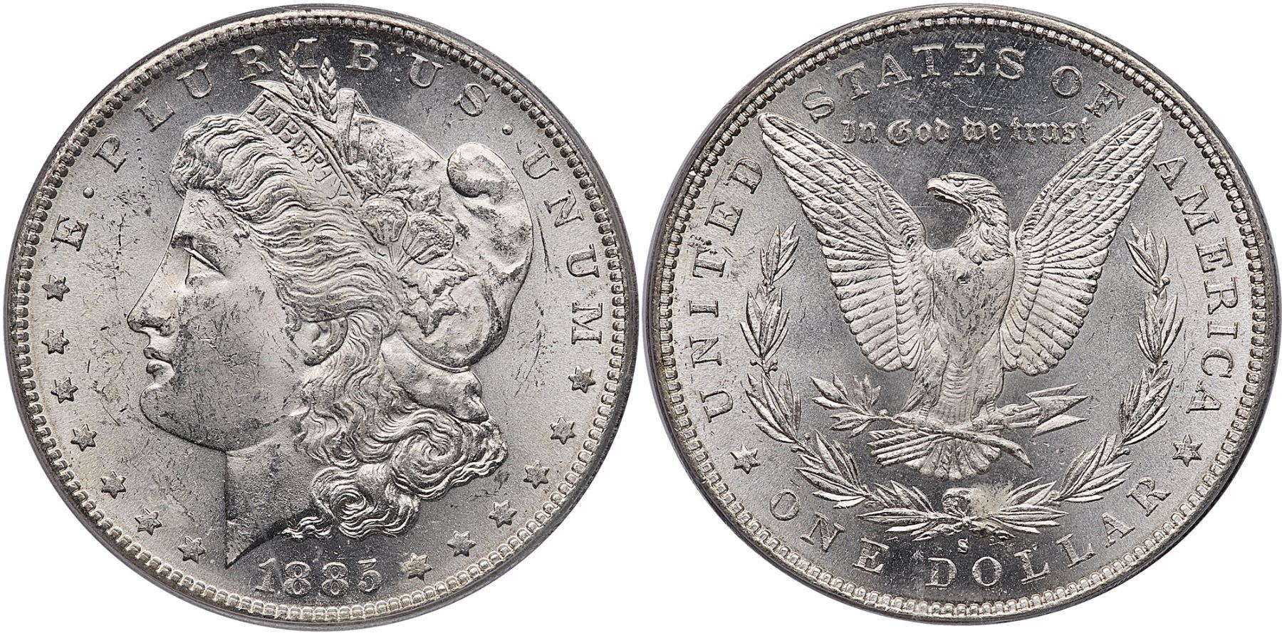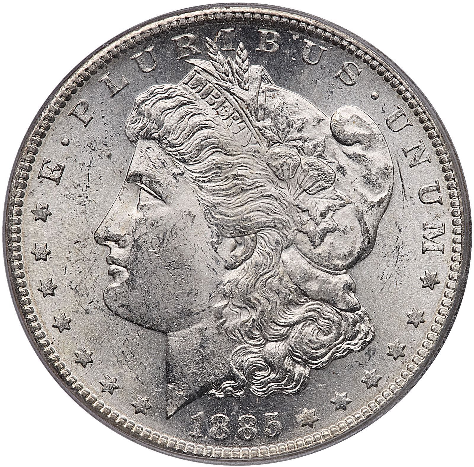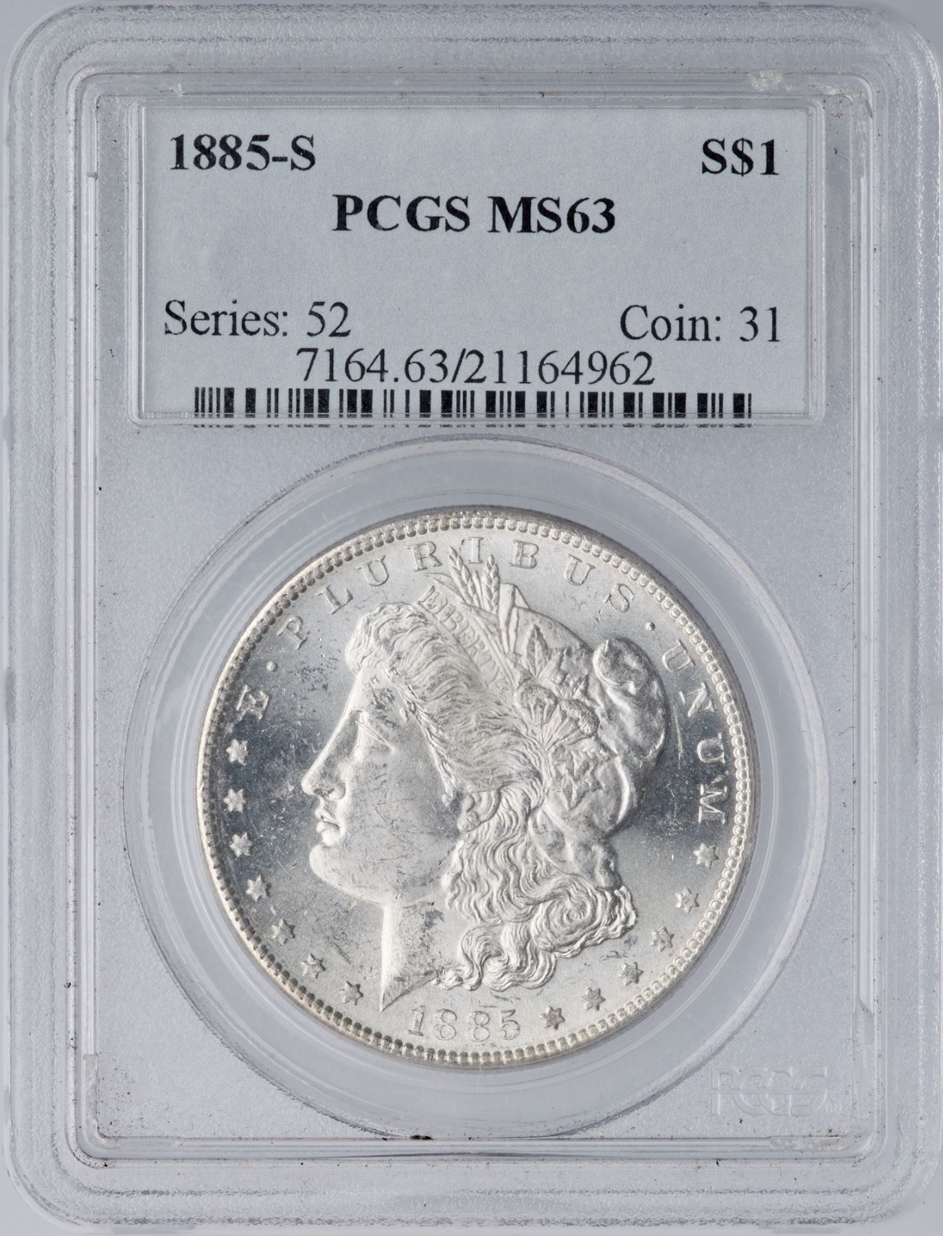 1885-S Morgan Silver Dollar PCGS MS63Frosty blast white with lustrous, semi-reflective surfaces.Certificate Number: Pedigree: Ex; Phil Davis