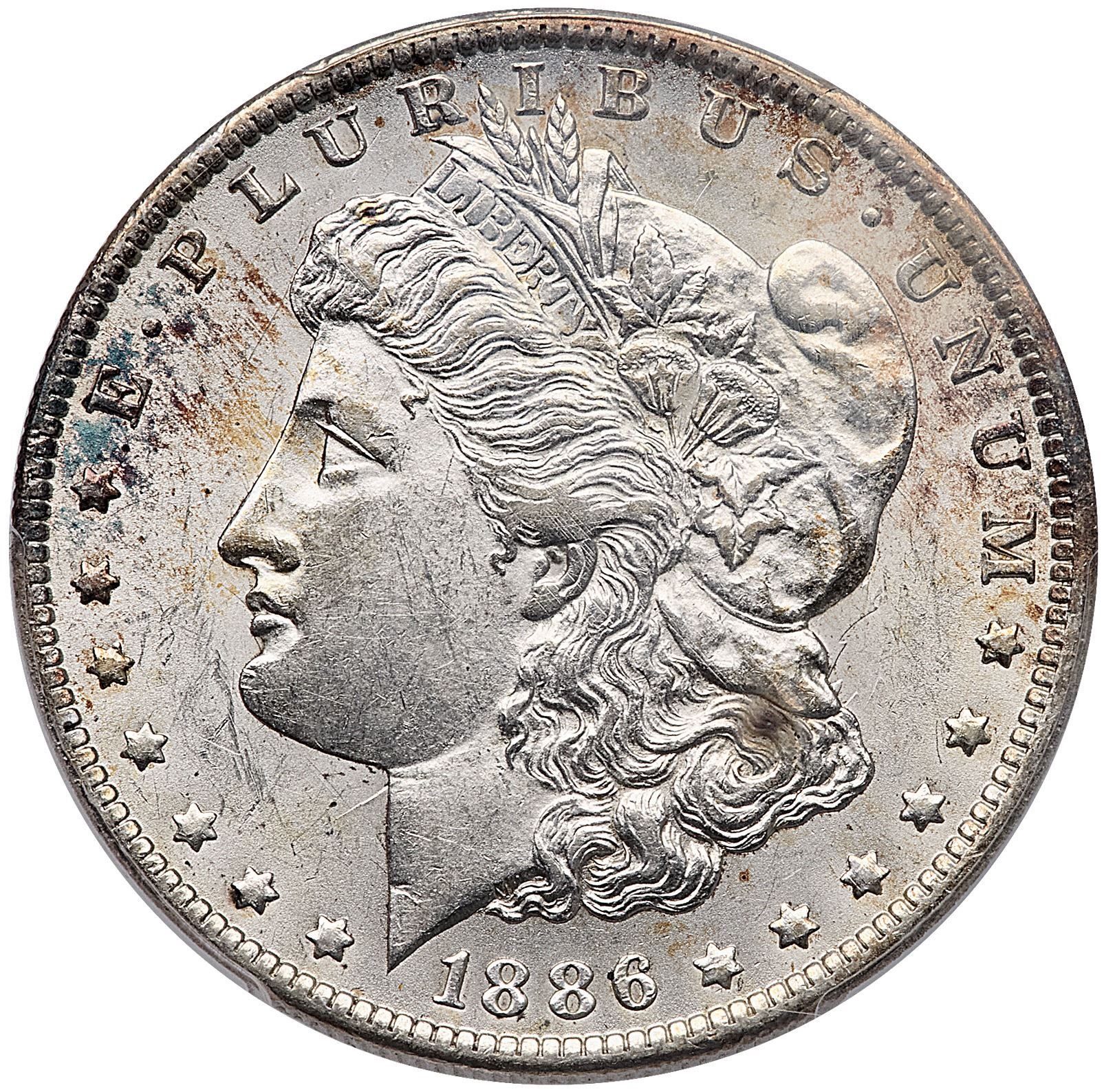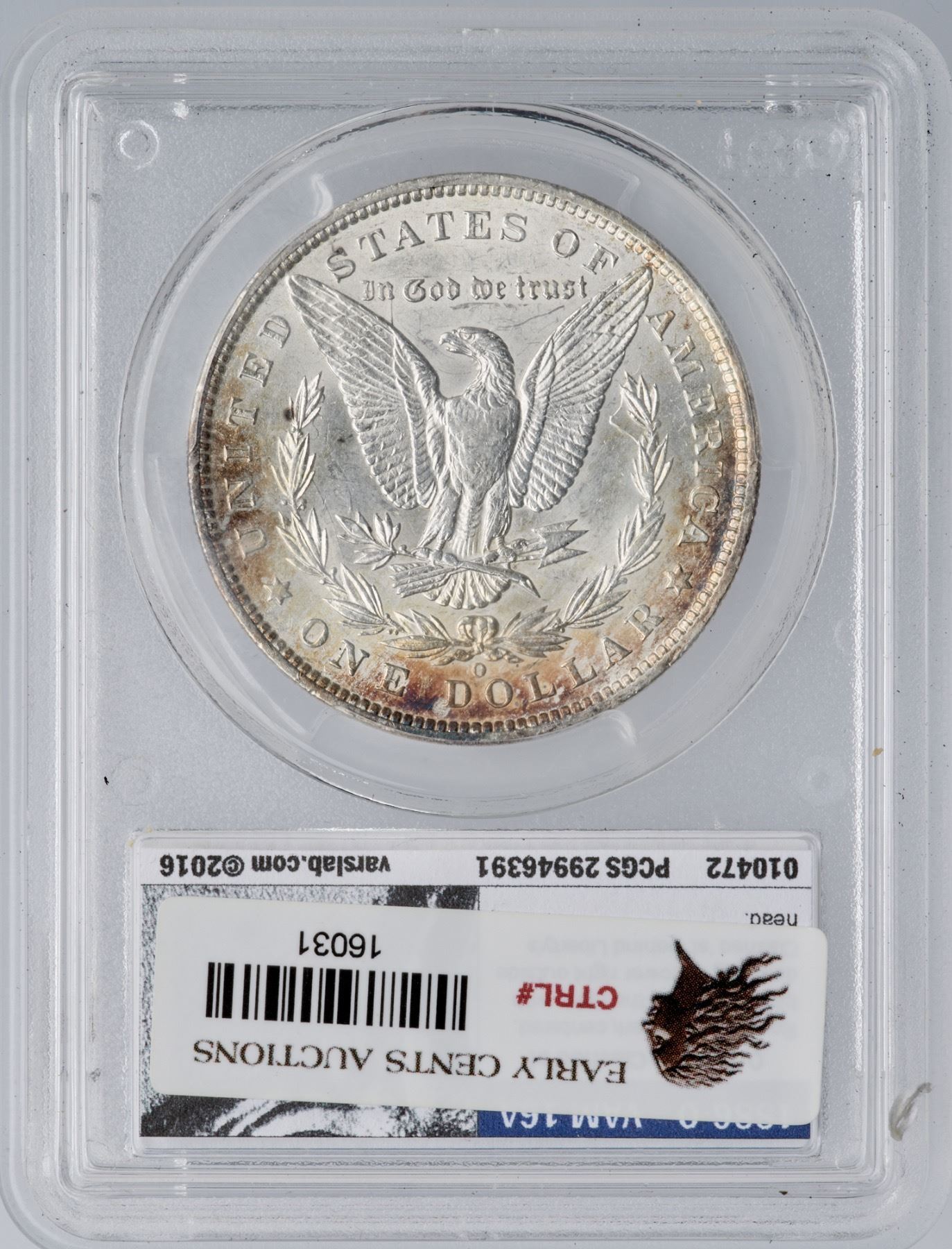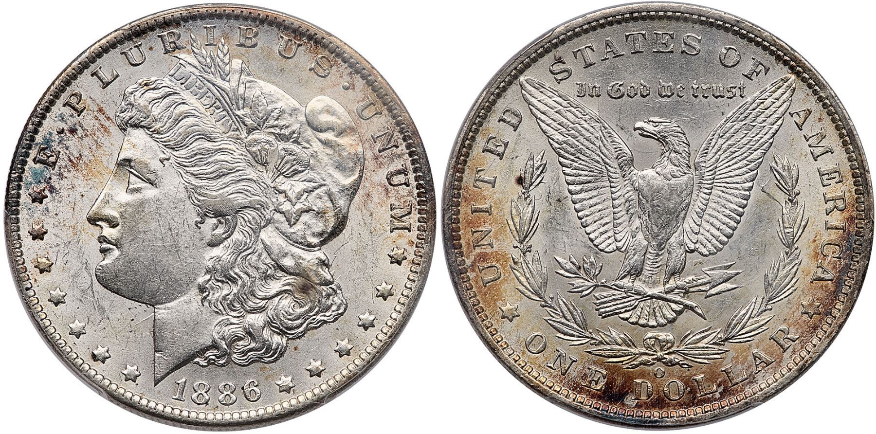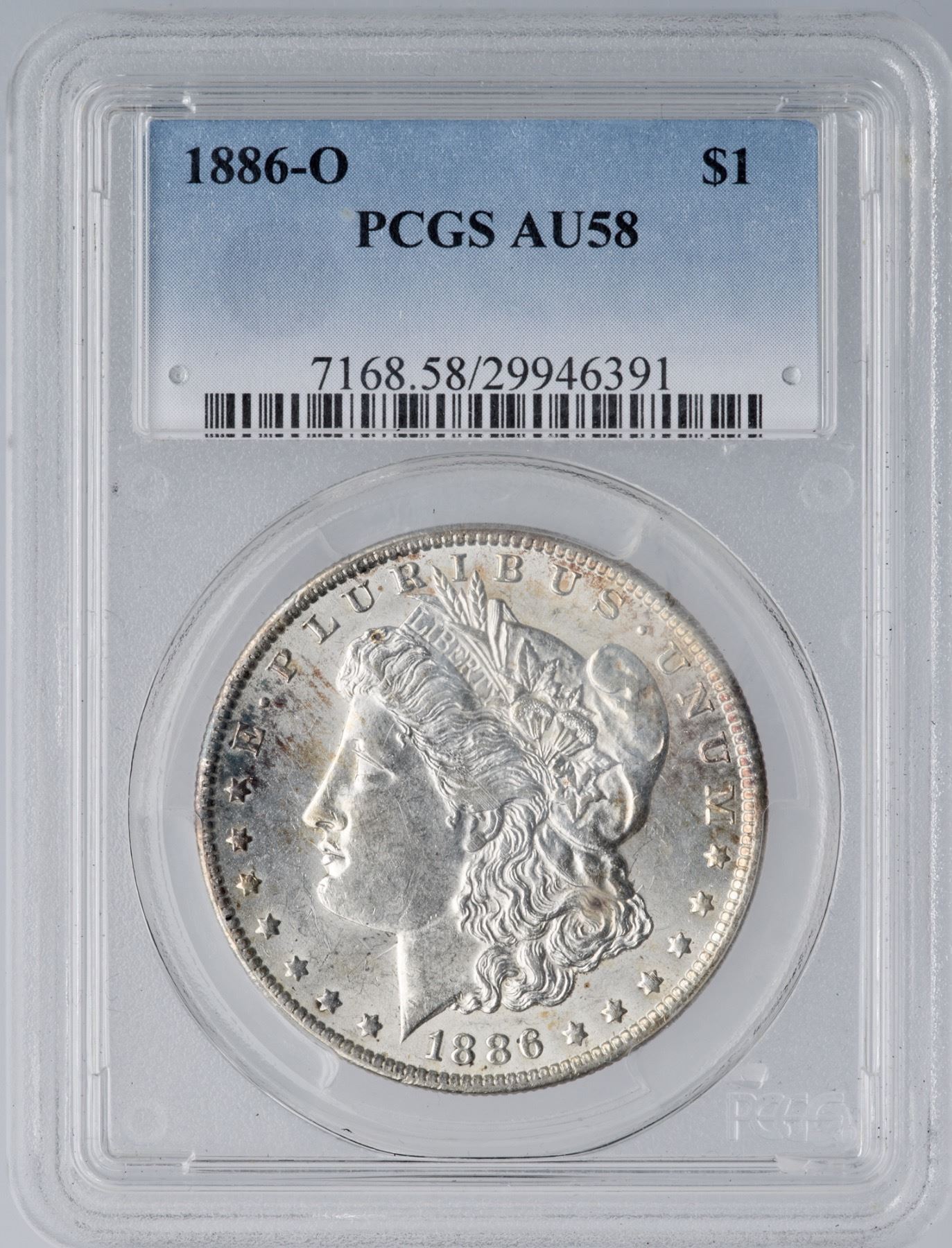 1886-O VAM-16A Morgan Silver Dollar PCGS AU58Bright silver with gold and blue tones around the peripheries of both sides, mostly the upper obverse and lower reverse.Certificate Number: Pedigree: Ex; Phil Davis