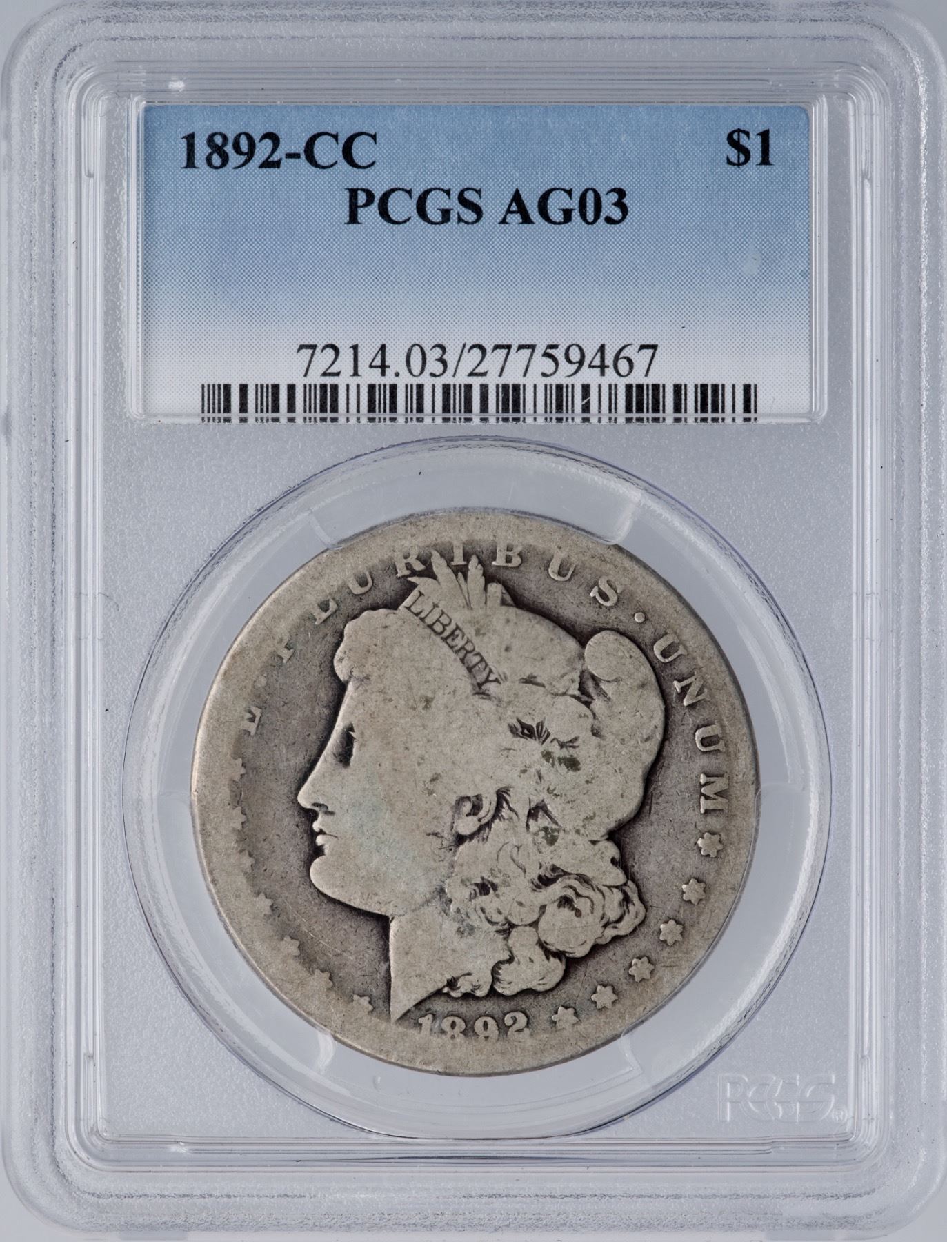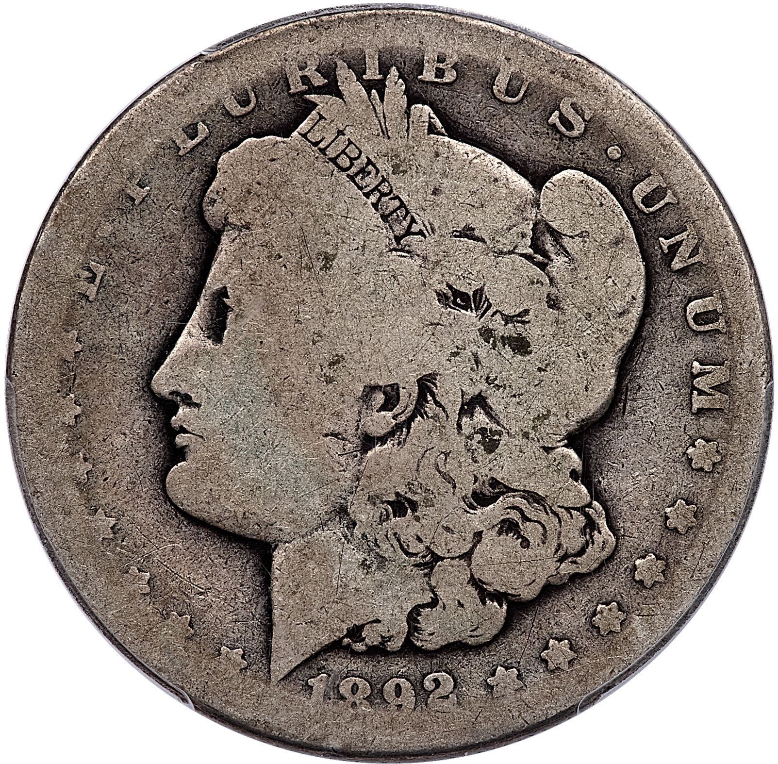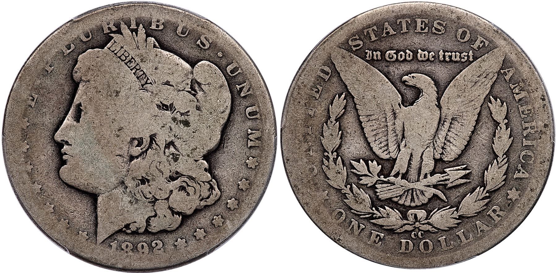1892-CC Morgan Silver Dollar PCGS AG3Antique silver grey, deeper in some protected areas. Worn around the peripheries but mostly readable date and legends.Certificate Number: Pedigree: Ex; Phil Davis