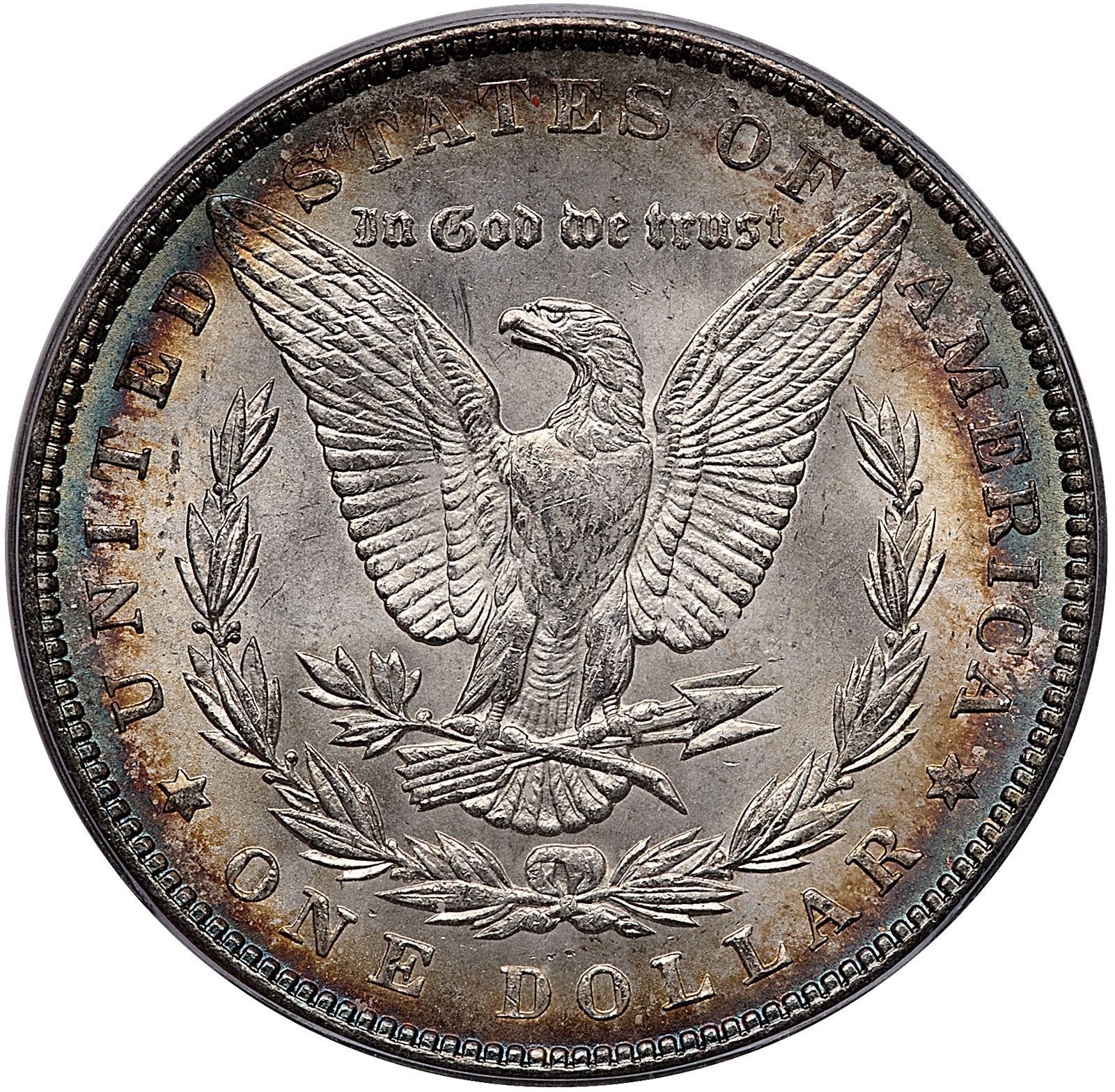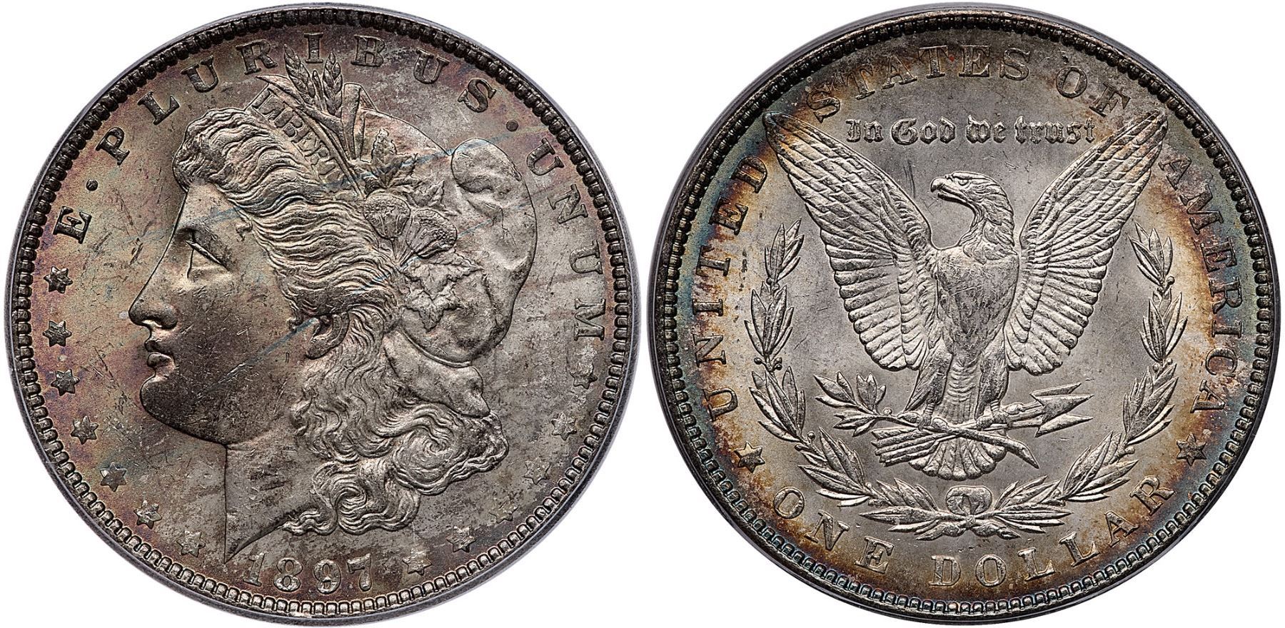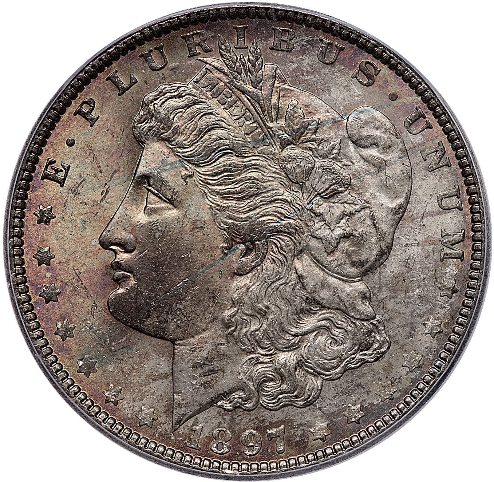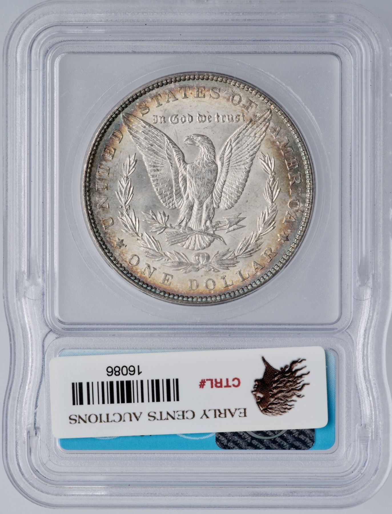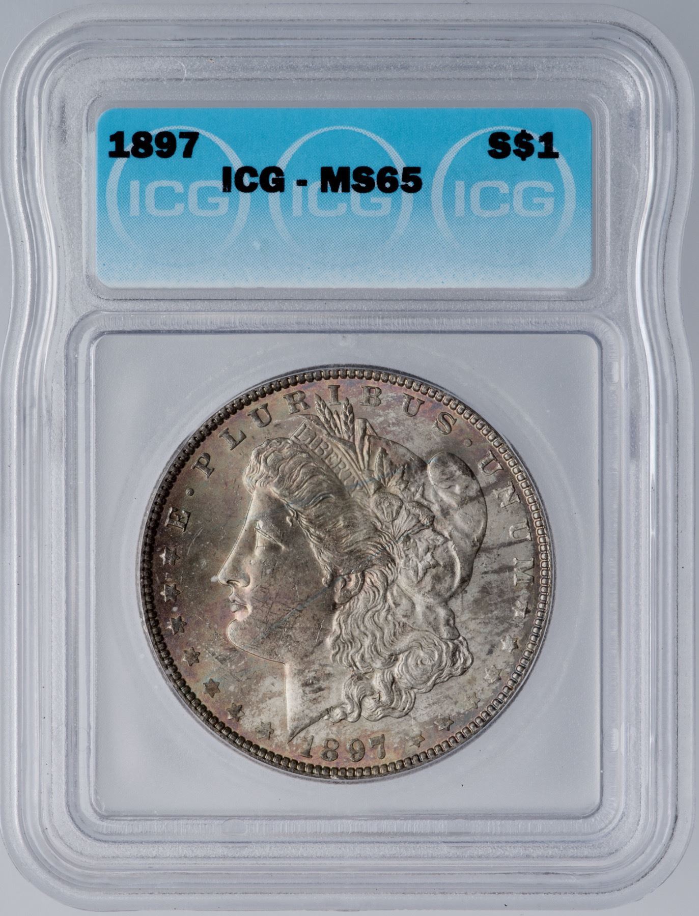1897 Morgan Silver Dollar ICG MS65Lightly toned across the obverse with peach, blue, and olive tones, while the reverse is bright silver with champagne and bold blue toning around the peripheries.Certificate Number: Pedigree: Ex; Phil Davis