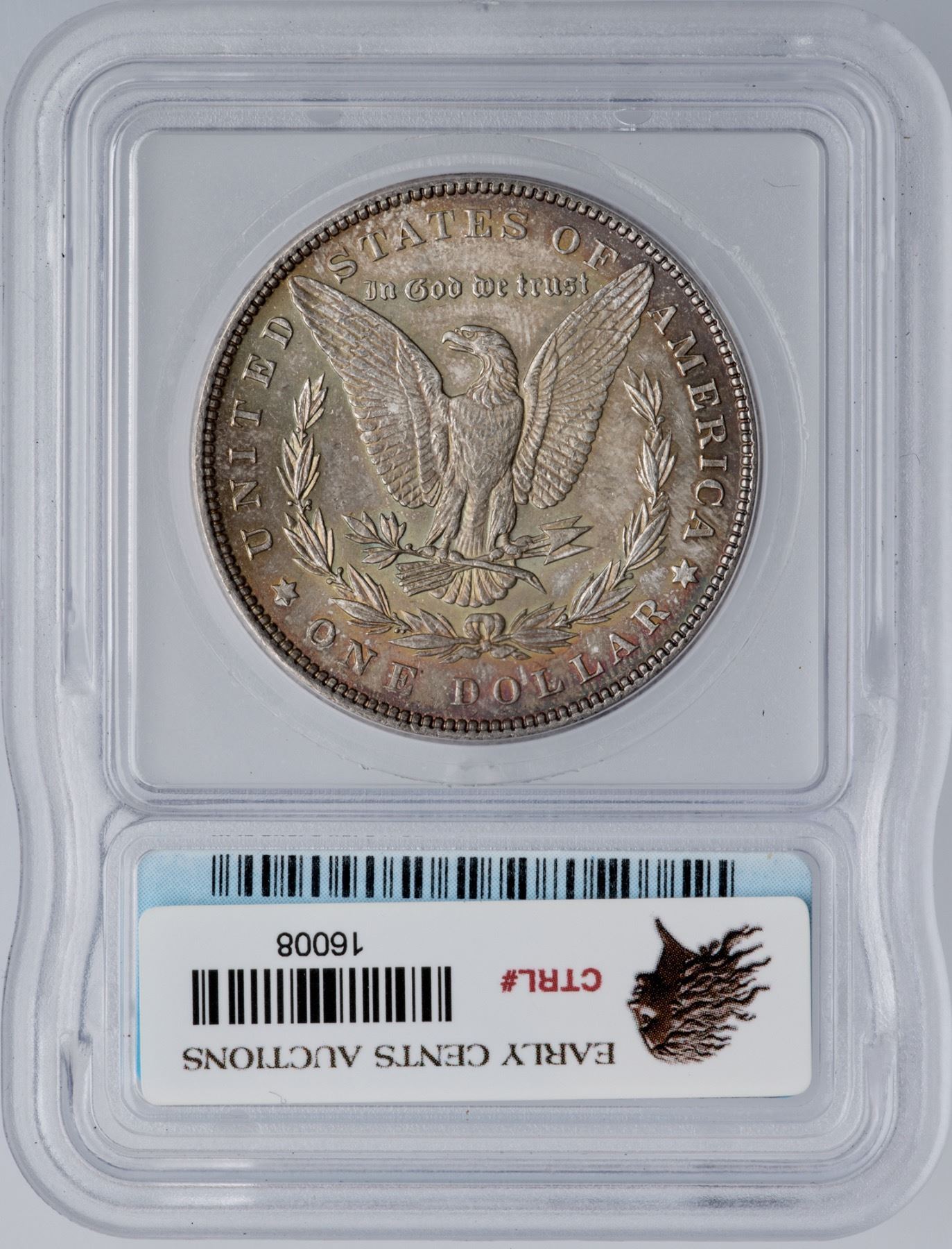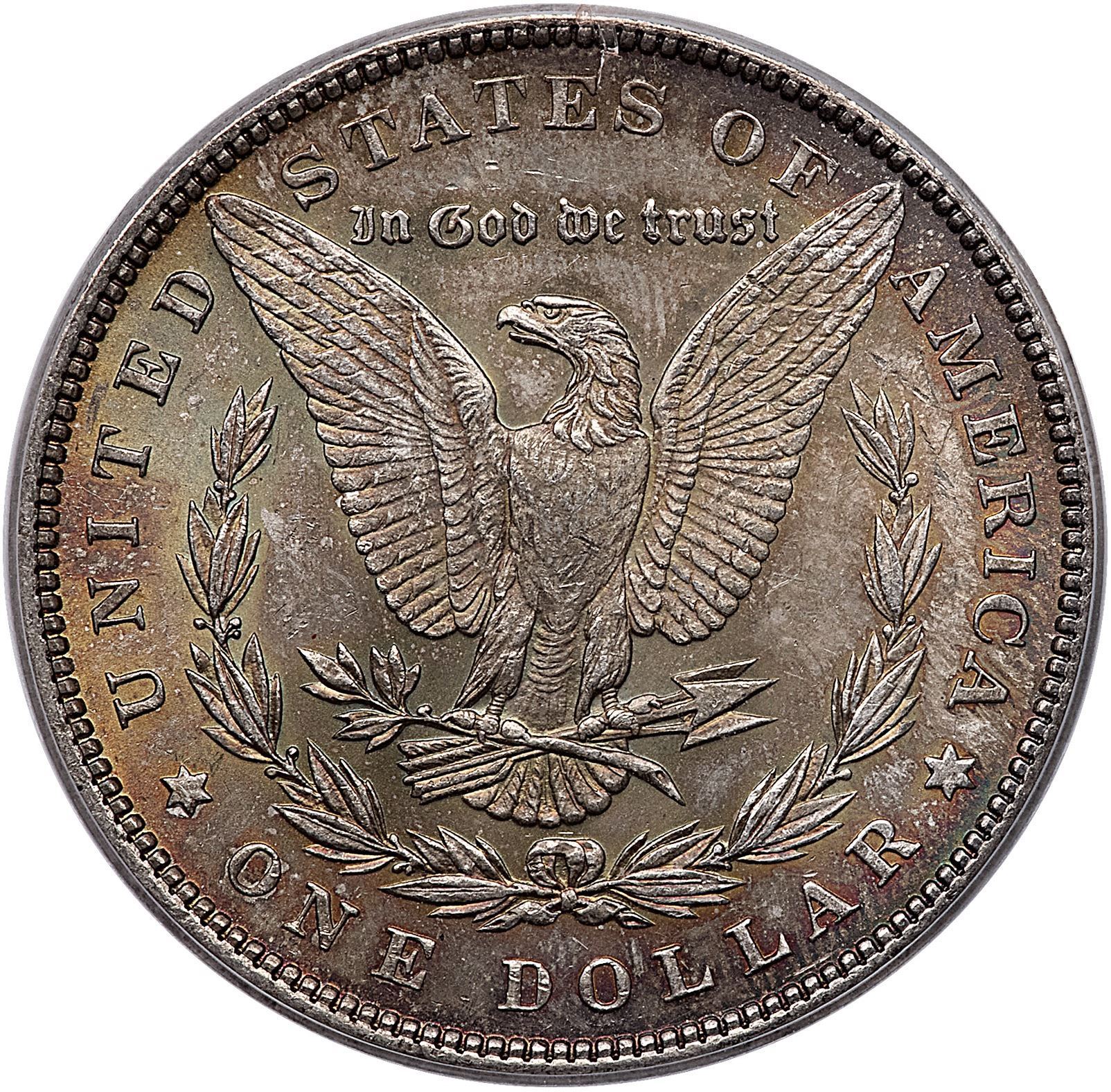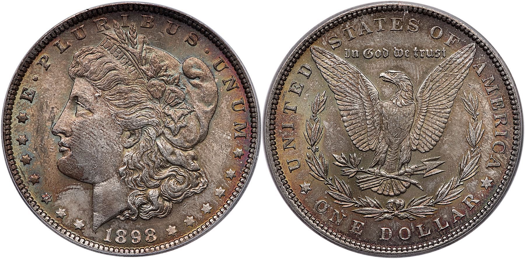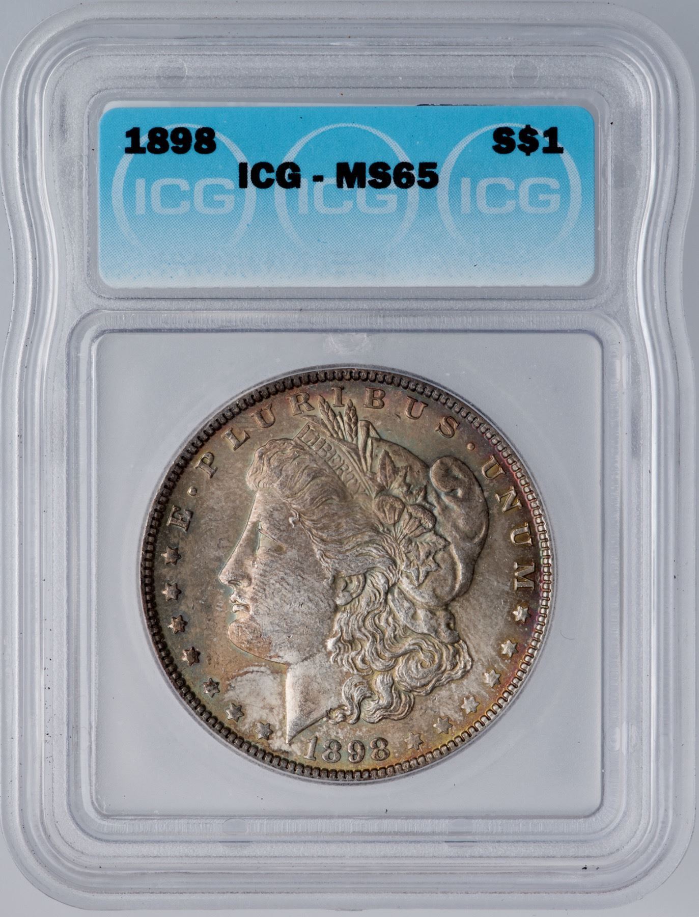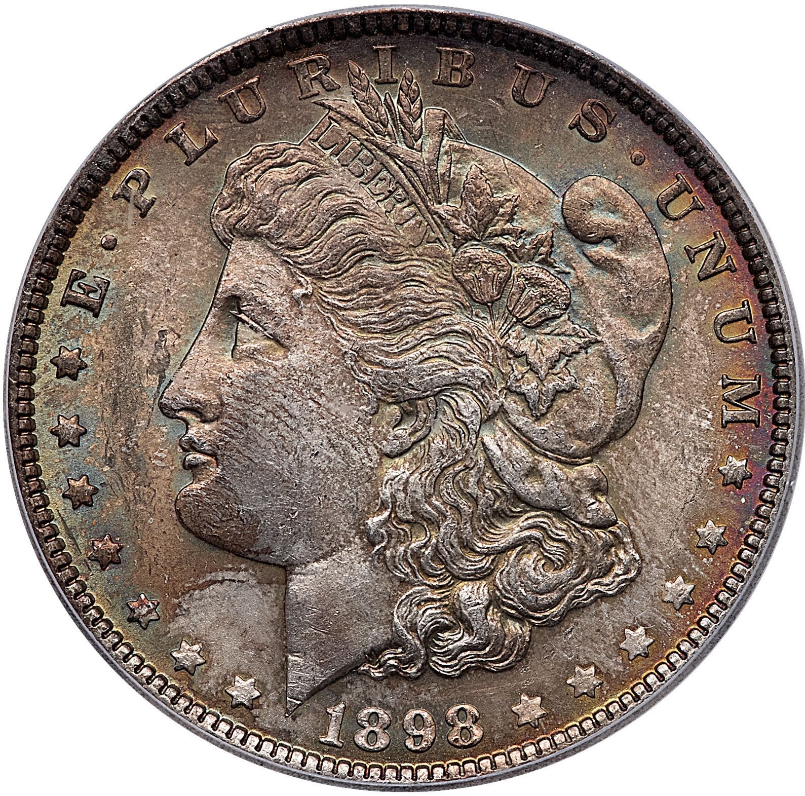 1898 Morgan Silver Dollar ICG MS65Deeply toned mostly olive and gold with subtle iridescent blue, red and orange. Certificate Number: Pedigree: Ex; Phil Davis