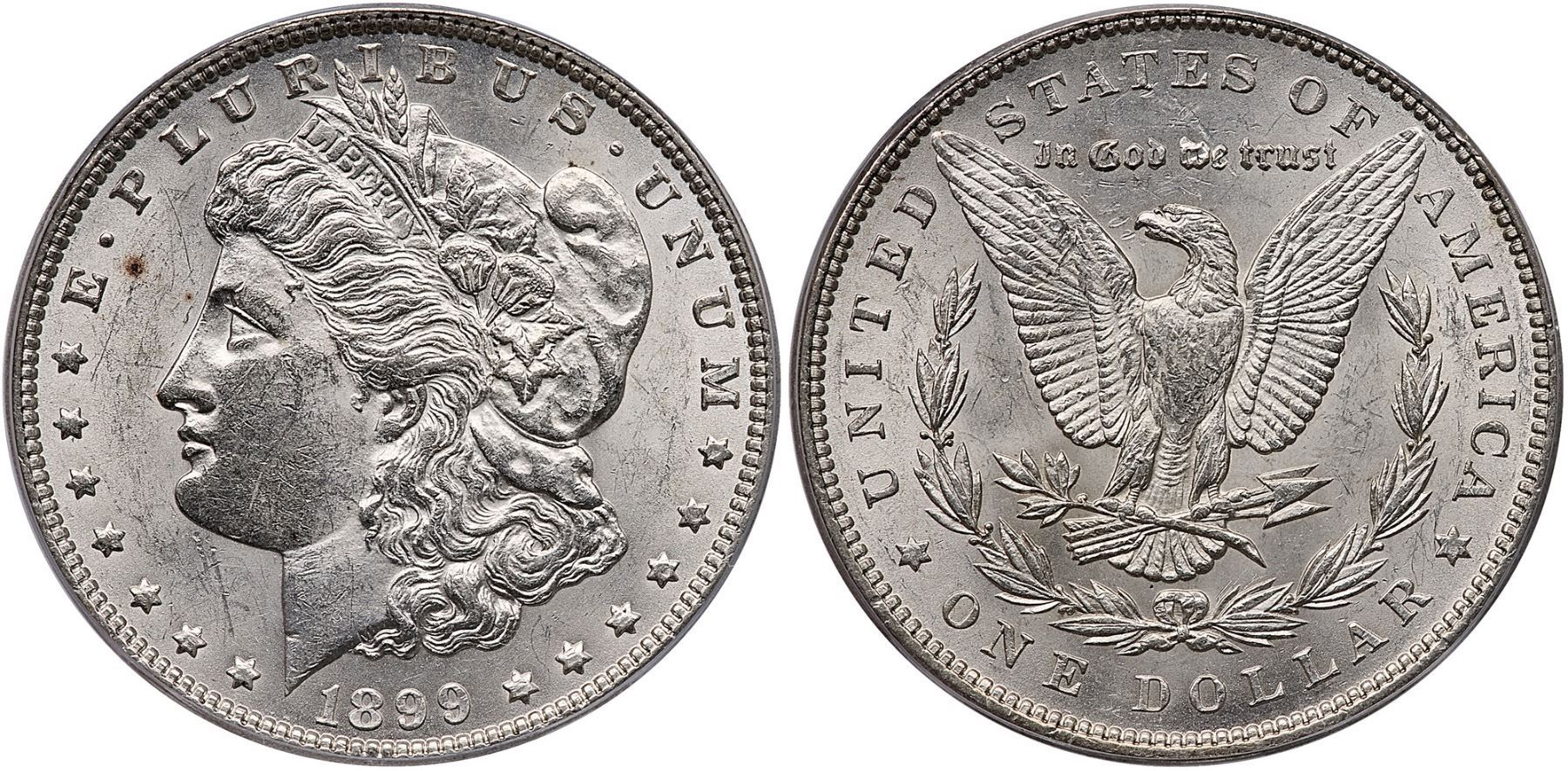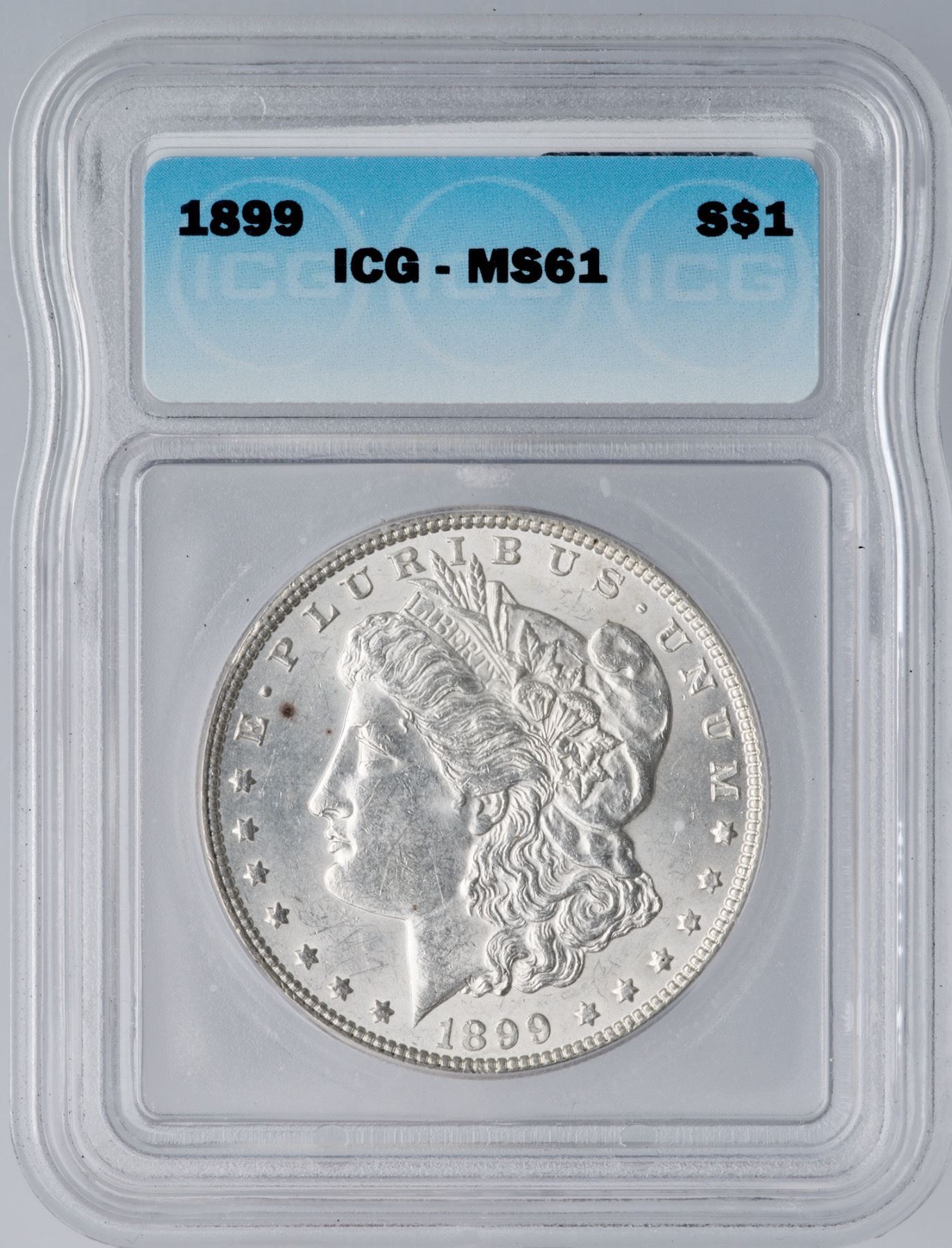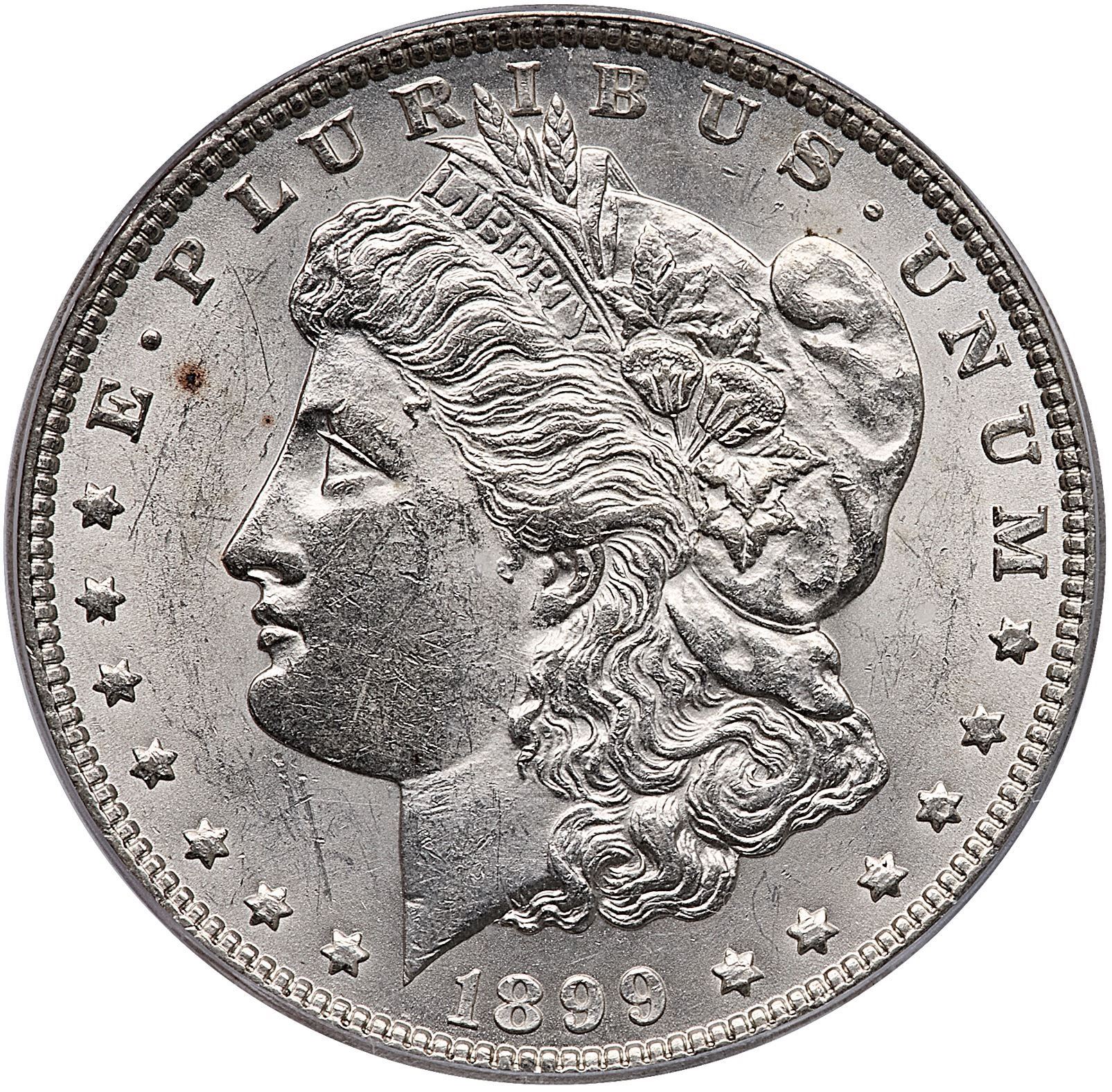 1899 Morgan Silver Dollar ICG MS61Lustrous light silver with a couple tiny toning spots before the forehead. Certificate Number: Pedigree: Ex; Phil Davis