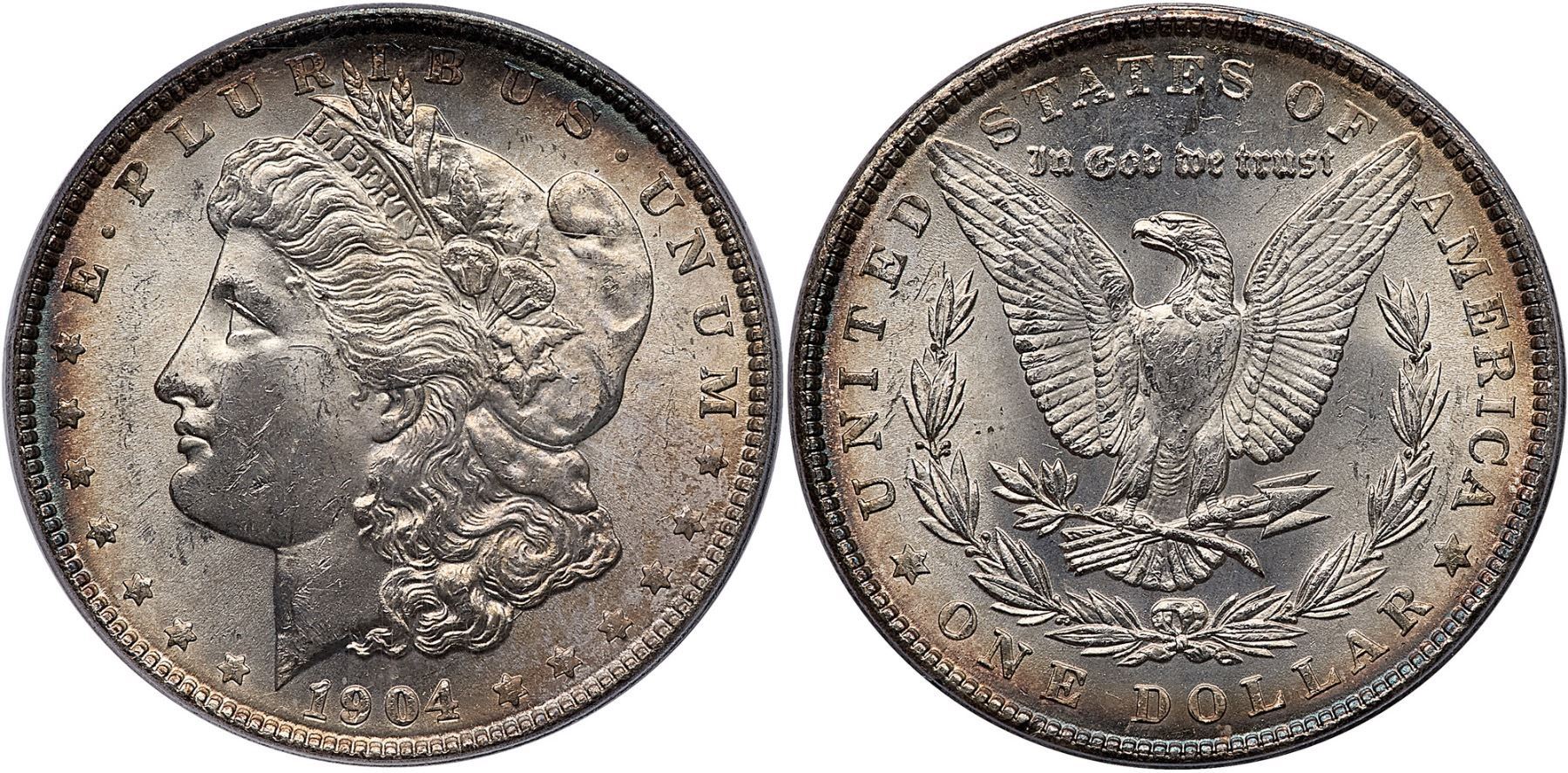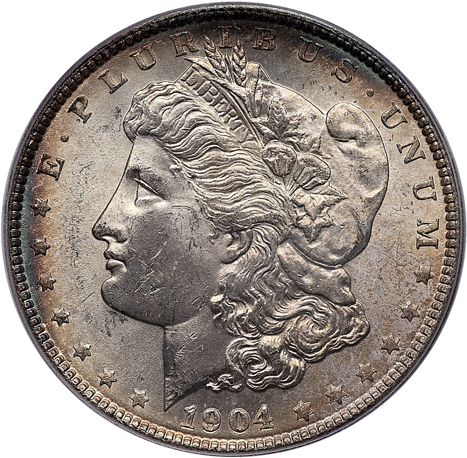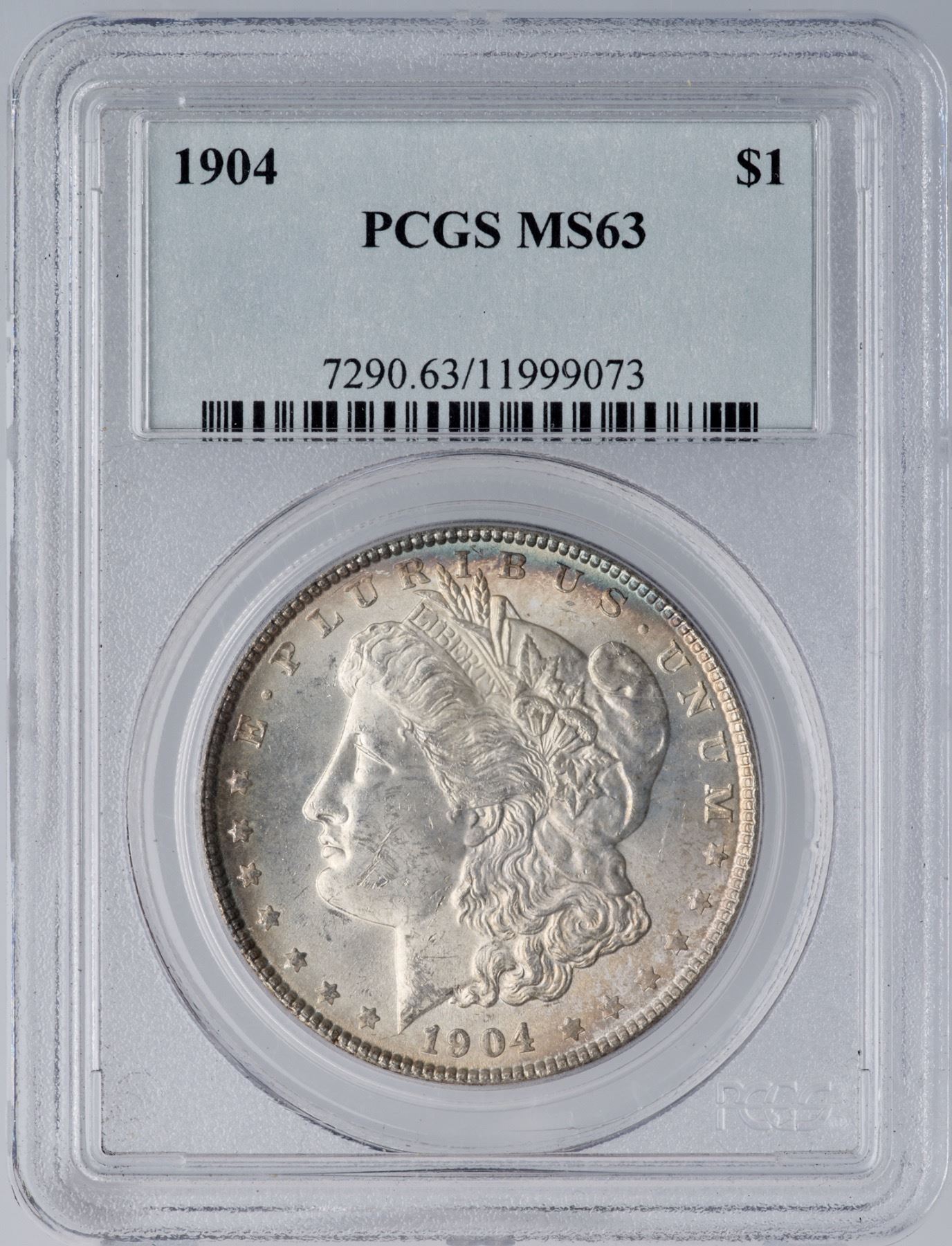 1904 Morgan Silver Dollar PCGS MS63Lightly toned champagne and deep blue around the peripheries. Certificate Number: Pedigree: Ex; Phil Davis