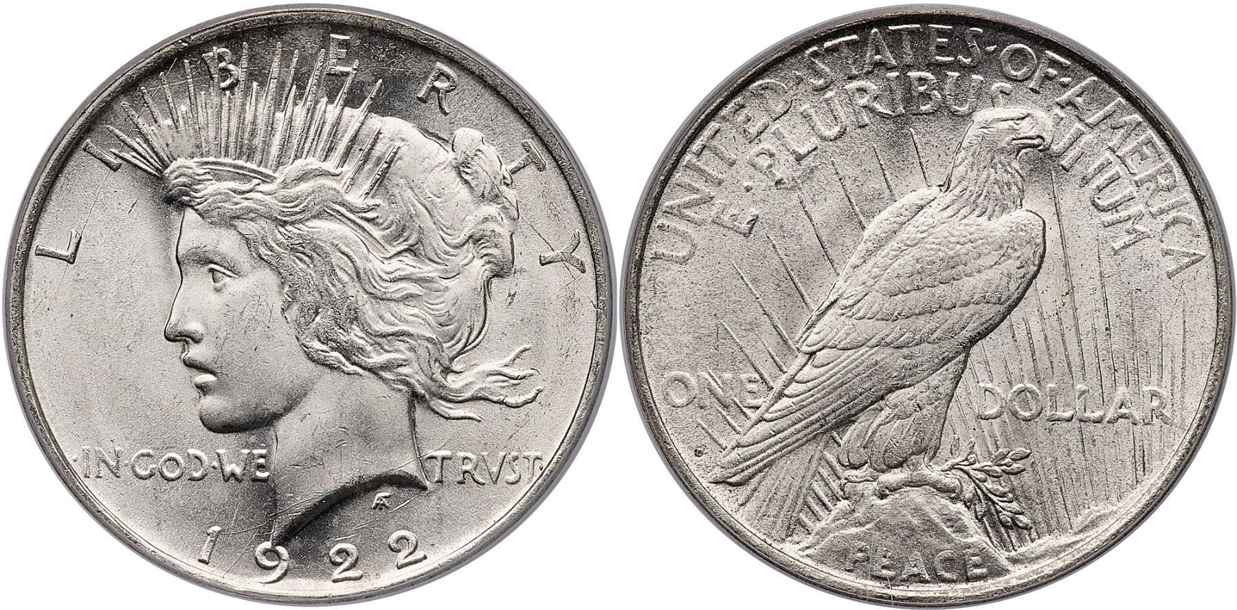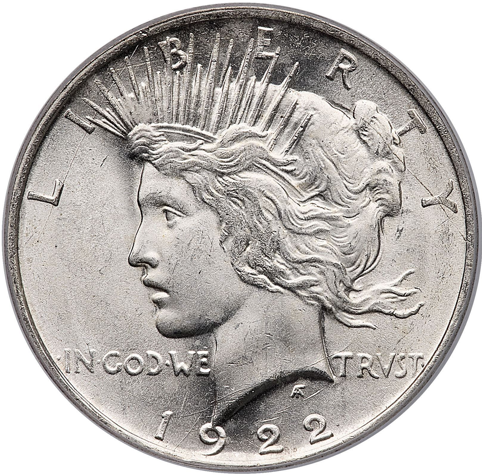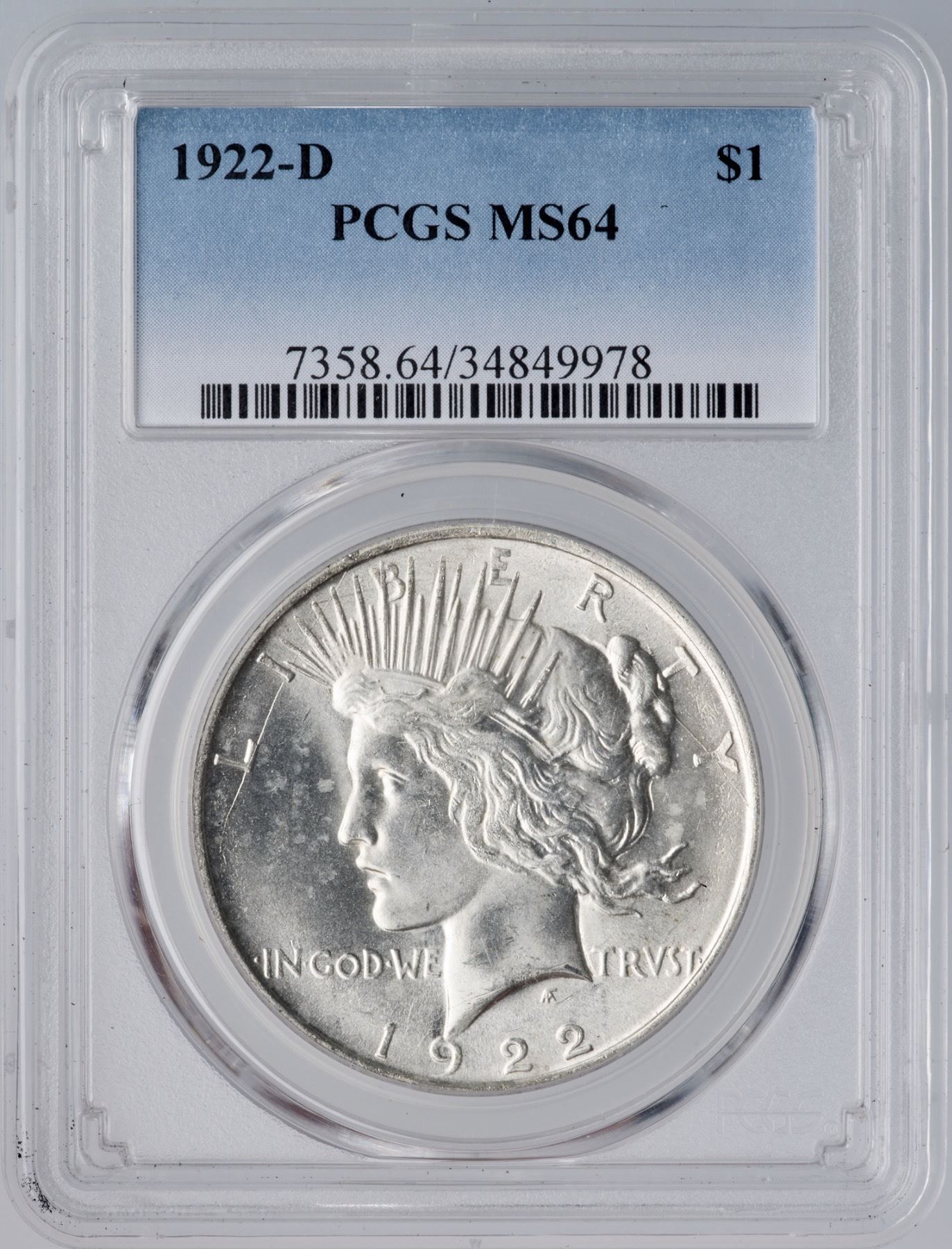 1922-D Peace Silver Dollar PCGS MS64Brilliant bright silver with frosty cartwheel luster covering the surfaces. There are several die cracks along the upper obverse.Certificate Number: Pedigree: Ex; Phil Davis
