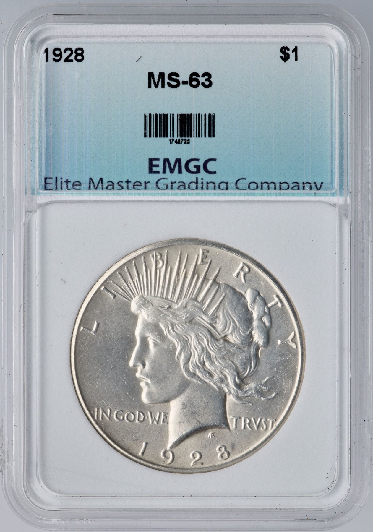 1928 Peace Silver Dollar EMGC MS63Satiny, lustrous bright silver free of notable marks.Certificate Number: Pedigree: Ex; Phil Davis
