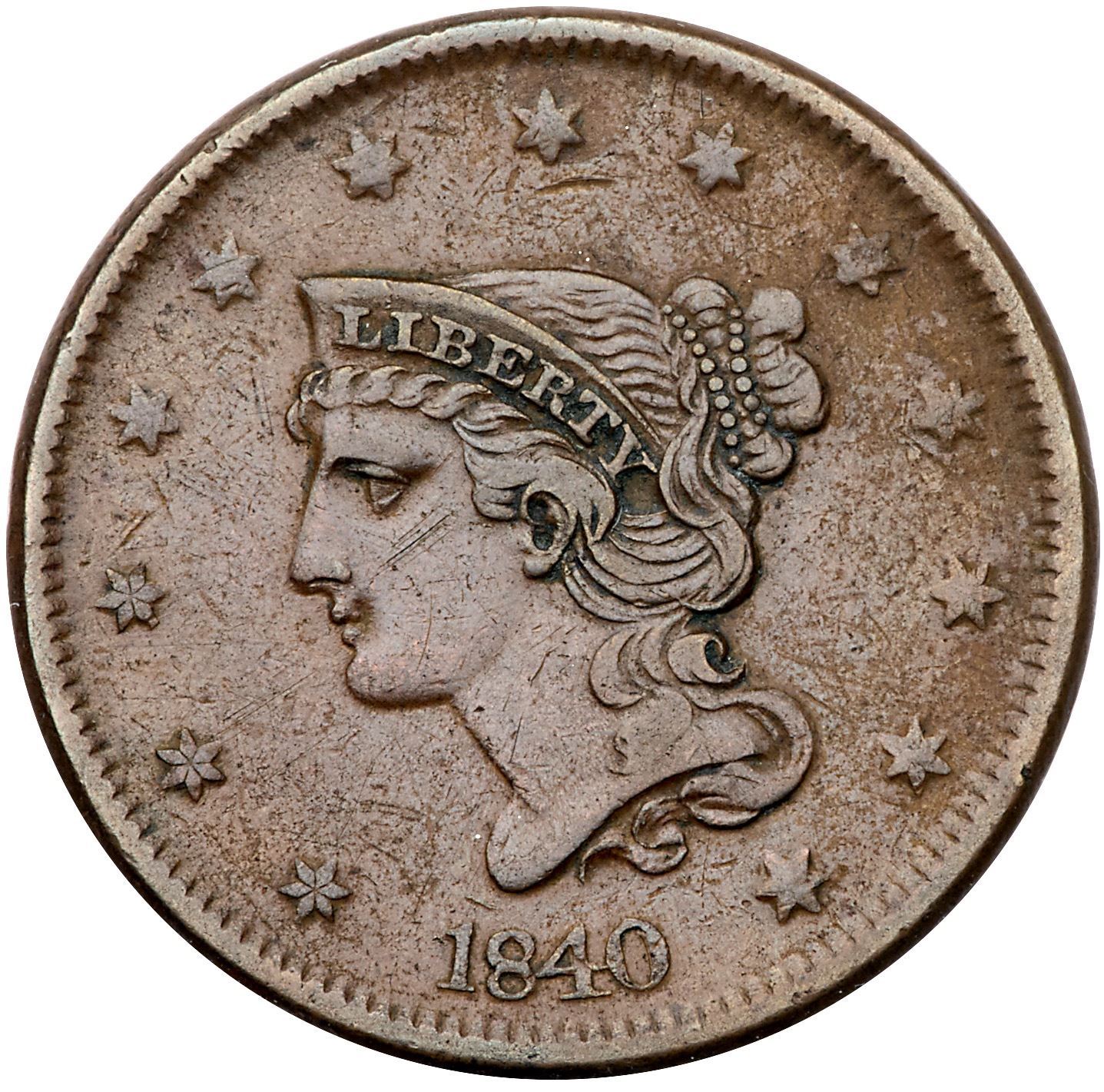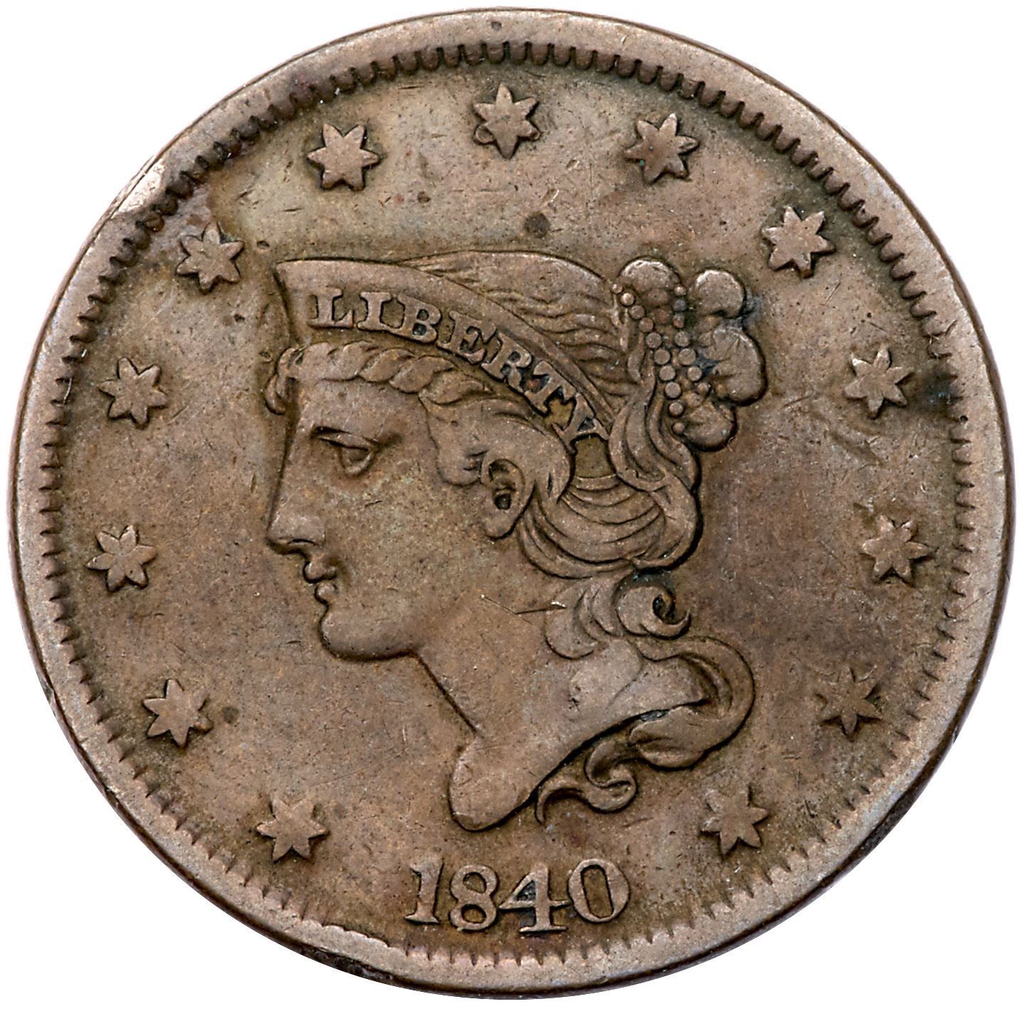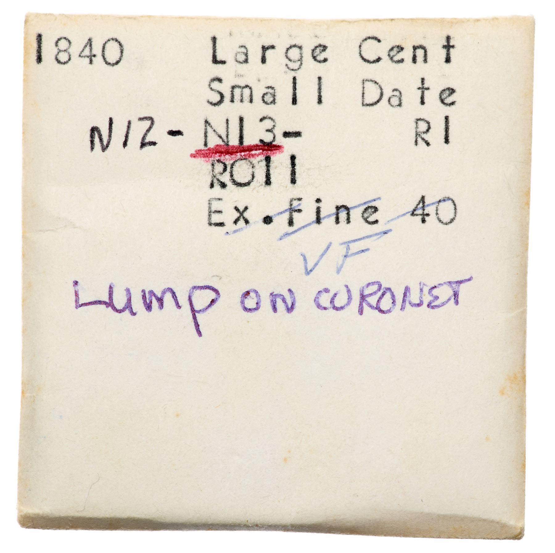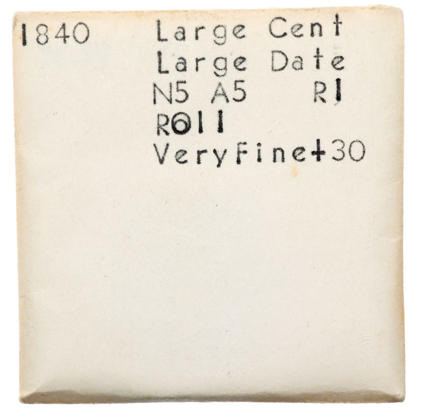 Group of Five 1840 Cents grading F15Includes N-2 R2 Small 18 over Large 18, N-4 R3- Small Date, N-5 R1 Large Date, N-6 R1 Large Date with Repunched 40, and N-12 R2 Small Date. Some are sharper with marks but all are glossy brown and chocolate with a strong date. Lot of 5 coins.Pedigree: From the Fred H. Borcherdt Collection