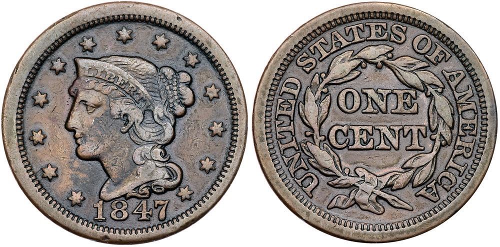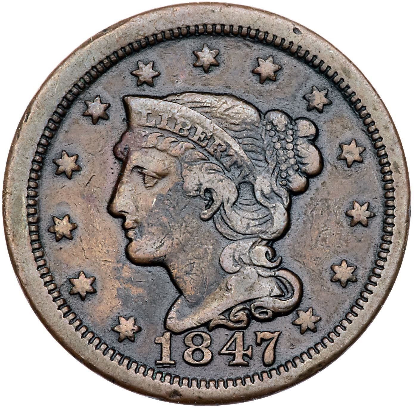 Group of Five 1847 Cents grading F15Includes N-4 R3 Repunched 18, N-24 R1, N-26 R3+, N-28 R4+ Repunched 4, and N-37 R1. Some are sharper with marks but all are glossy brown and chocolate with a strong date. Lot of 5 coins.Pedigree: From the Fred H. Borcherdt Collection