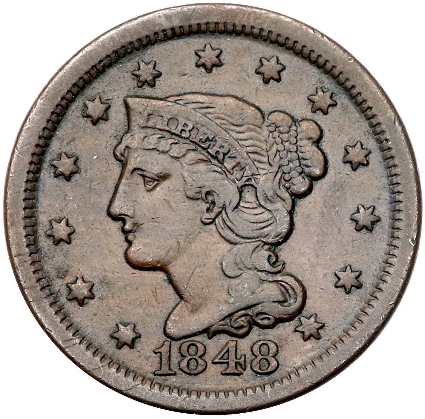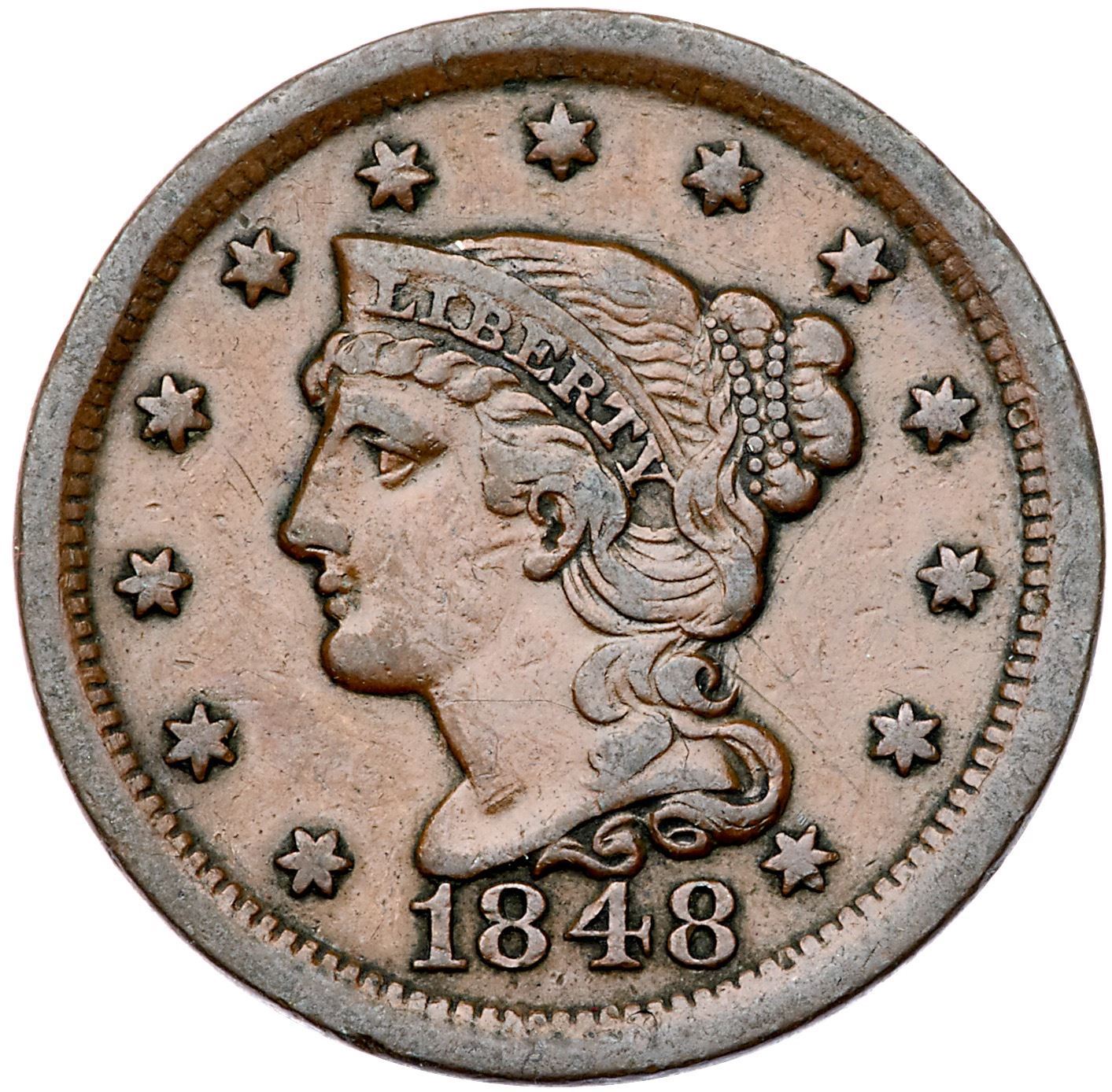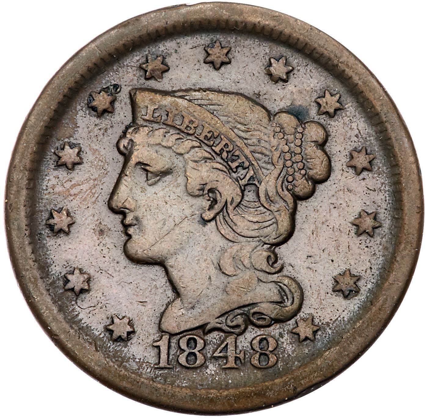 Group of Five 1848 Cents grading F15Includes N-16 R2 Repunched 4, N-20 R3 Repunched 48, N-24 R4+, N-28 R1, and N-35 R2. Some are sharper with marks but all are glossy brown and chocolate with a strong date. Lot of 5 coins.Pedigree: From the Fred H. Borcherdt Collection