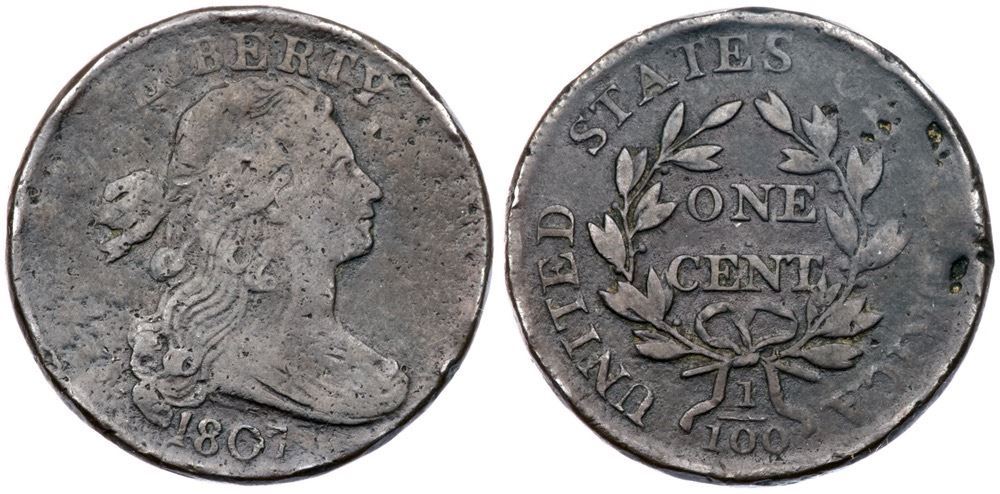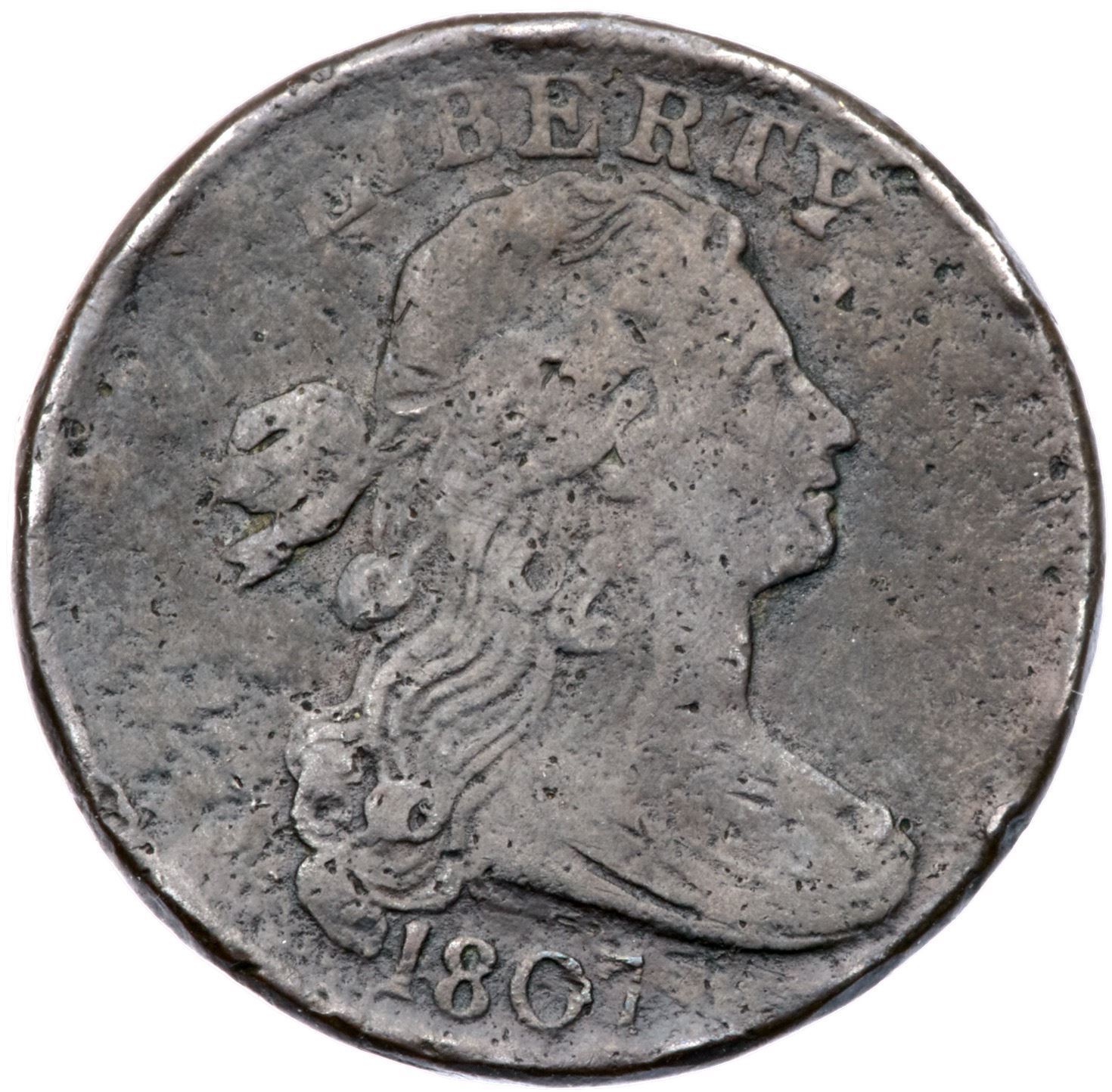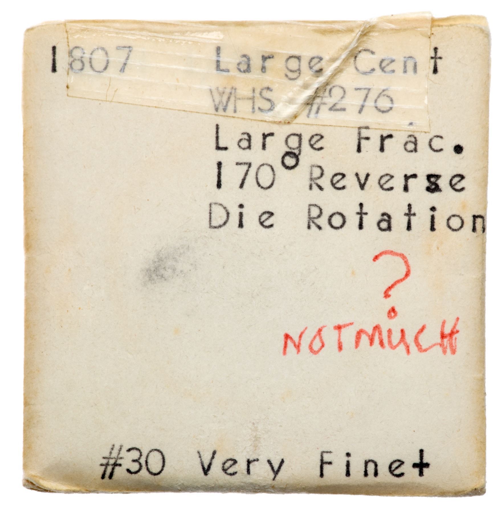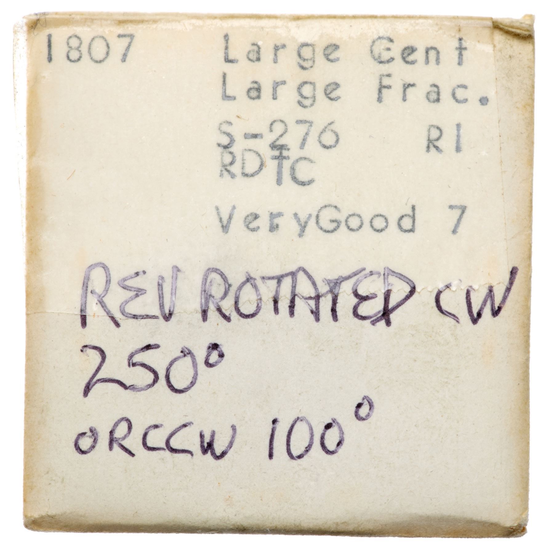 Pair of 1807 S-276 R-3 Draped Bust CentsA pair of 1807 S-276 Draped Bust cents. One is dark with scattered pits and dents, MDS with the reverse rotated 165 degrees CW graded F12 net G4. The other is polished and now toned faded orange, medium brown, and steel, M-LDS the reverse rotated 105 degrees CCW graded G6 net G4.Certificate Number: