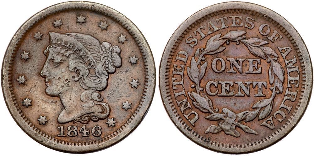 Pair of 1846 & 1852 Cents with Rim CudIncludes 1846 N-7 R2+ LDS (d) with a rim cud from star 13 to the 6 F15 net VG10 for small nicks, and 1852 N-23 R5 M-LDS (b) with a rim cud from below the wreath ribbon to the end of the stem VF25 net VF20 for light cleaning. The rim cuds not strong but they are clearly defined on both pieces. Both are glossy brown and chocolate. Lot of 2 coins.Pedigree: From the Fred H. Borcherdt Collection