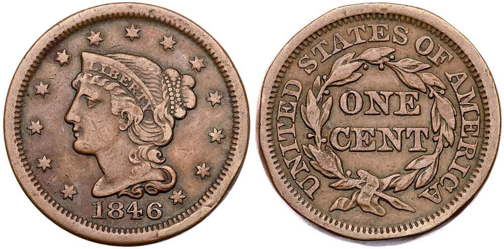 Pair of 1846 CentsIncludes N-7 R2+ LDS (die state d) with a rim cud from the 6 to star 13 VG10, and N-15 R4+ Hole in Ear EDS+ (die state a late) with a faint crack through the date and most stars VG8. The first is sharper with a dent. Lot of 2 coins.Pedigree: From the Fred H. Borcherdt Collection