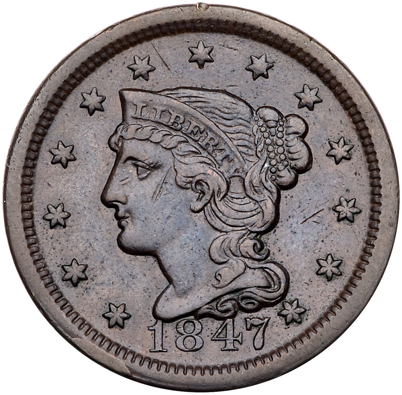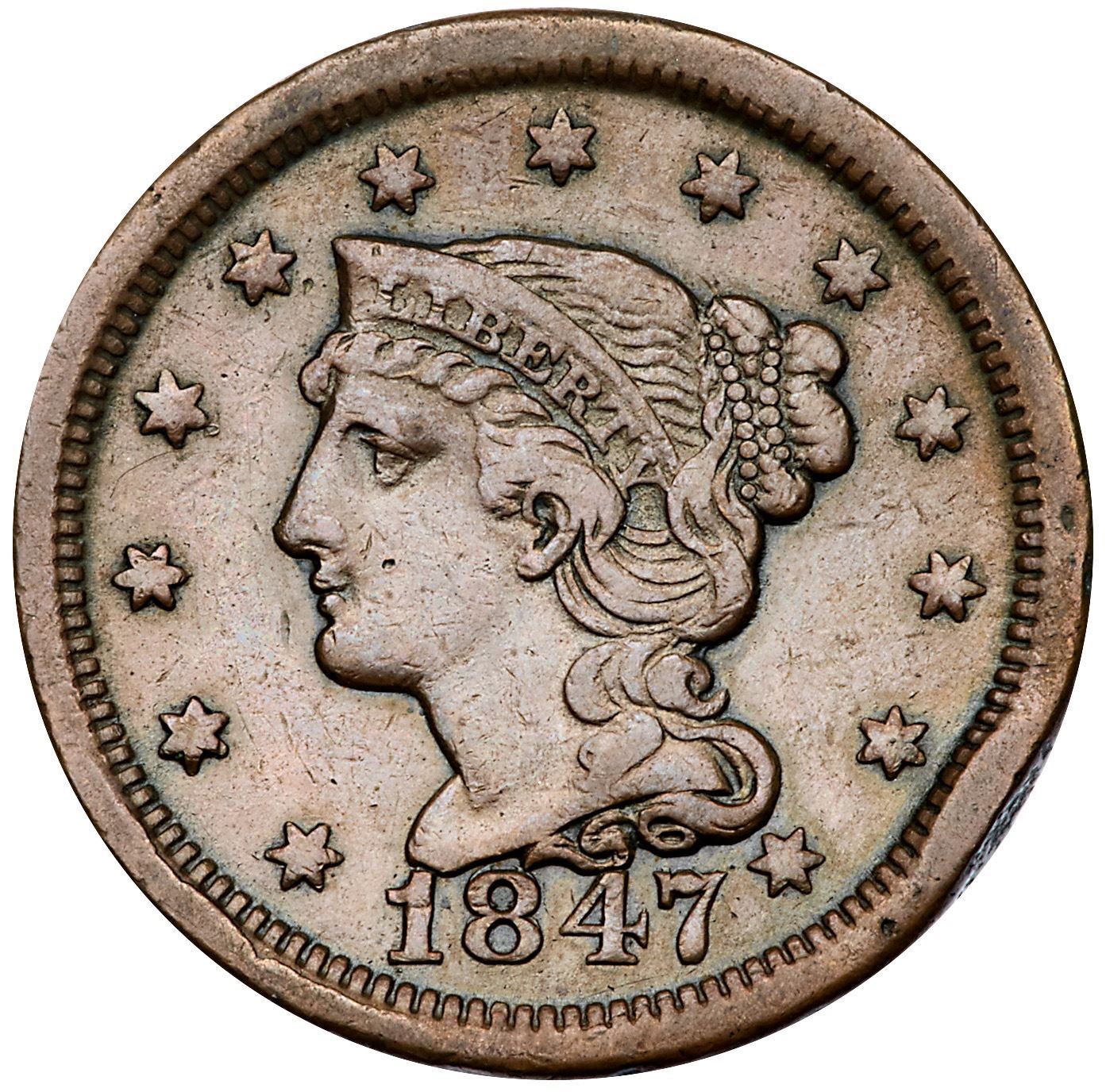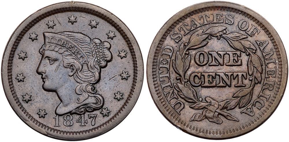Pair of 1847 Cents with Rim CudsIncludes N-7 R2+ M-LDS (b) with a rim cud at star 1 VF30 net VF20 for nicks, and N-18 R5 Repunched Date (the so-called Large 7 over Medium 7 variety) M-LDS (c) with rim cuds from below the 1 to star 2 VF20+ net VG10 for strong rim dents. The rim cuds are clear on the first, weaker on the second. Both are glossy brown and chocolate. Lot of 2 coins.Pedigree: From the Fred H. Borcherdt Collection