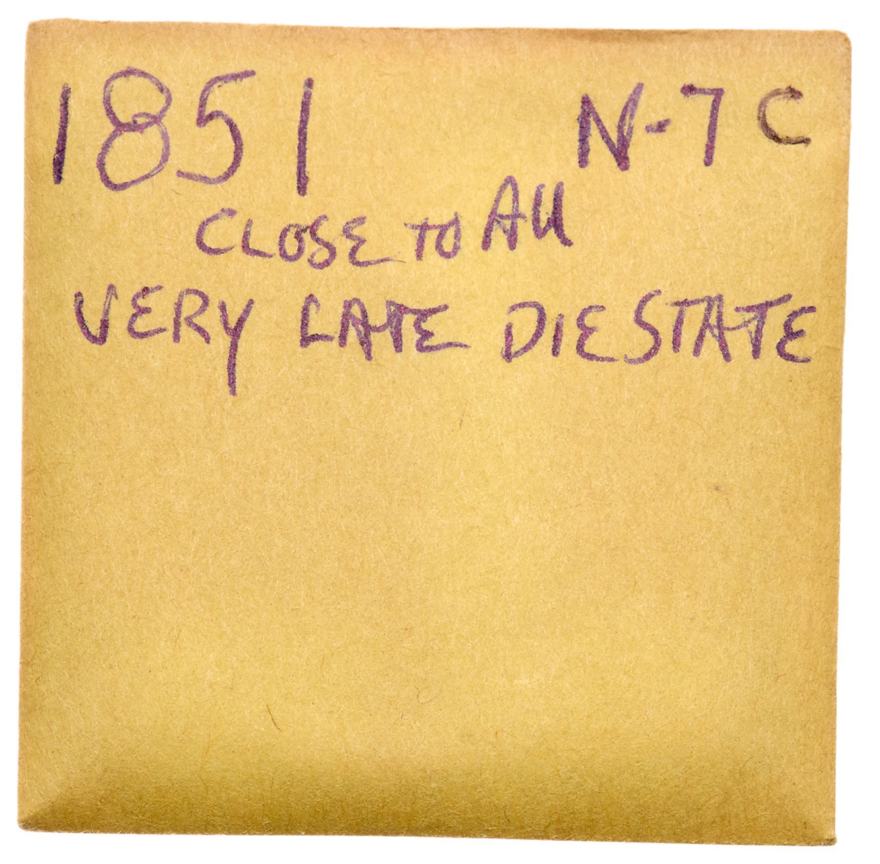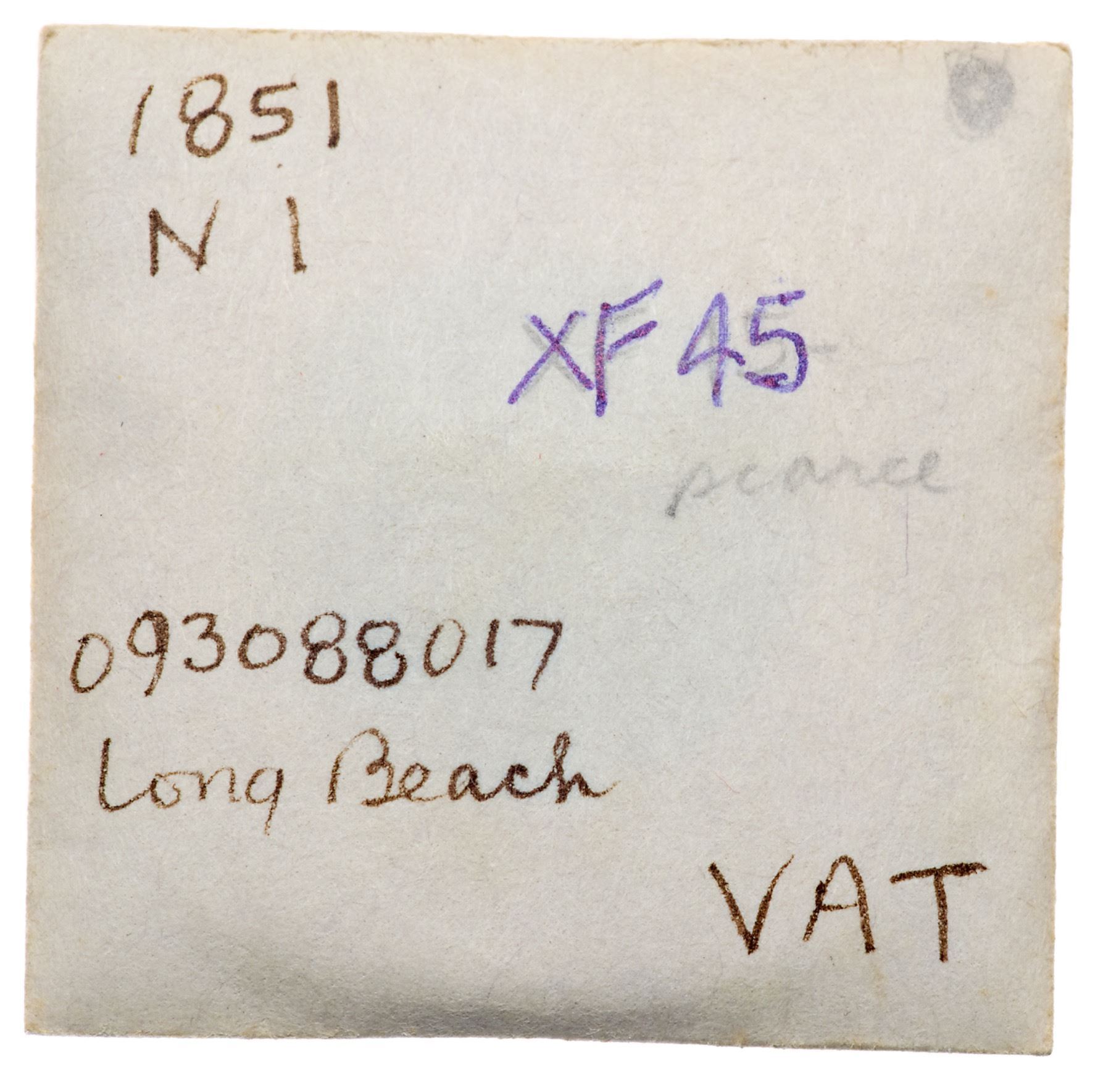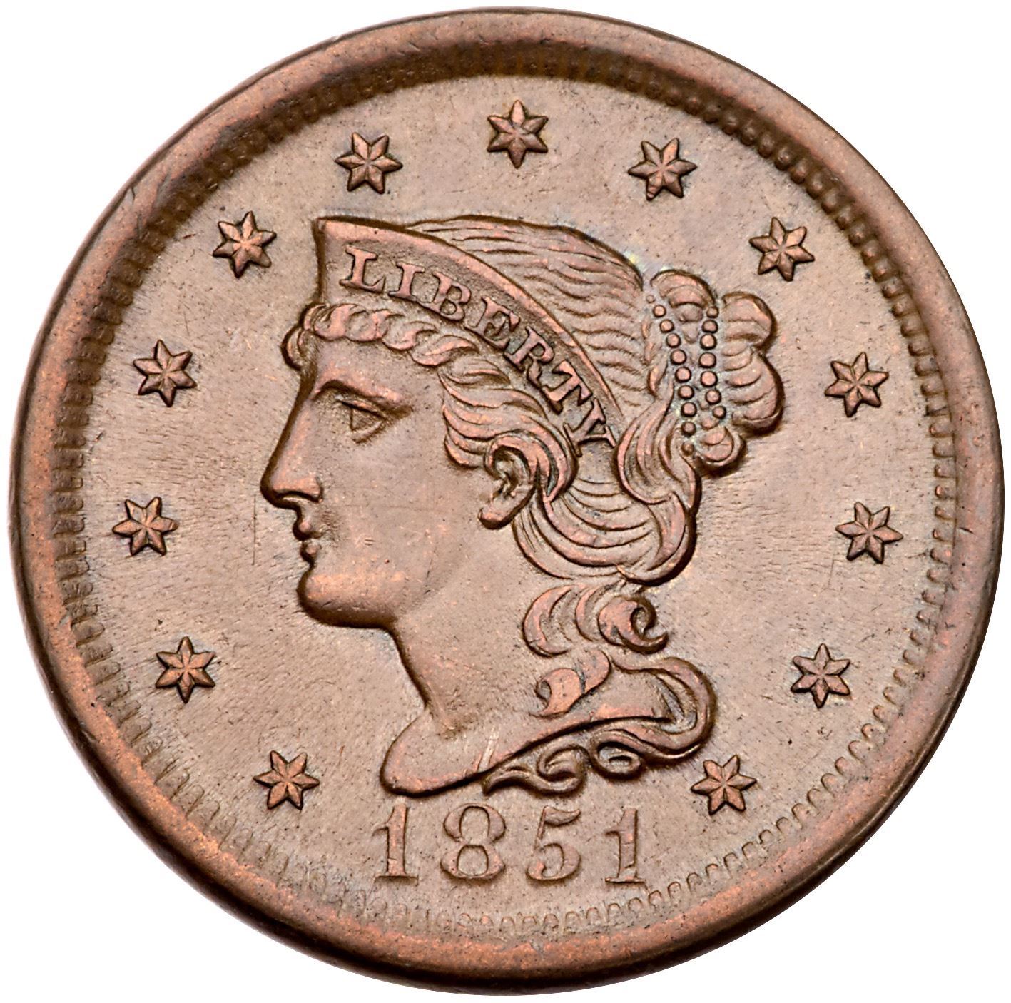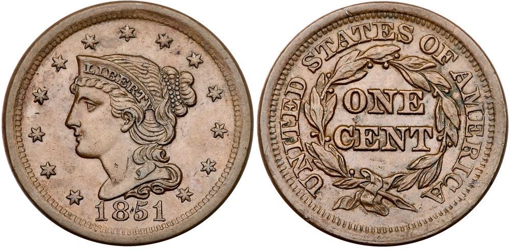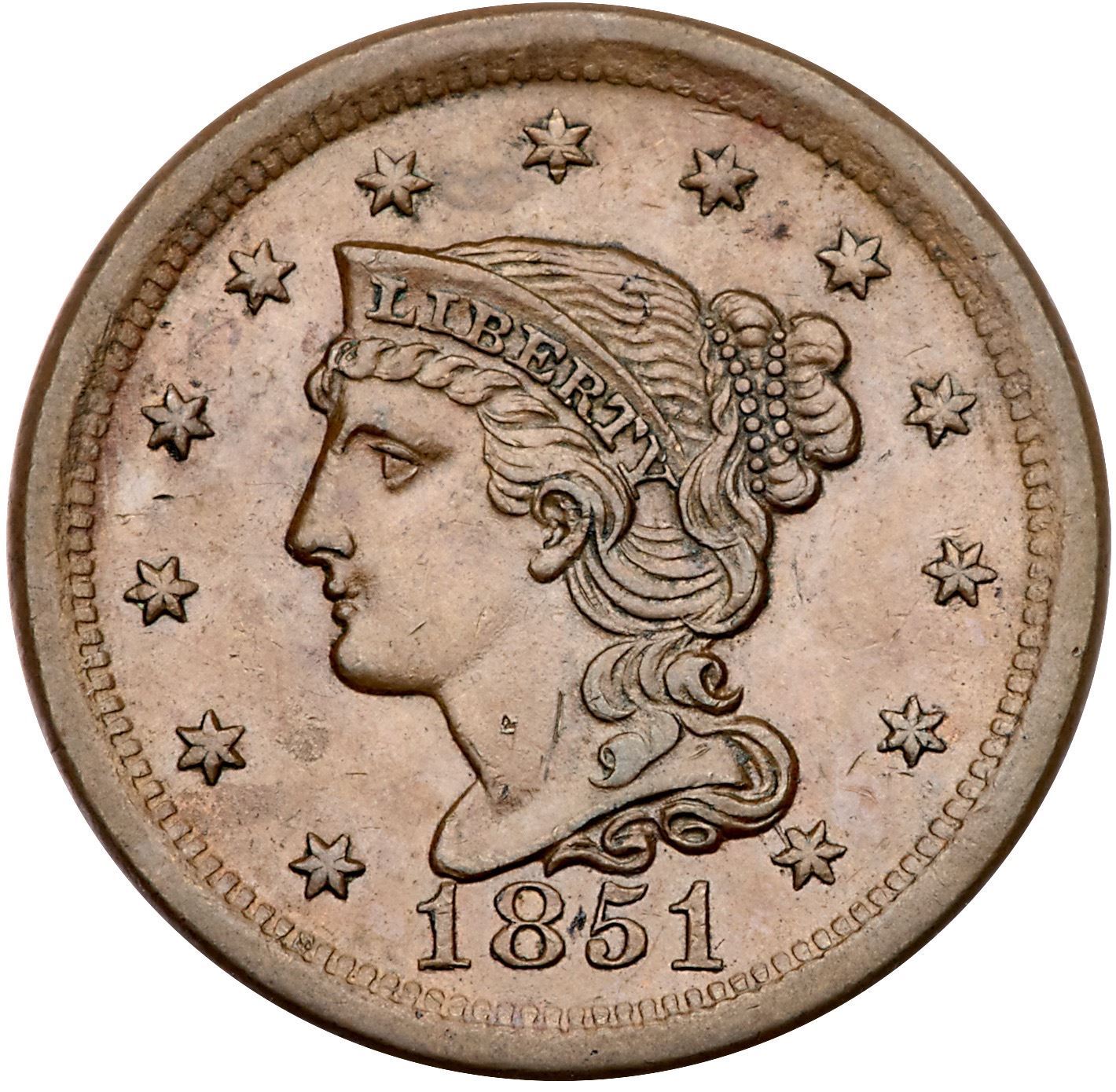 Pair of 1851 Cents grading EF40 to EF45Includes N-1 R3 Repunched 18 MDS (b) and N-7 R1 M-LDS (a+). Both are very slightly sharper with minor marks, and both have very attractive glossy brown and light chocolate toning with mint frost in protected areas. Lot of 2 coins.Pedigree: From the Fred H. Borcherdt Collection