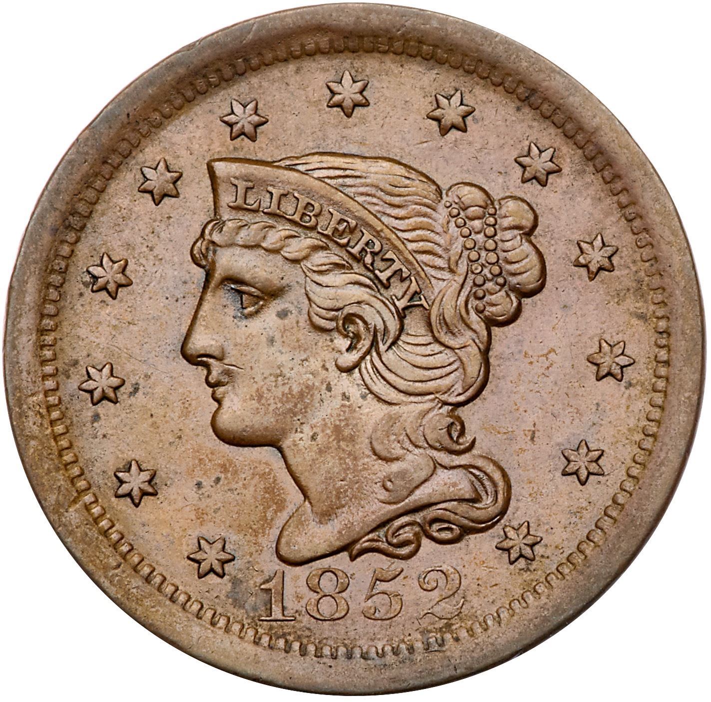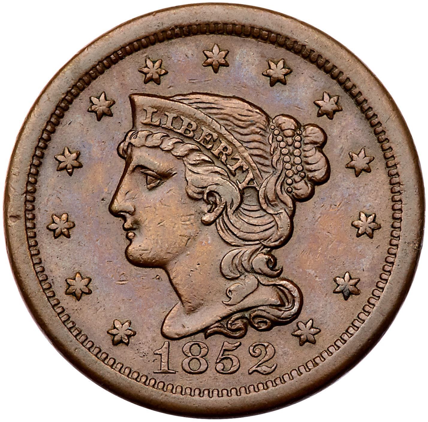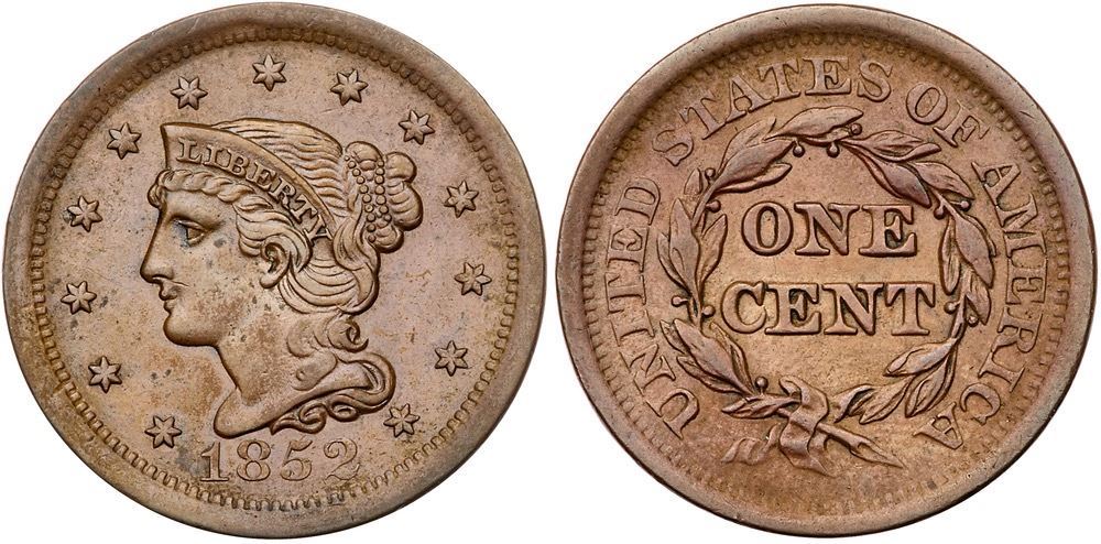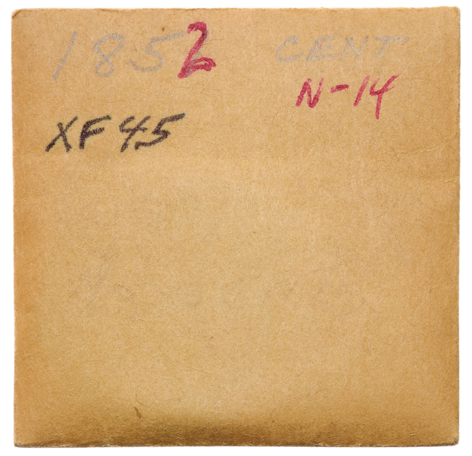 Pair of 1852 Cents grading EF40Includes N-14 R1 Repunched Date M-LDS (d), and N-15 R3 Scarce EDS (a) with fine die lines at the bottom of the N in ONE. Both are choice glossy medium brown and light chocolate with smooth surfaces. Lot of 2 coins.Pedigree: From the Fred H. Borcherdt Collection