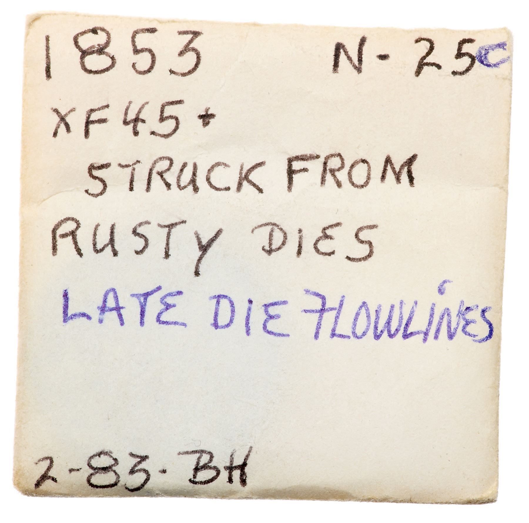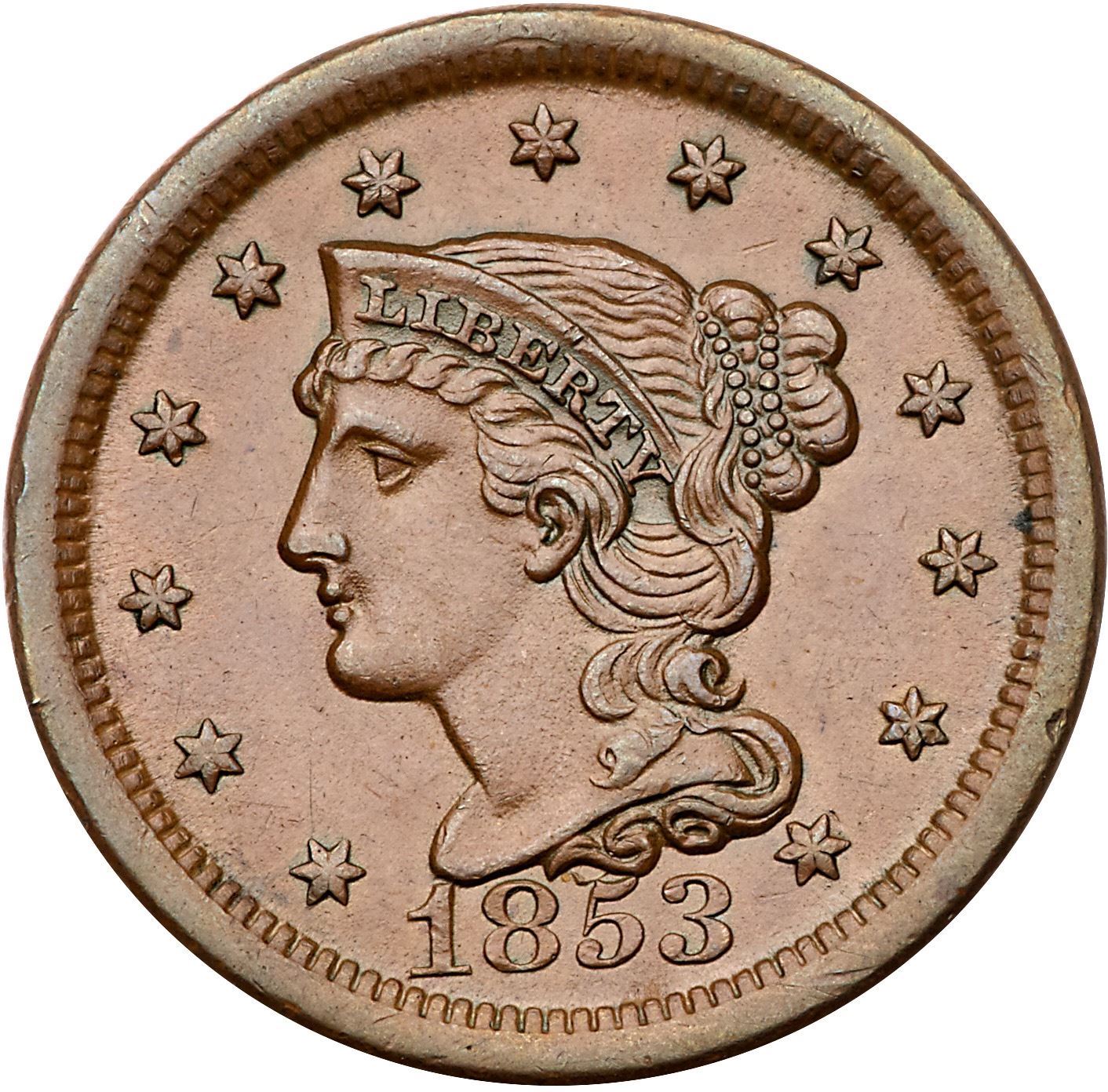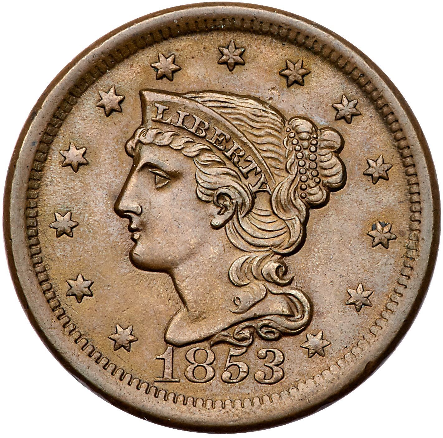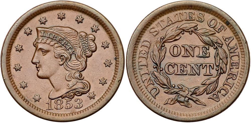 Pair of 1853 Cents grading EF45+Includes N-15 R2 Repunched 5 M-LDS (b), and N-25 R1 Repunched 1 M-LDS (b+). Both are choice with smooth surfaces and very attractive glossy brown and chocolate toning that is accented by mint frost in protected areas. Lot of 2 coins.Pedigree: From the Fred H. Borcherdt Collection
