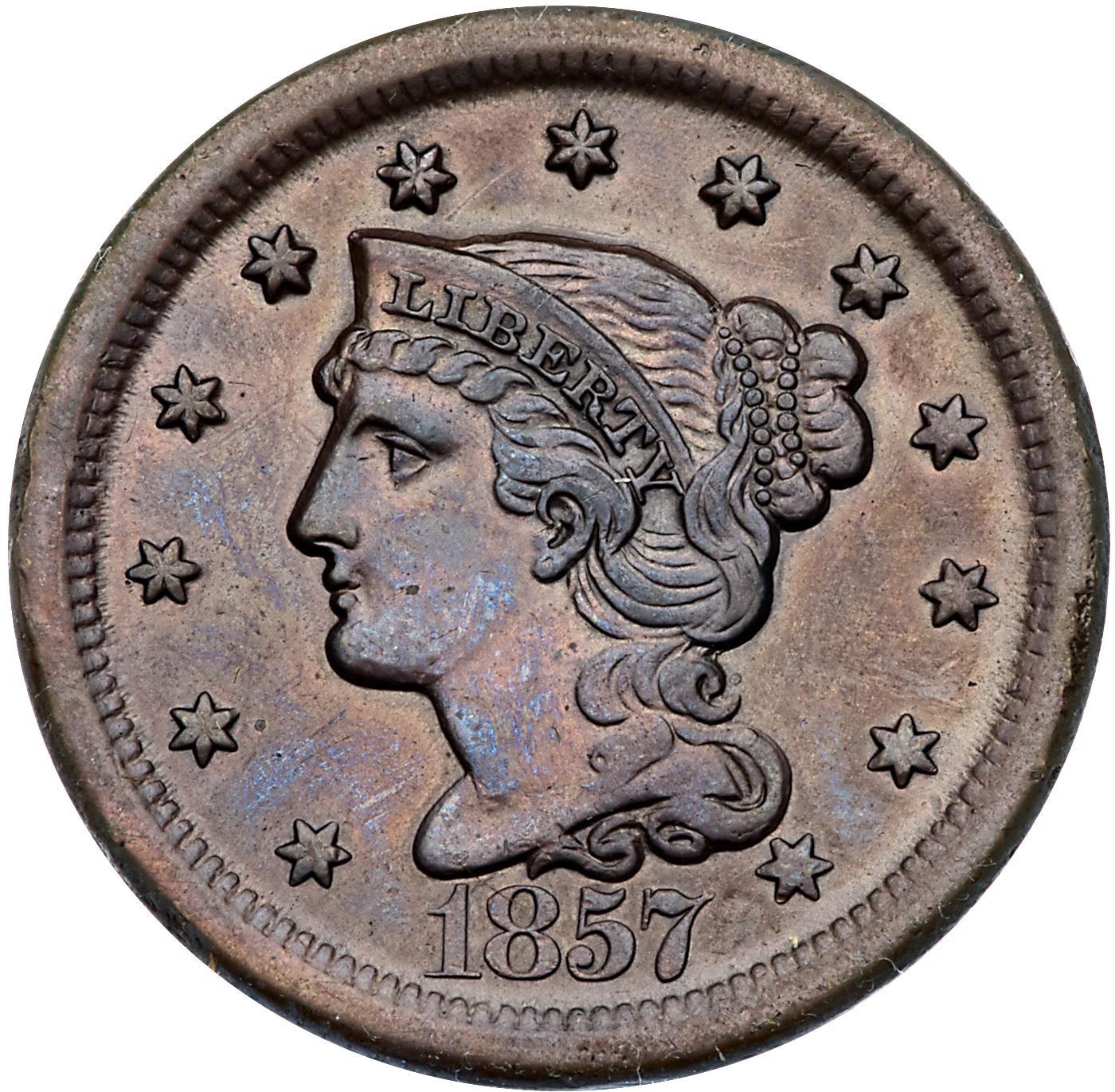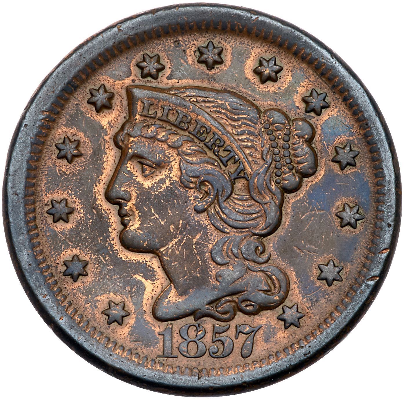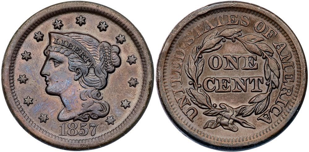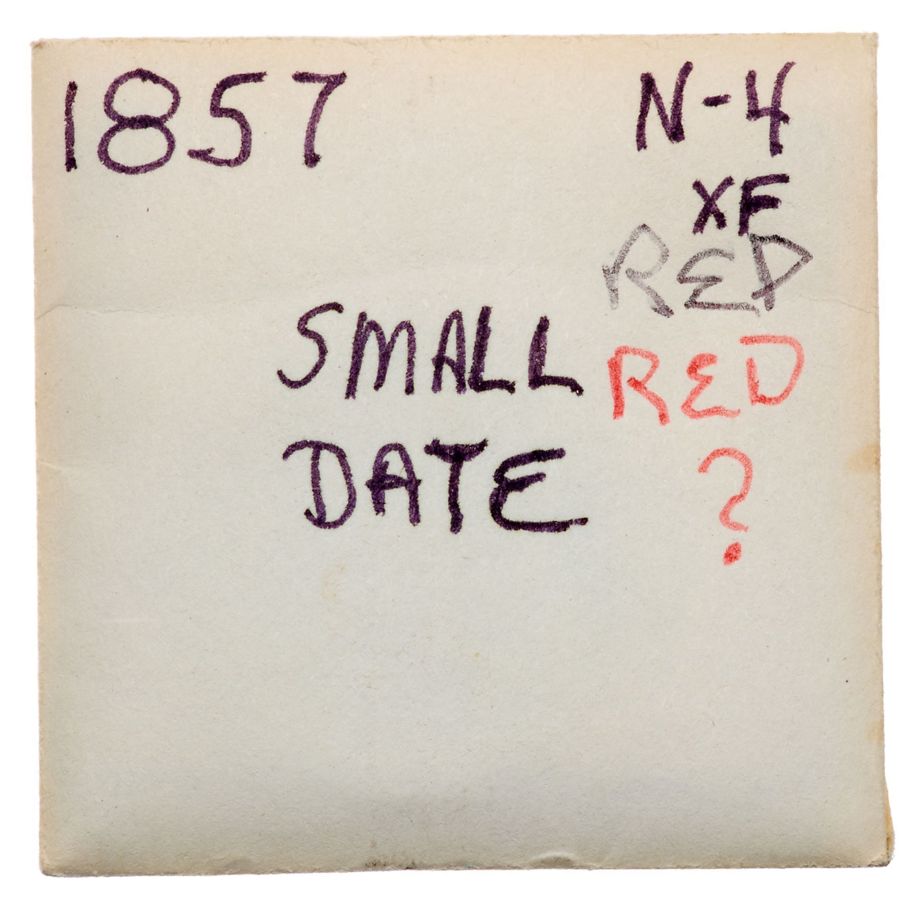 Pair of 1857 N-1 R1 Large Date CentsThe first is EF40 sharpness net F15 for rim dents and recoloring; the second is EF40 sharpness net VF20 for cleaning and poor retoning. Both are in the MDS (b) with smooth surfaces. Lot of 2 coinsPedigree: From the Fred H. Borcherdt Collection