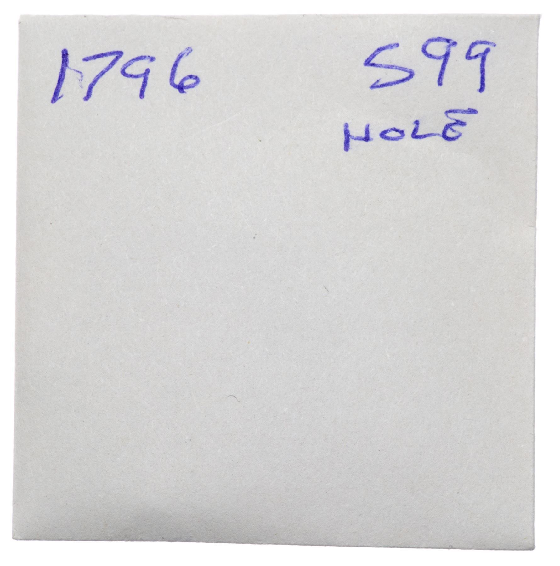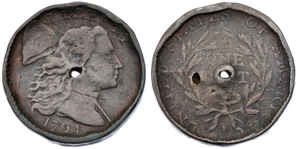Pair of Holed Large Cents 1794, 1796Pair of Holed cents, one 1794 S-64 LDS F15 net 1, the other a 1796 S-99 EDS VG8+ net 1. The 1794 has heavily rolled rims, and the 1796 has been cleaned with scattered specks of verdigris, but both have readable dates and most legends.Certificate Number: