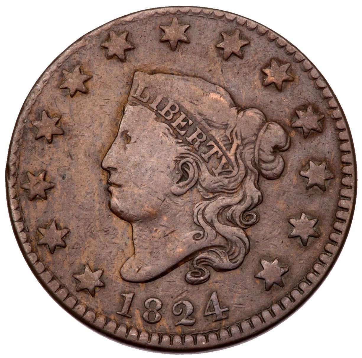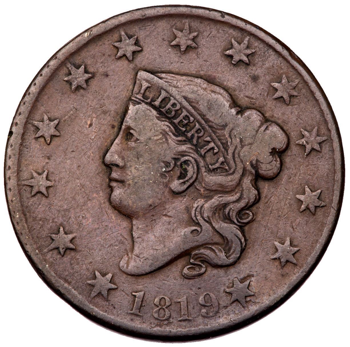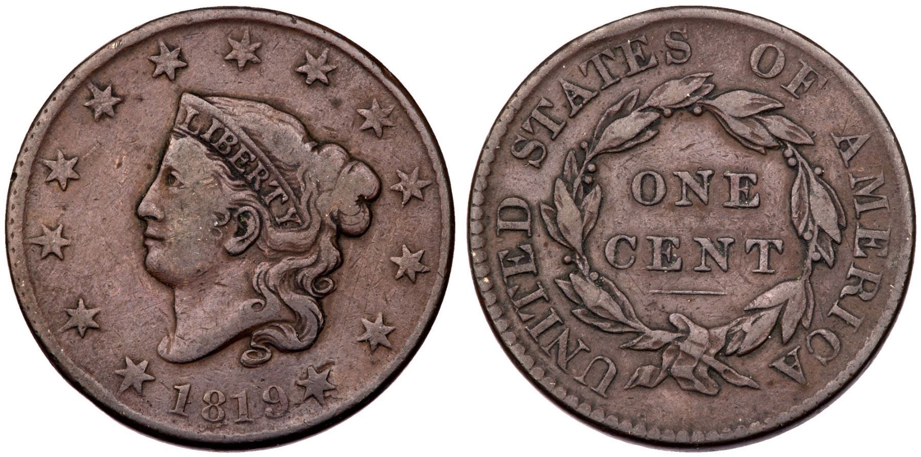 Pair of Matron Head Cents 1819 & 1824Lot of 2 Coins. Includes an 1819 and 1824, both sharper with minor surfaces issues, net grading F12.Certificate Number: Pedigree: