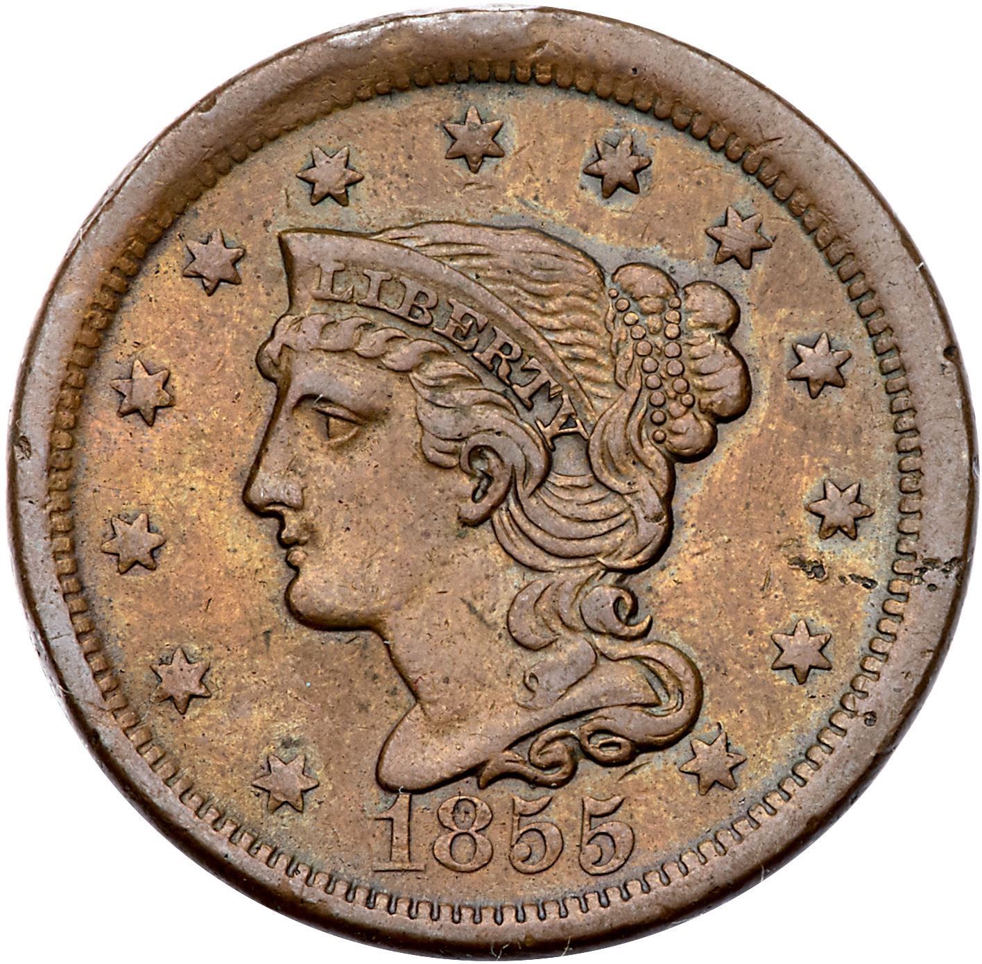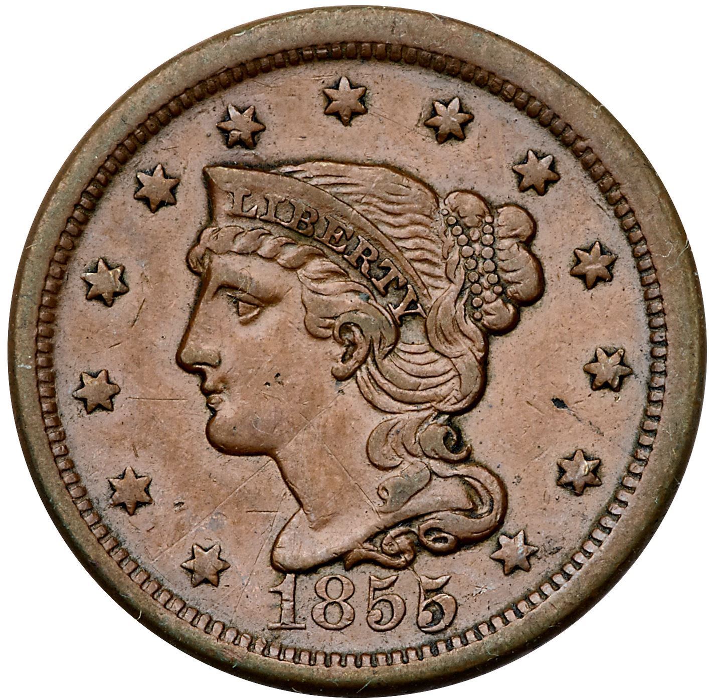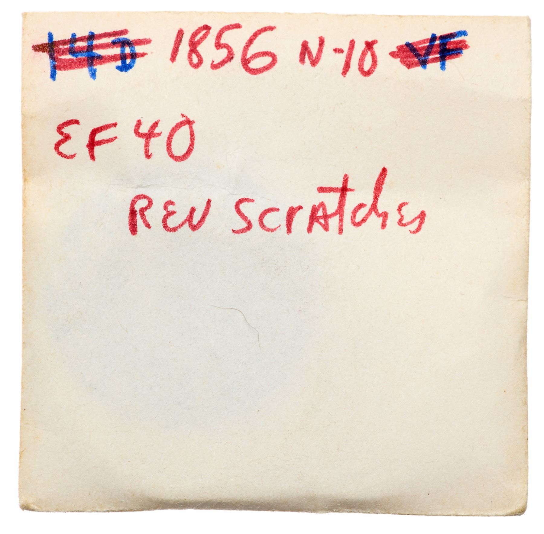 Quartet of 1855 & 1856 Cents grading VF25Includes 1855 N-8 R2 Upright 55 E-MDS, 1855 N-13 R3 Upright 55 EDS, 1855 N-13 R2 Upright 55 E-MDS, and 1856 N-10 R1 Upright 5 MDS. All are sharper with defects and have glossy brown and light chocolate toning. Lot of 4 coins.Pedigree: From the Fred H. Borcherdt Collection