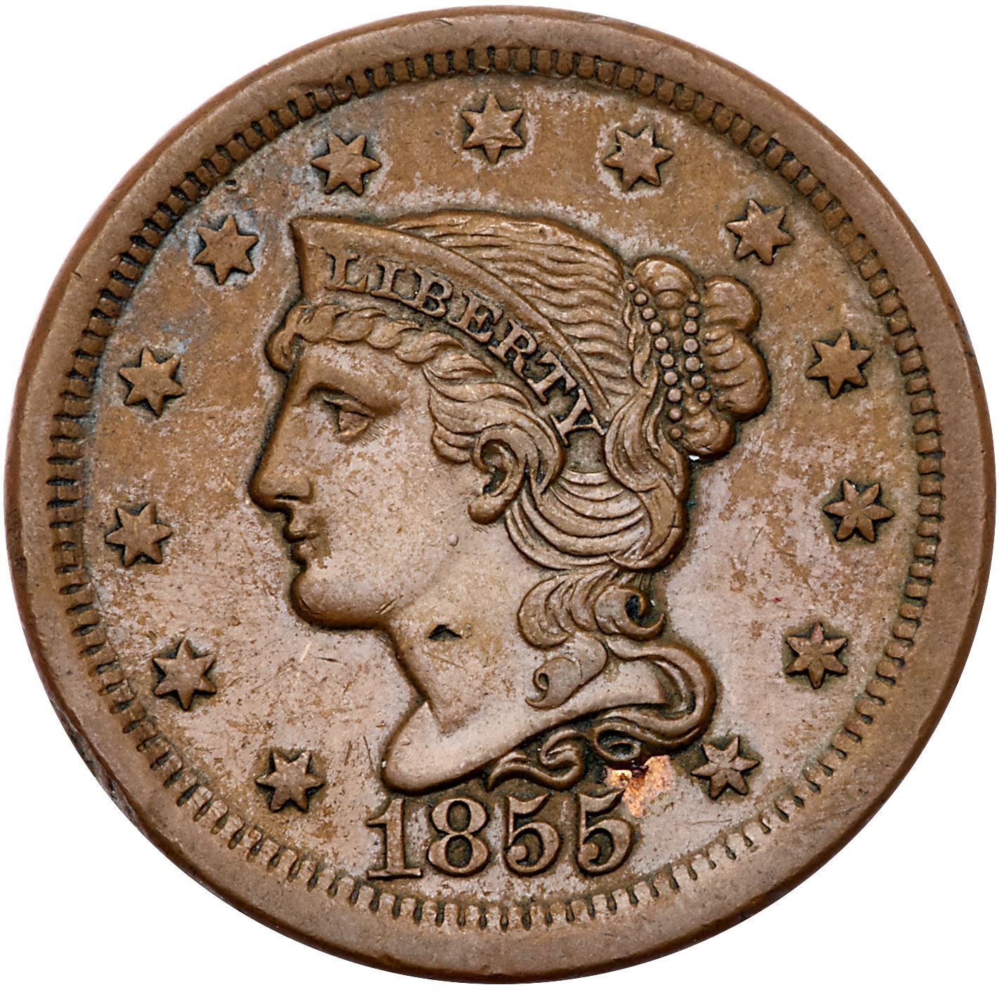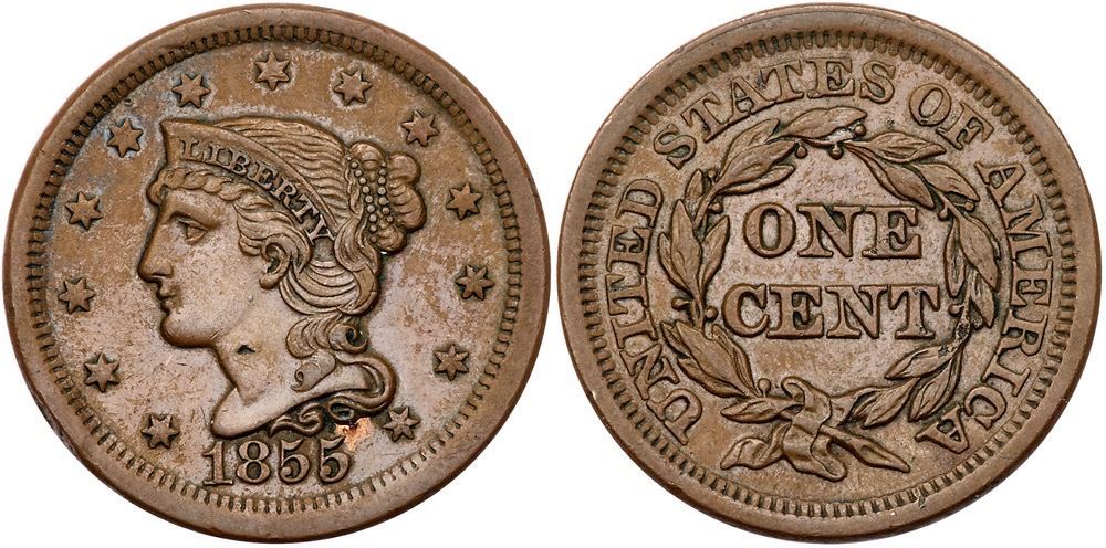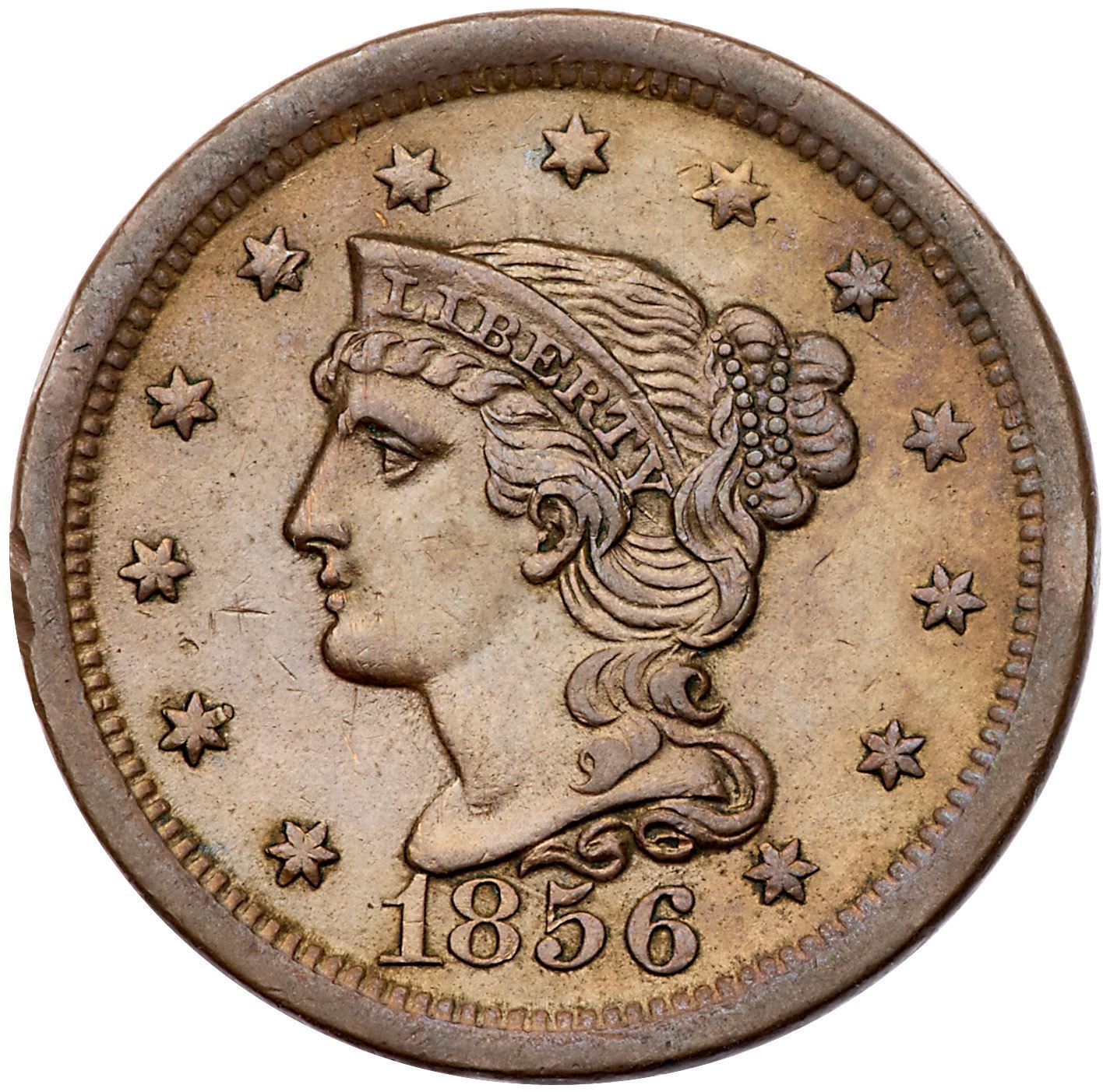 Quartet of 1855 & 1856 Cents grading VF25Includes 1855 N-8 R2 Upright 55 E-MDS, 1855 N-13 R3 Upright 55 EDS, 1855 N-13 R2 Upright 55 E-MDS, and 1856 N-10 R1 Upright 5 MDS. All are sharper with defects and have glossy brown and light chocolate toning. Lot of 4 coins.Pedigree: From the Fred H. Borcherdt Collection