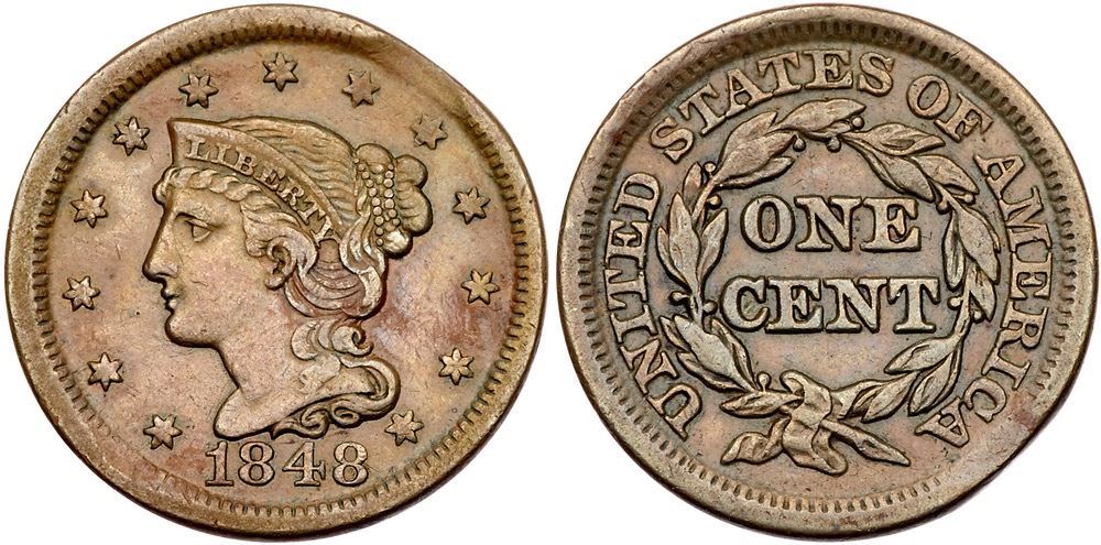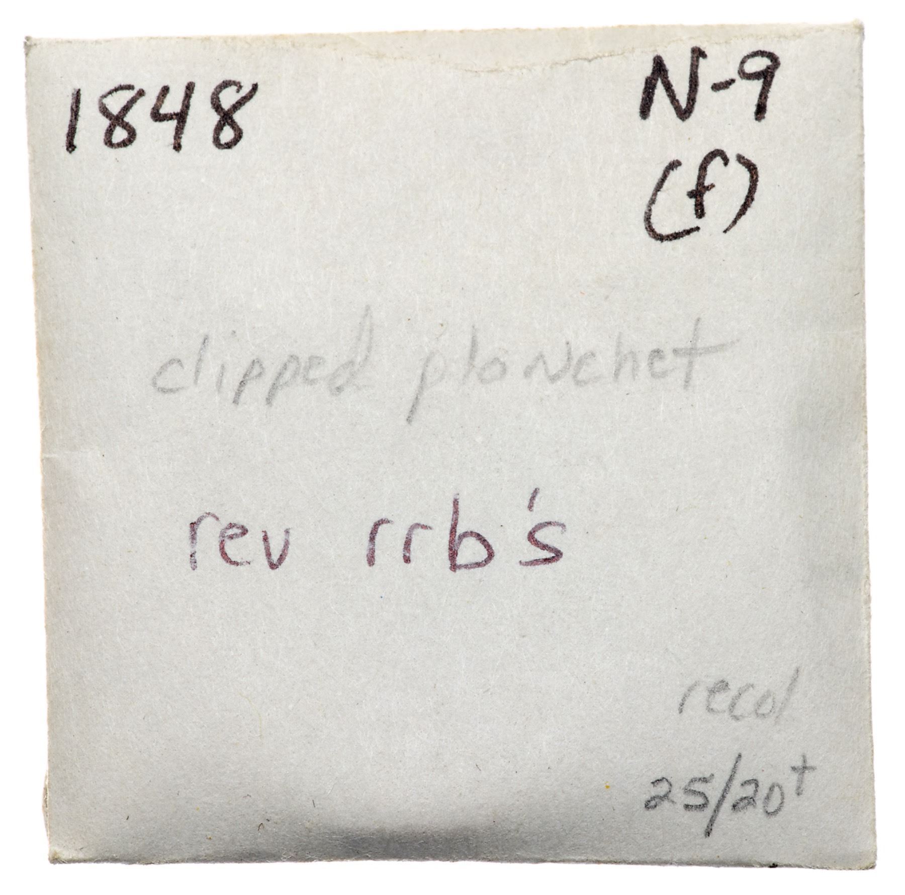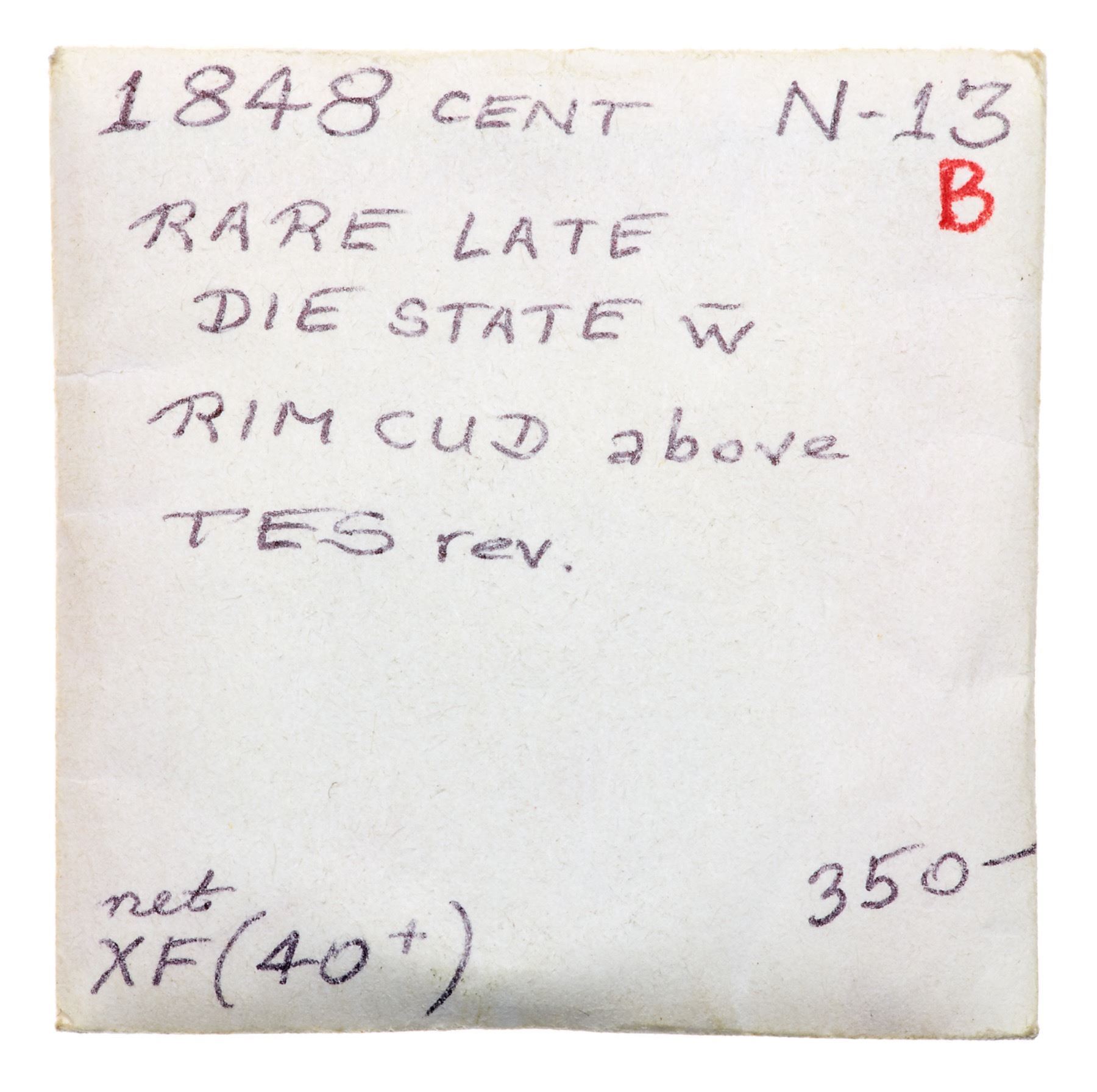 Trio of 1848 Cents with Rim CudsIncludes N-9 R1 LDS (f) with rim cuds at D-STATE (the cuds are partially visible) VF25 with a minor planchet clip, N-11 R5 MDS (c) with a clearly defined rim cud at ES in STATES VF25+ net VF20 for retoning, and N-13 R4+ LDS (b) with a strong rim cud above TES. All are glossy steel brown and chocolate with smooth surfaces. Lot of 3 coins.Pedigree: From the Fred H. Borcherdt Collection