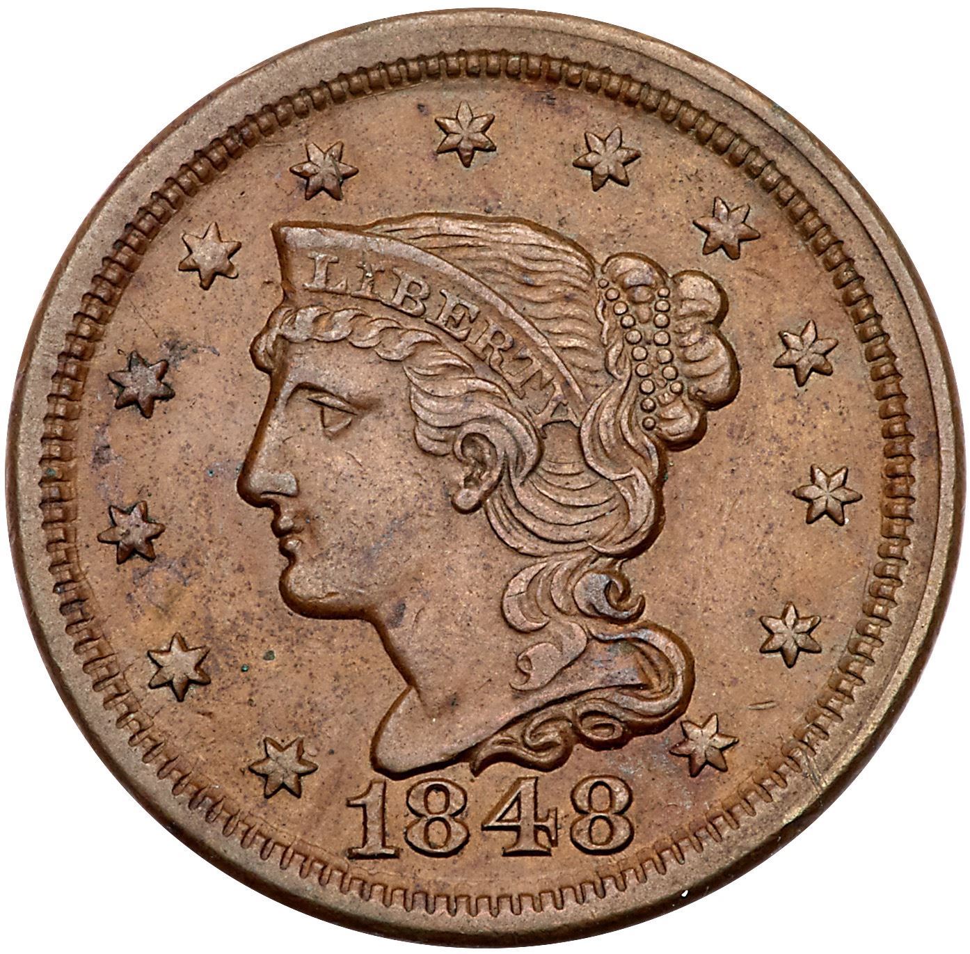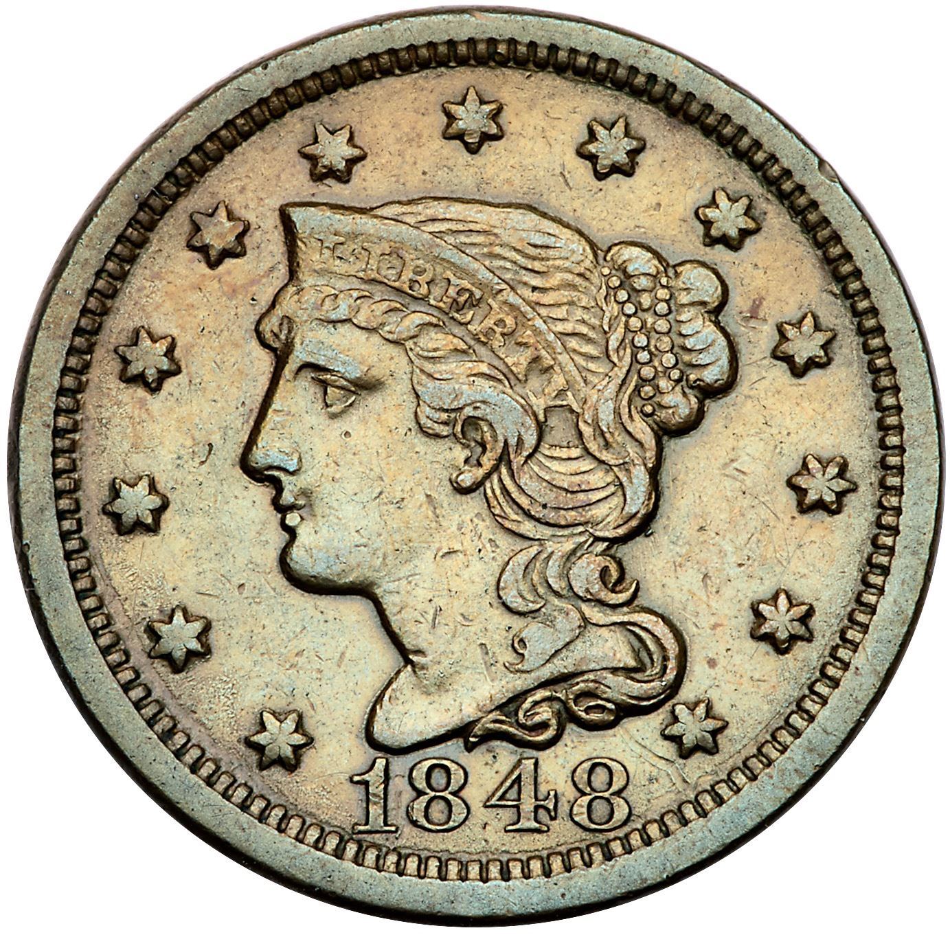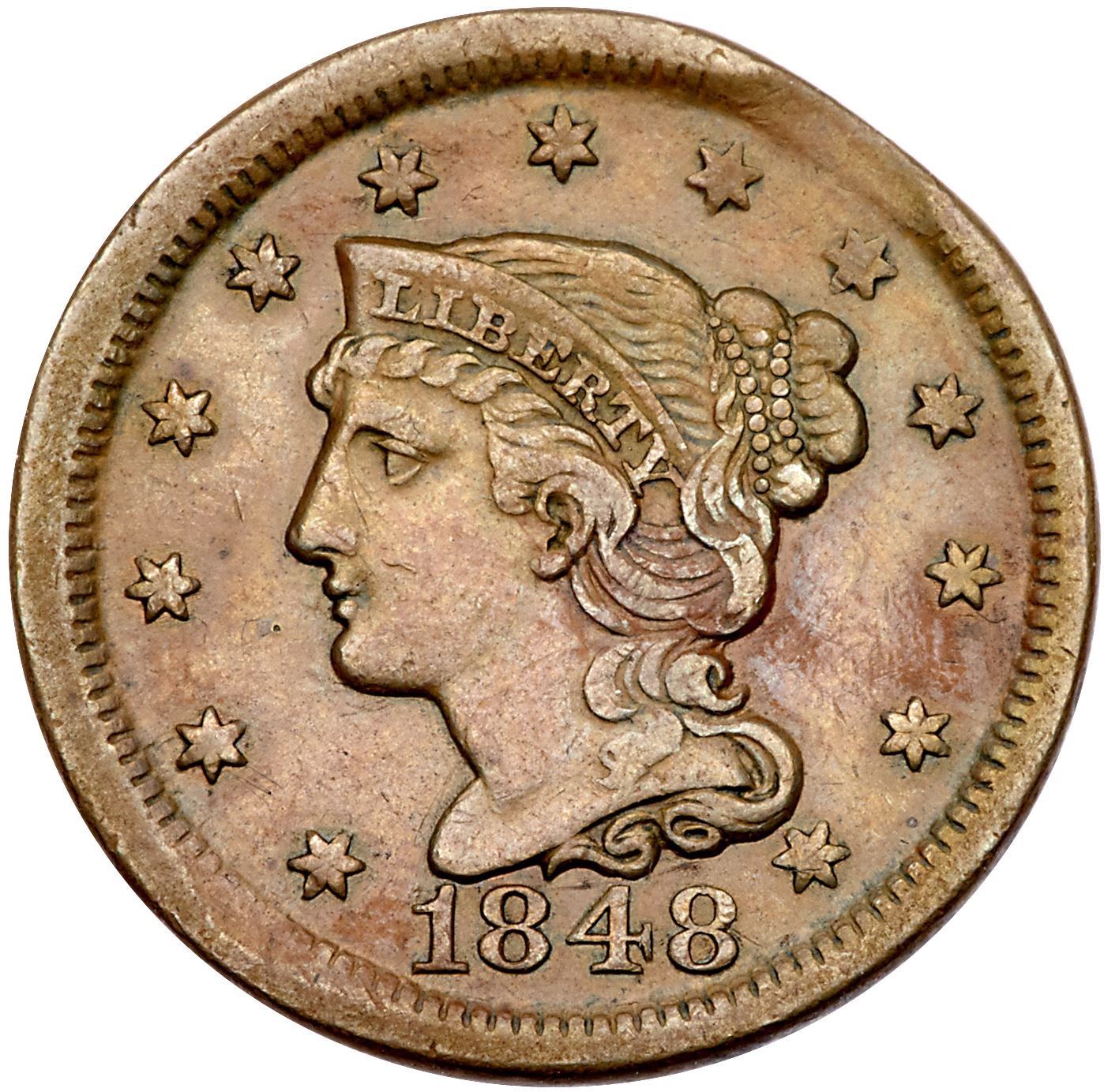 Trio of 1848 Cents with Rim CudsIncludes N-9 R1 LDS (f) with rim cuds at D-STATE (the cuds are partially visible) VF25 with a minor planchet clip, N-11 R5 MDS (c) with a clearly defined rim cud at ES in STATES VF25+ net VF20 for retoning, and N-13 R4+ LDS (b) with a strong rim cud above TES. All are glossy steel brown and chocolate with smooth surfaces. Lot of 3 coins.Pedigree: From the Fred H. Borcherdt Collection