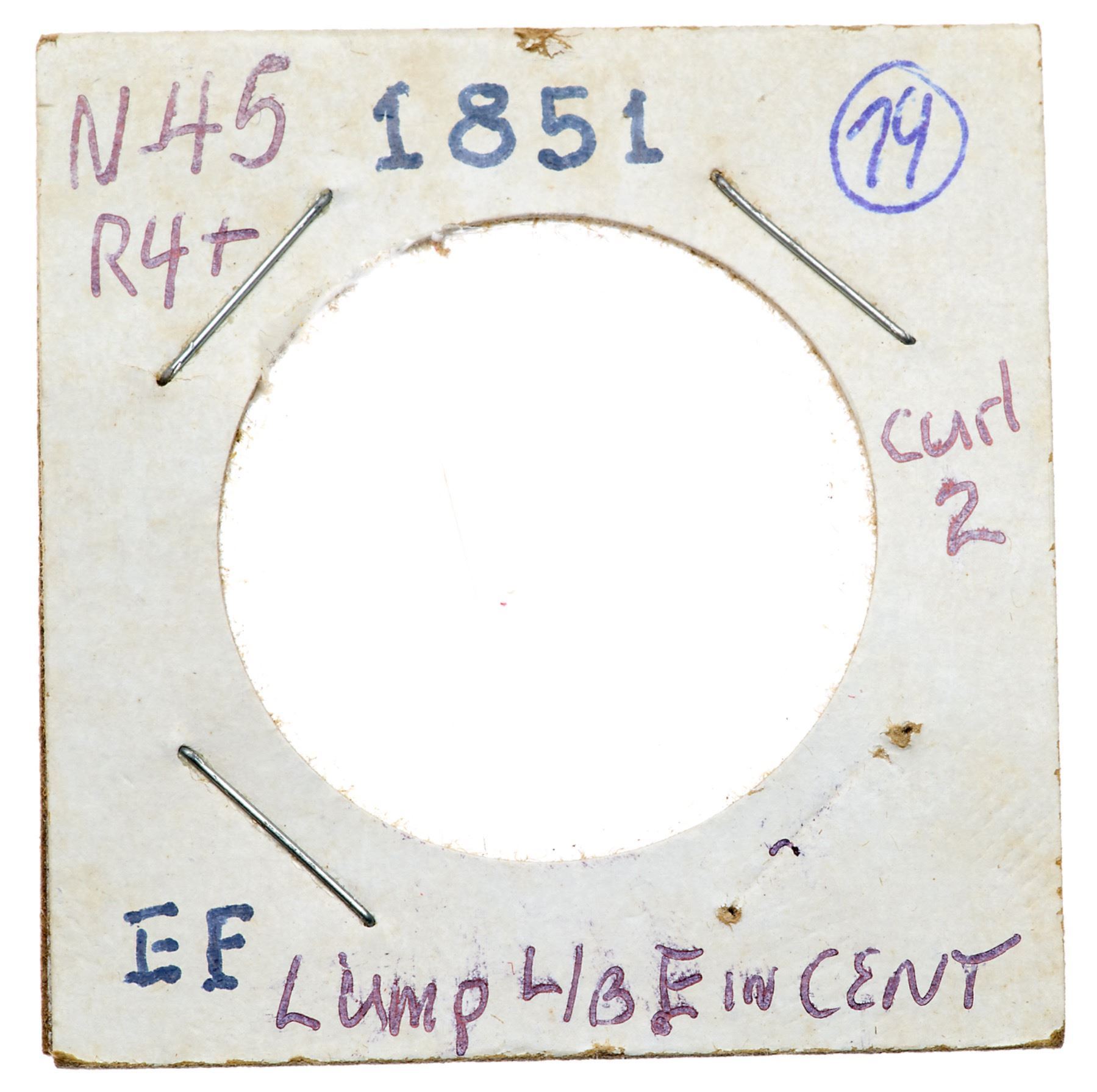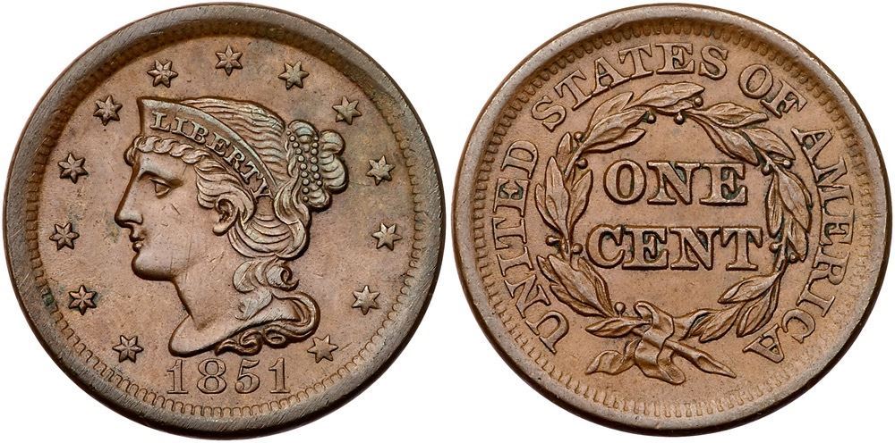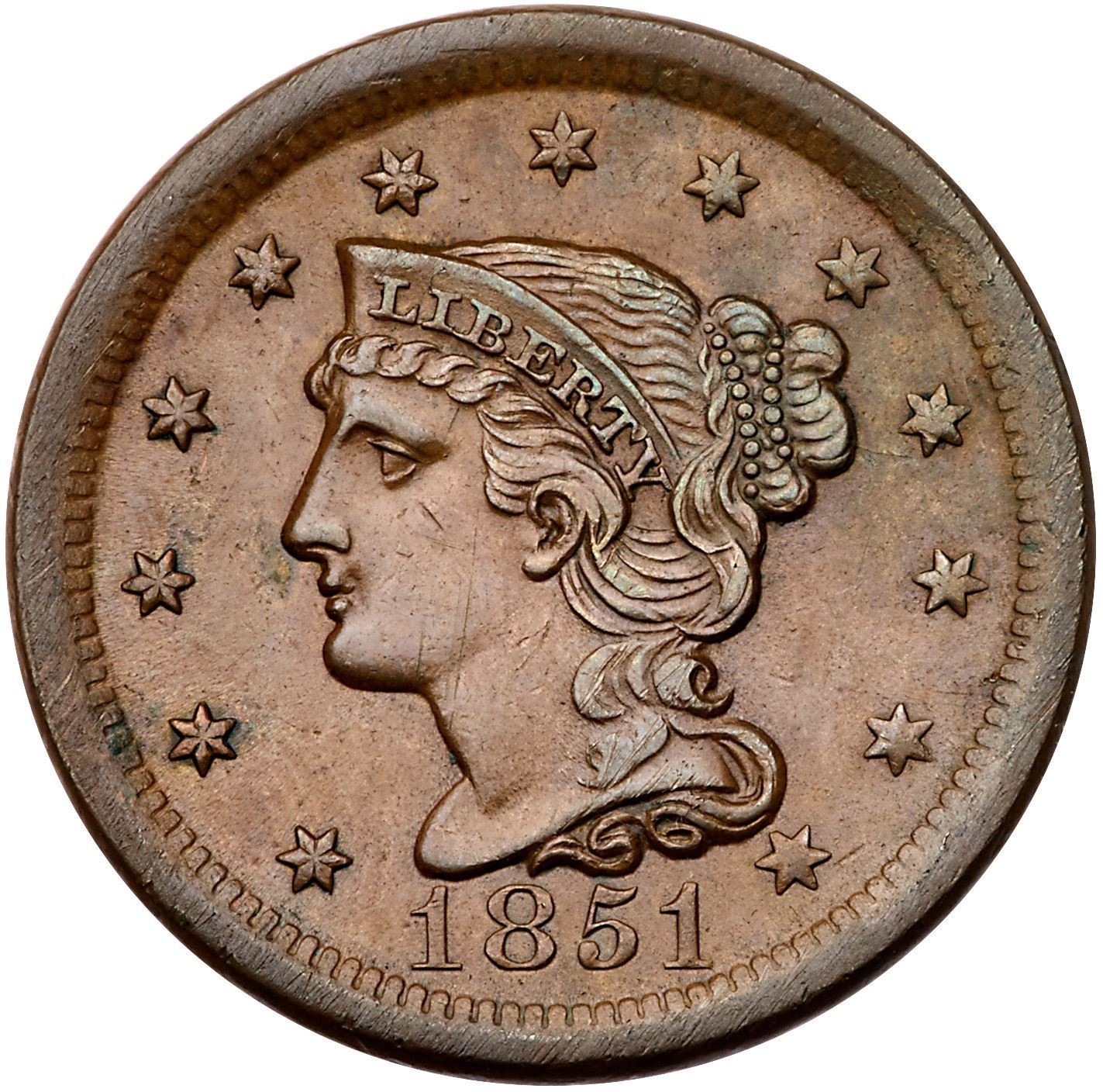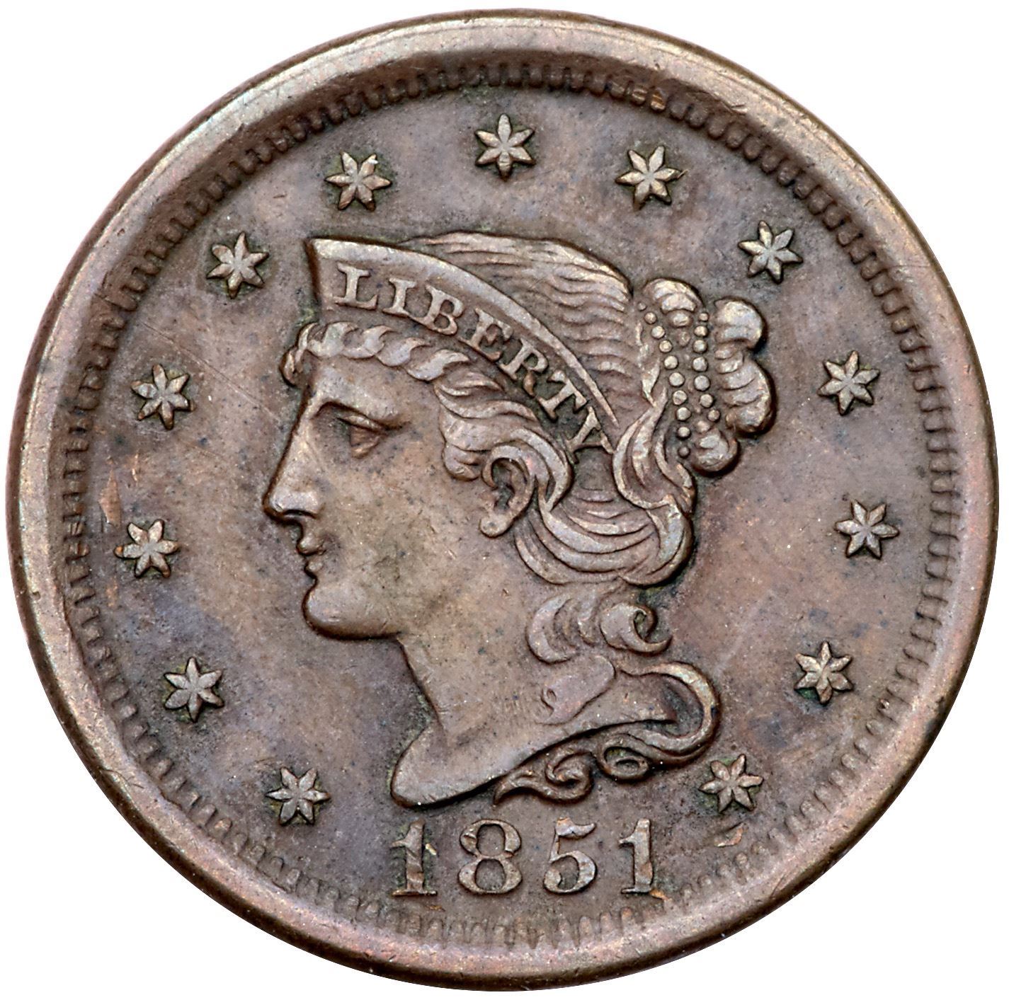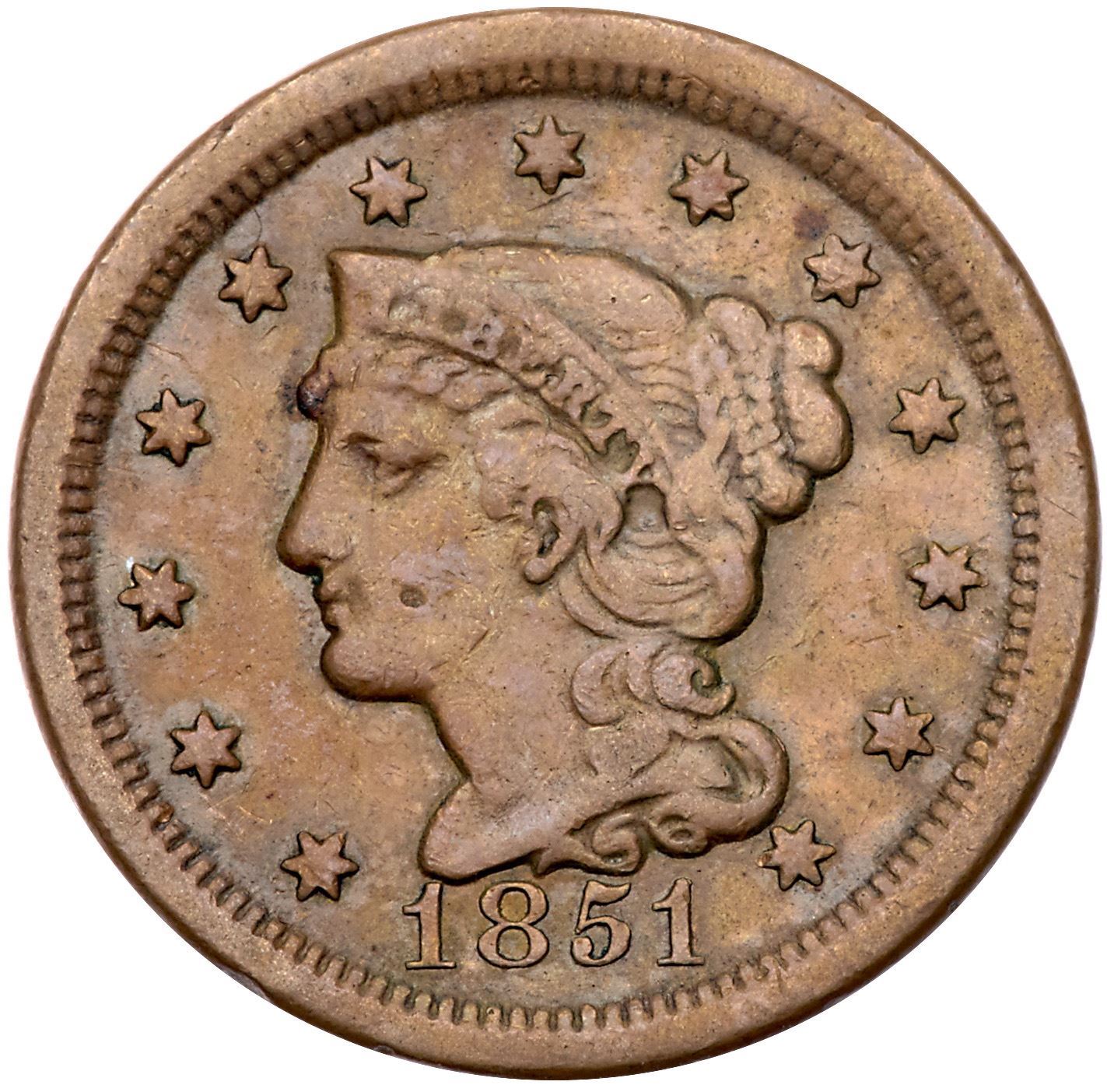 Trio of 1851 Cents grading VF25Includes N-33 R5 First 1 Repunched EDS (Rare), N-34 R4 MDS, and N-45 R4 LDS. All tough die varieties. A couple are slightly sharper with defects but all have glossy olive brown and chocolate toning. Lot of 3 coins.Pedigree: From the Fred H. Borcherdt Collection