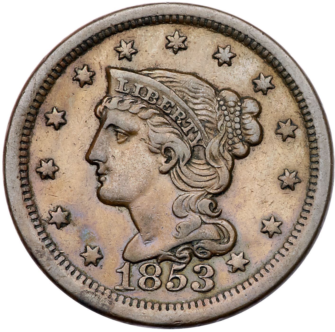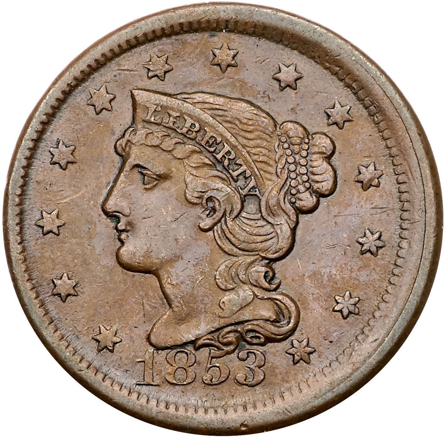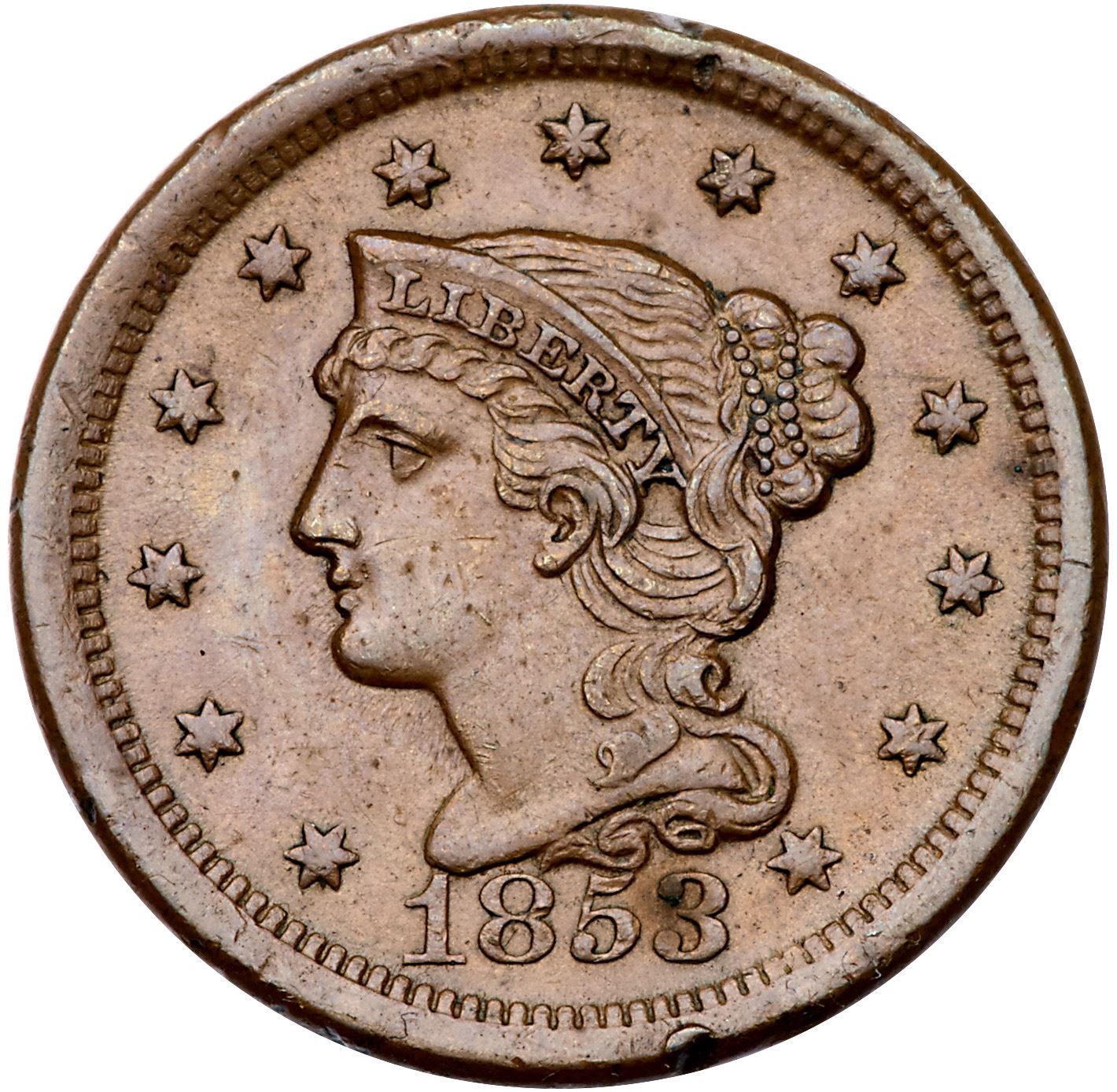 Trio of 1853 Cents grading VF30Includes N-19 R1 Repunched 853 LDS (c) with a misaligned obverse, N-25 R1 Repunched 1 Scarce EDS (a), and N-25 R1 Repunched 1 Rare LDS (c). The first two are choice; the last is slightly sharper with some obvious rim nicks. All are glossy brown and chocolate with smooth surfaces. Lot of 3 coins.Pedigree: From the Fred H. Borcherdt Collection