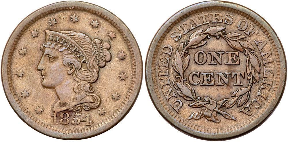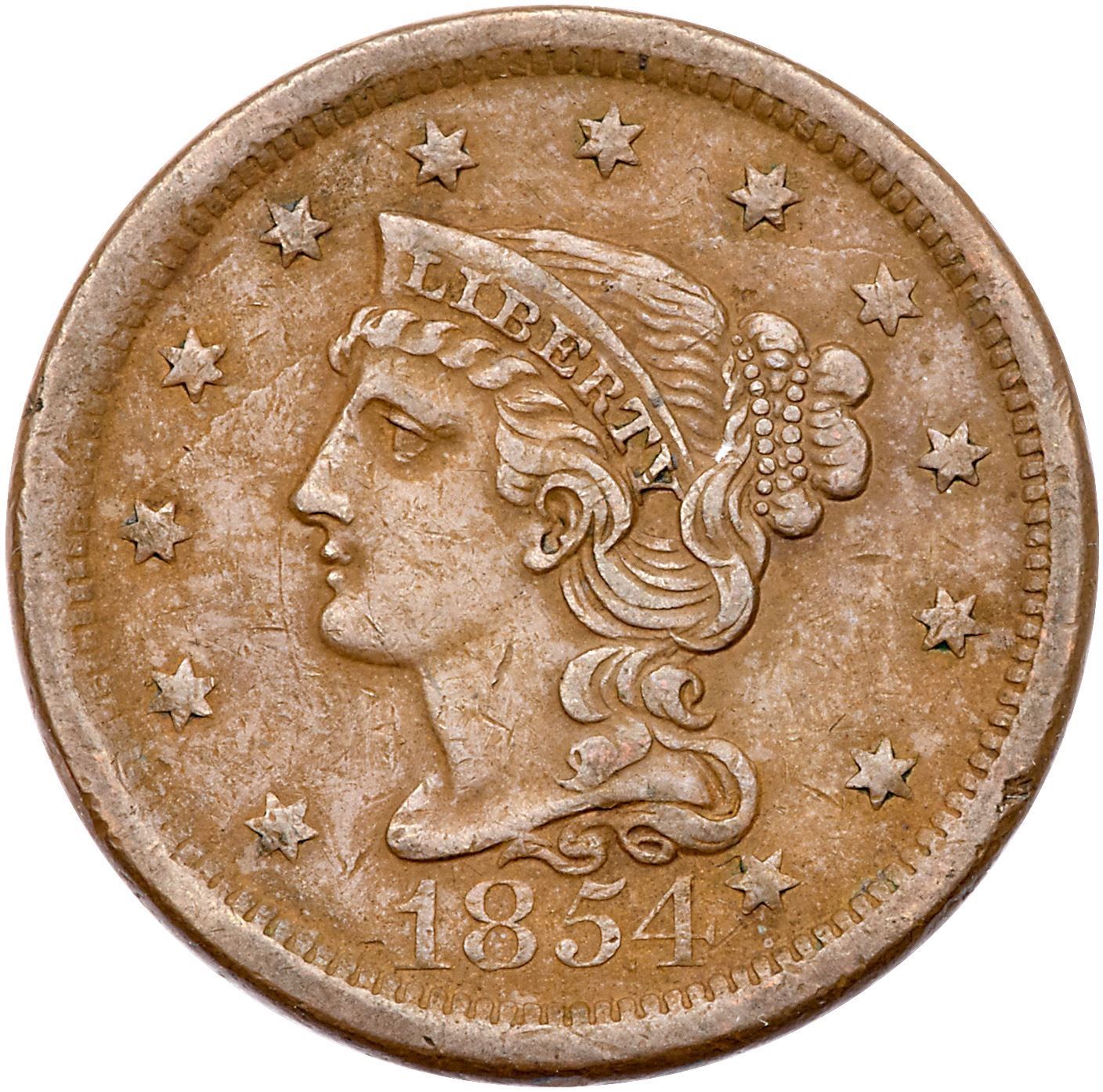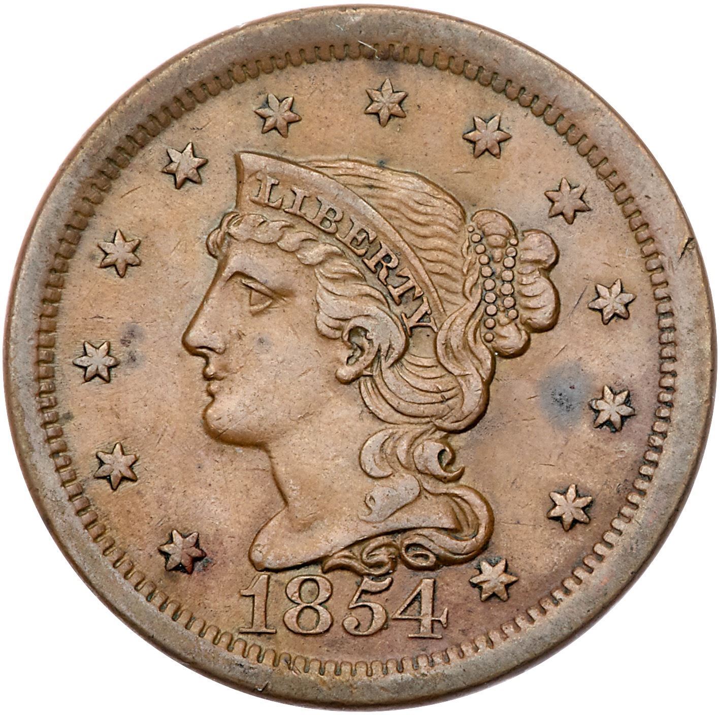 Trio of 1854 Cents grading VF30 to VF35Includes N-7 R2+ Repunched 1 & 4 LDS (b), N-9 R2 "Dartboard Obverse" MDS (b), and N-19 R3 MDS (b). A couple have trivial marks but all are attractive glossy medium brown and light chocolate. Lot of 3 coins.Pedigree: From the Fred H. Borcherdt Collection