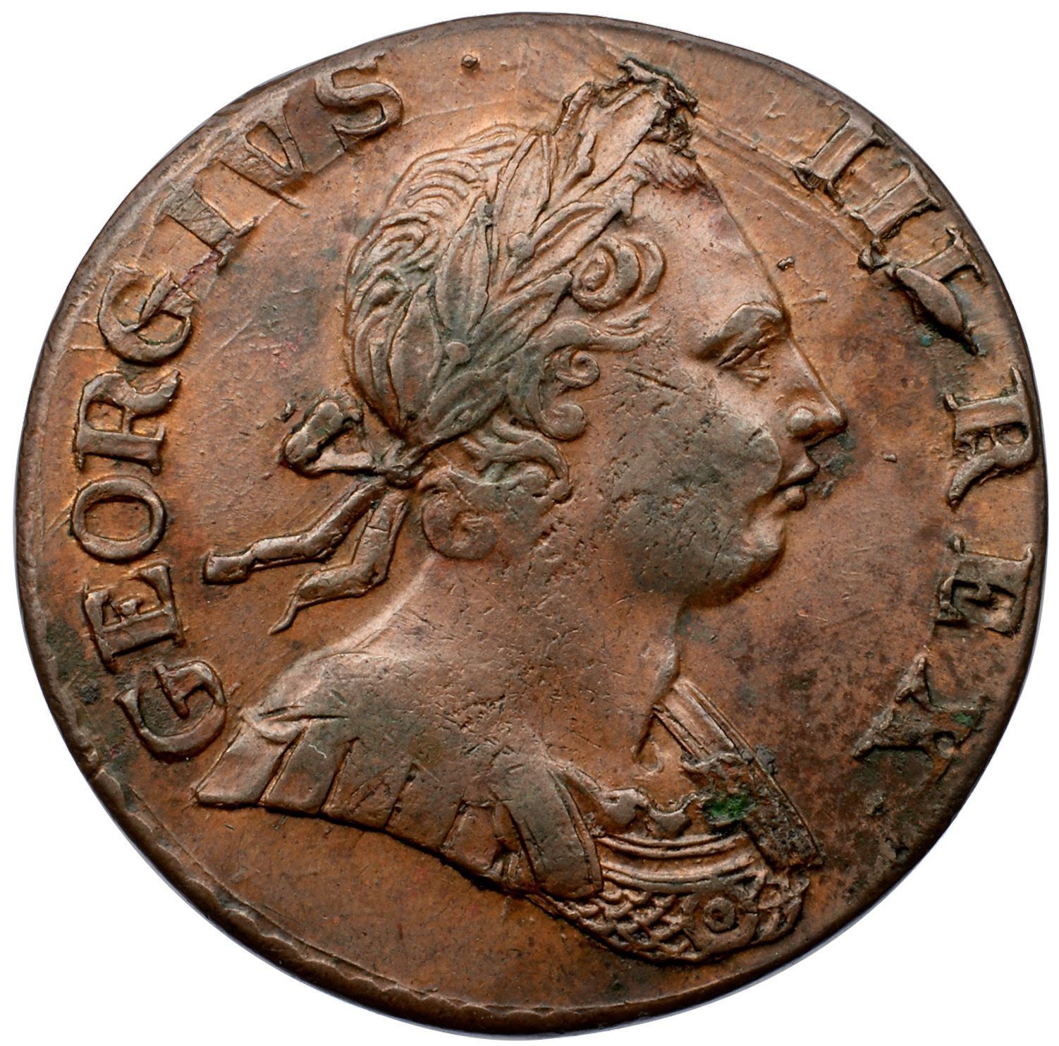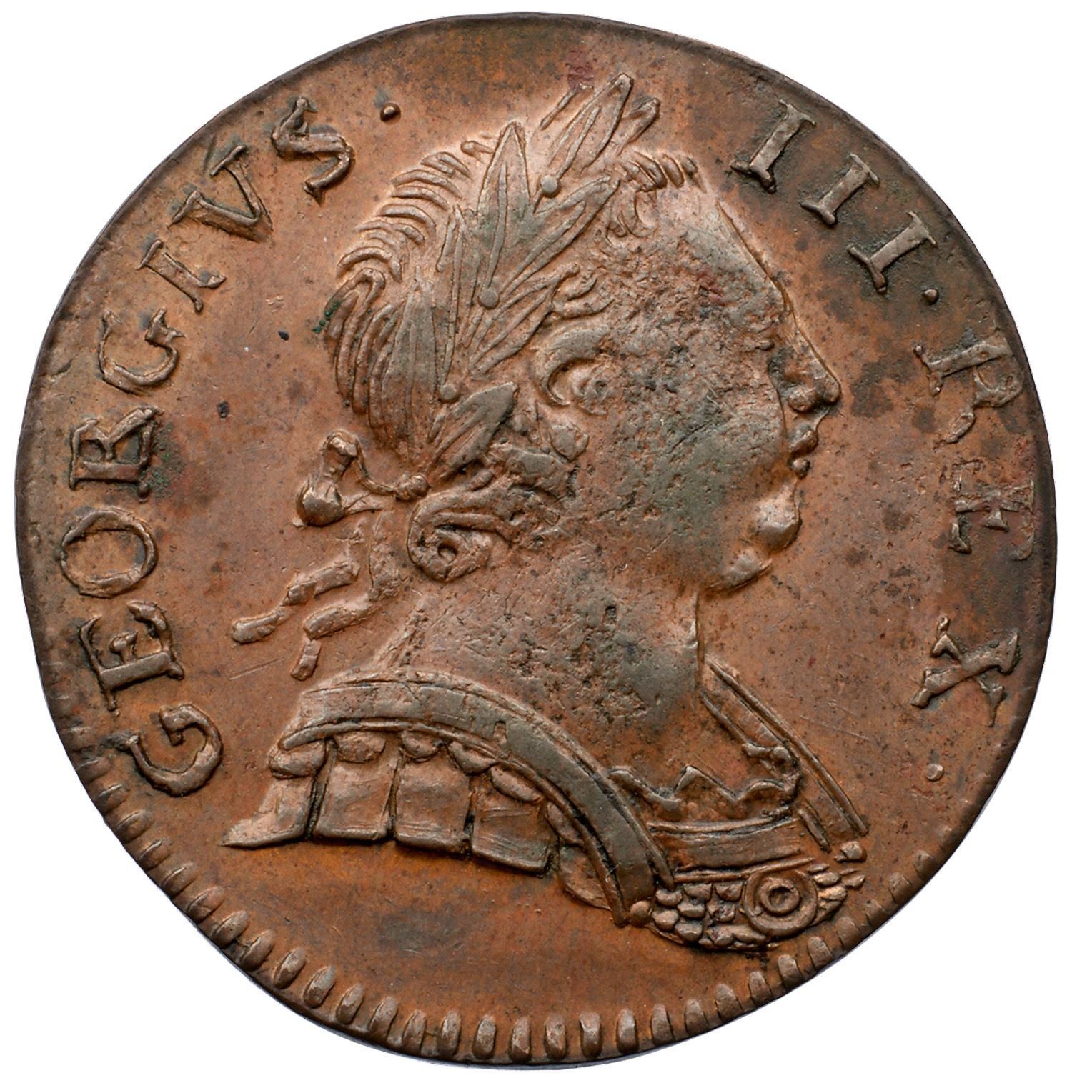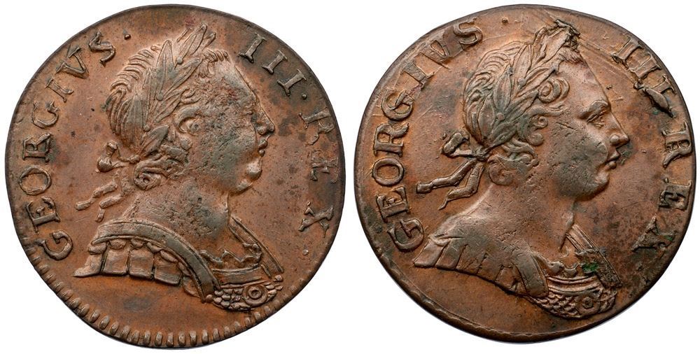 Undated Counterfeit British Halfpenny, Struck with Double Obverses. 138.6 grains.Choice Extremely Fine, a boldly struck example of a seldom-seen error, a coin struck from two obverse dies. While most “double headers†are actually made from two different coins that were ground down and joined together, real examples of this error can also be created in the striking process. The first way is through a brockage adhering to one die and acting like a die itself, that type of error has both sides from the same die, albeit the one struck from the brockage a bit flatter and weaker. The second method, found on the coin offered here, is both more rare and interesting, struck from two very different obverse dies that were (likely) inadvertently put into a press, instead of an obverse and a reverse die. Double reverse strikes are also known, one is offered earlier in this sale. Neither obverse die found on this coin is currently part of a published family, but both are known, one side with a heavy die break through the final ordinal and other smaller breaks, the other with a rounded “goiter†below the lips, halfway down an improbably large chin, and a die break closing the bottom of the R of GEORGIVS (this obverse is also known on a brockage strike in a private collection). While this is an error that didn’t happen often there are, amazingly, over a dozen different varieties of struck double obverse die pieces known, and slightly fewer different varieties of double reverses coins. Most of these double obverse or double reverse varieties have just one or two examples extant, and it was likely that the mistakes were caught early and corrected. Some did enter circulation, and a couple are quite well-worn, showing that people didn’t look at their pocket change too closely at the time – perhaps because they knew that ¾ or more of their coppers were going to be counterfeit anyway! But many of this type of error do exist in high grade, suggesting that they were saved as an oddity from nearly the beginning. The planchet on this one is particularly robust, approaching the weight of a regal coin. Deep tan, the surfaces glossy, though the centers of each side show roughness, and a few light marks, including a scratch on the cheek of one side, and light spotting. A very special coin from the Rothschild collection.