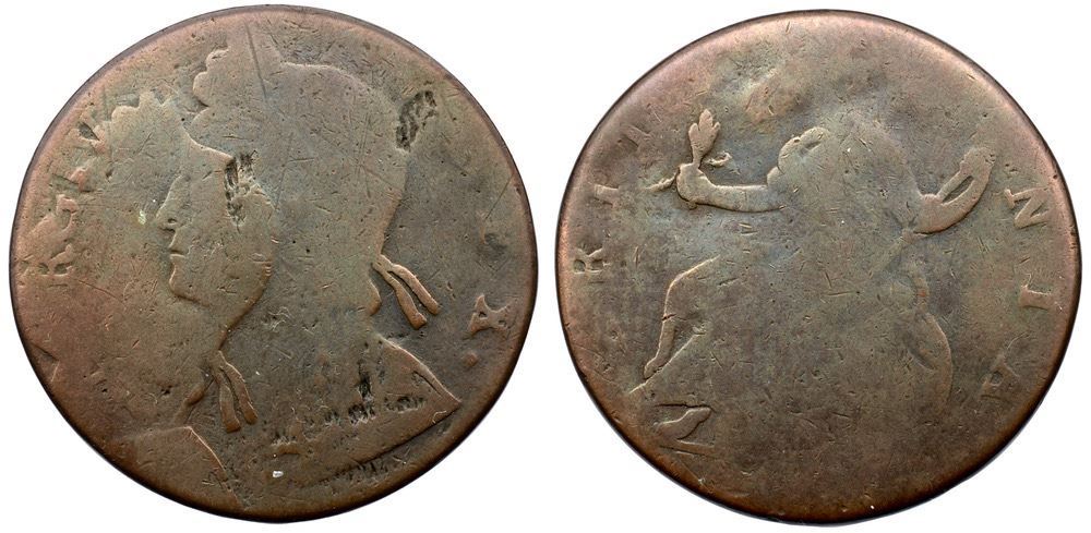Undated George II Counterfeit British Halfpenny, Double Struck, Flat Struck Family. 70.6 grains.