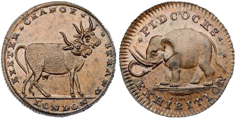 Reeded edge in brassy copper. Sharply struck. The two-headed cow and elephant are bold and the fields are reflective. Weight 93.2 grains, diameter 21mm.