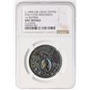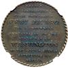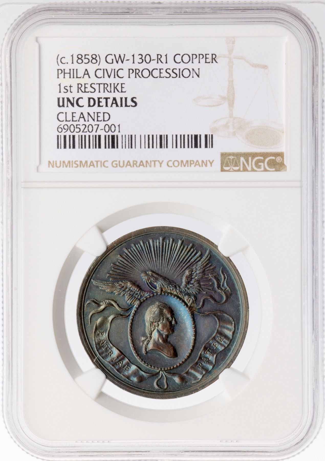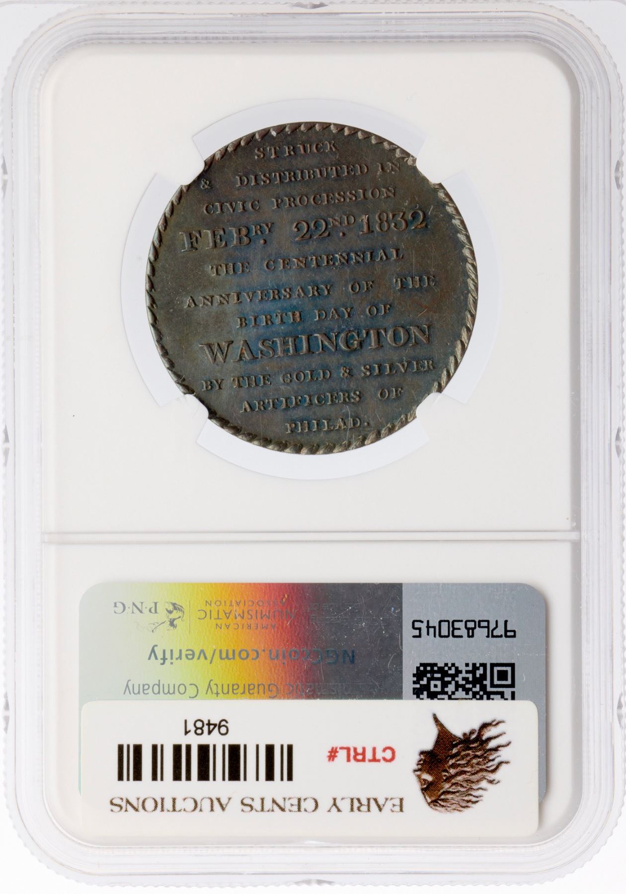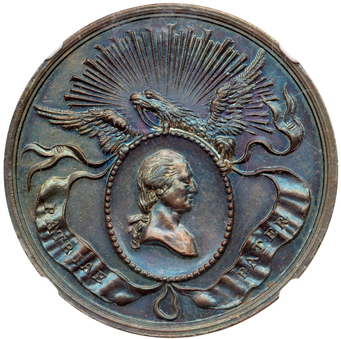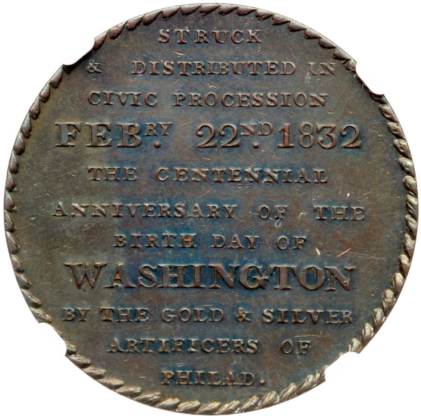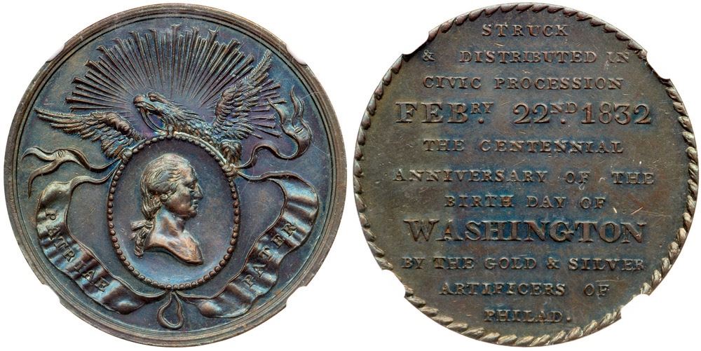 Glossy chocolate and olive browns with iridescent blue and violet toning on both sides. Free of notable marks, with hints of frosty luster remaining in some protected areas. Centennial of George Washington Philadelphia Civi Procession medal. 32mm. Our grade is MS60.