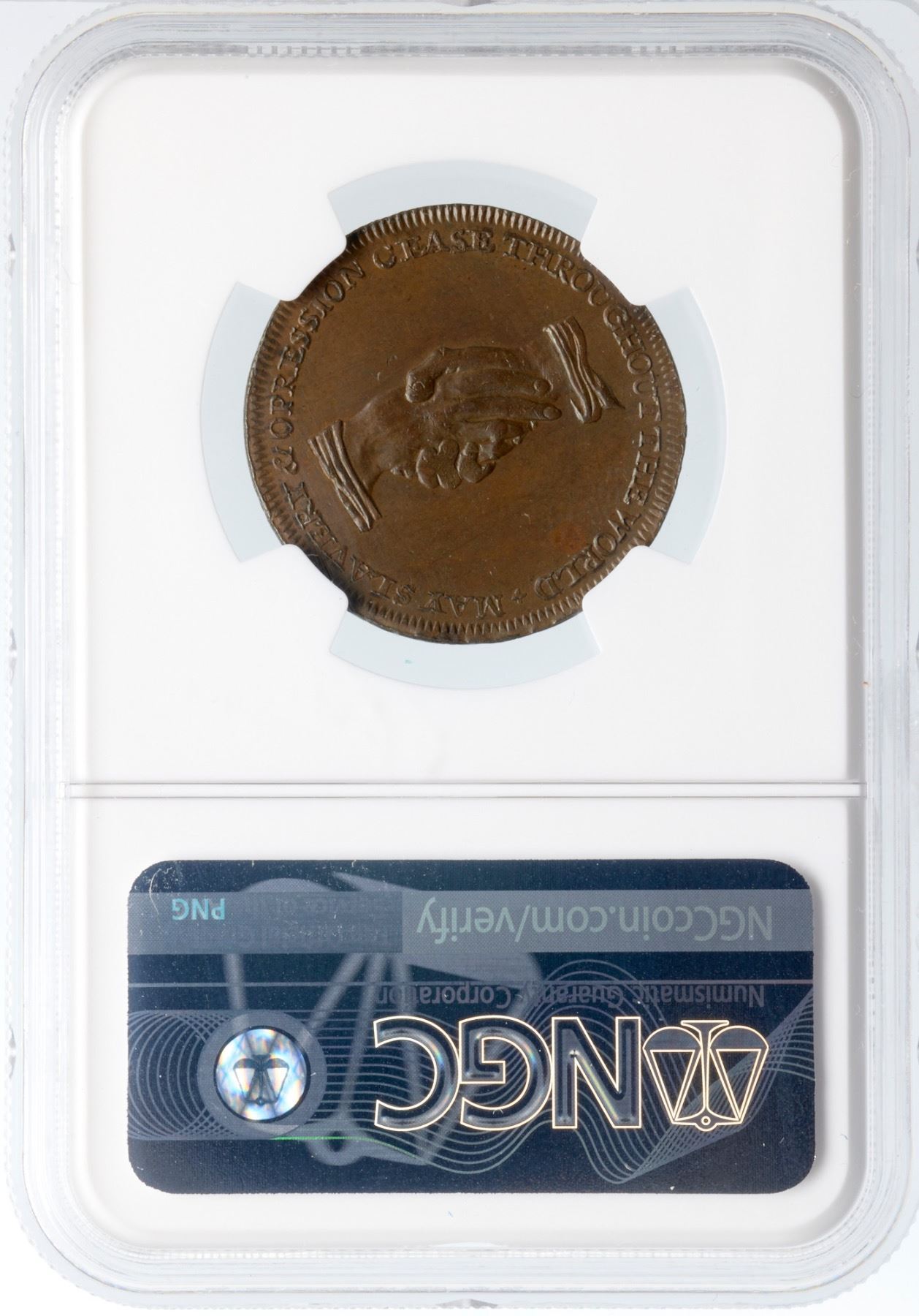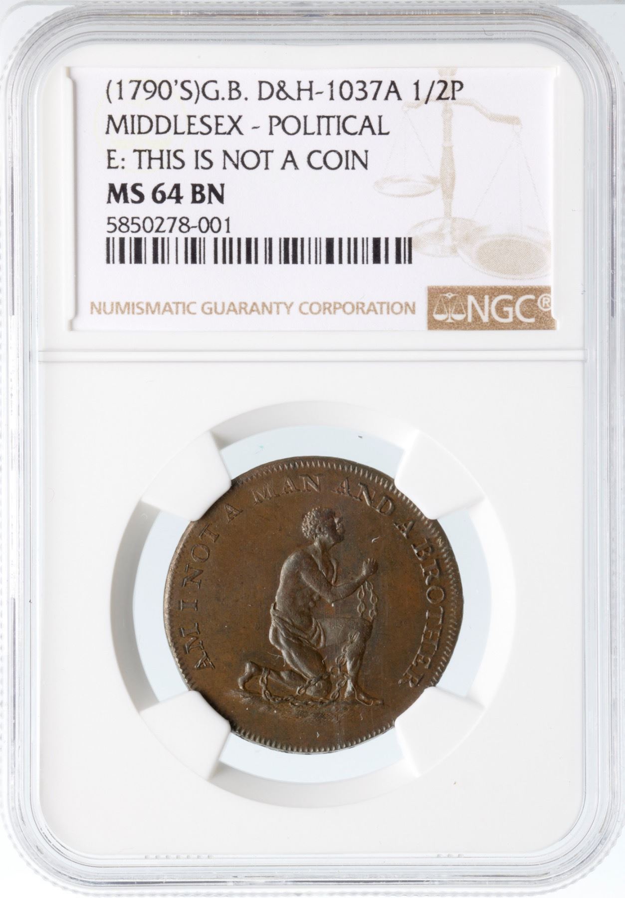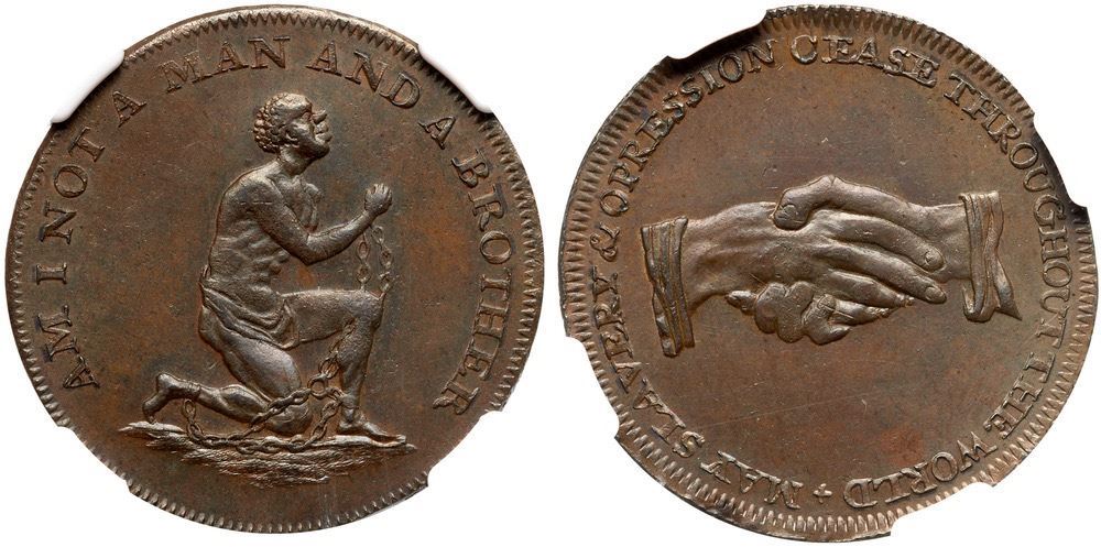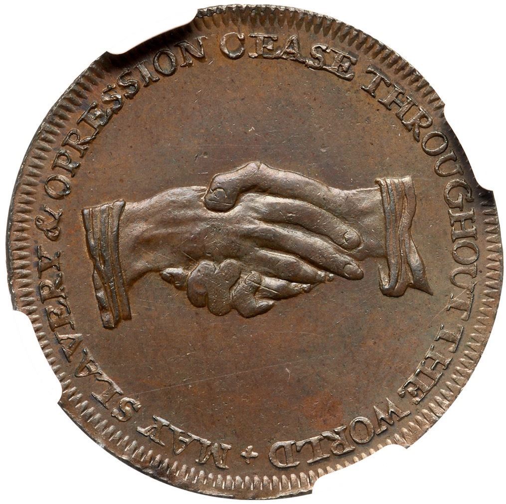 Lustrous medium brown and light olive with subtle overtones of light bluish steel. Satiny and choice. A premium example of the popular anti-slavery issue with a man in chains. A British version of the extremely rare HT-82, Low-54A, that has a similar obverse. 5850278-001 Ex Colonel Steven K. Ellsworth